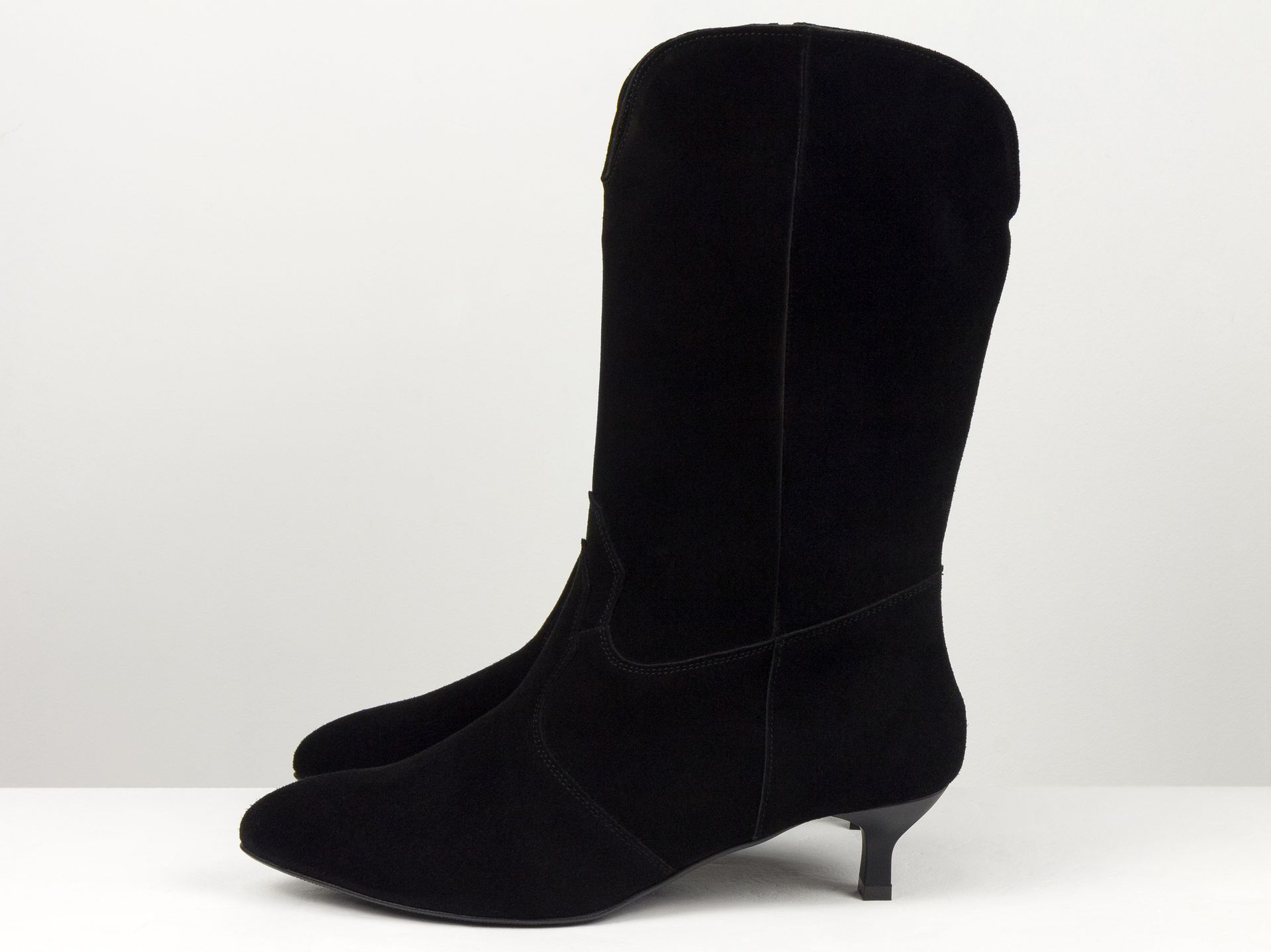 Высокие казаки черного цвета из натуральной замши на невысоким каблуке Gino Figini