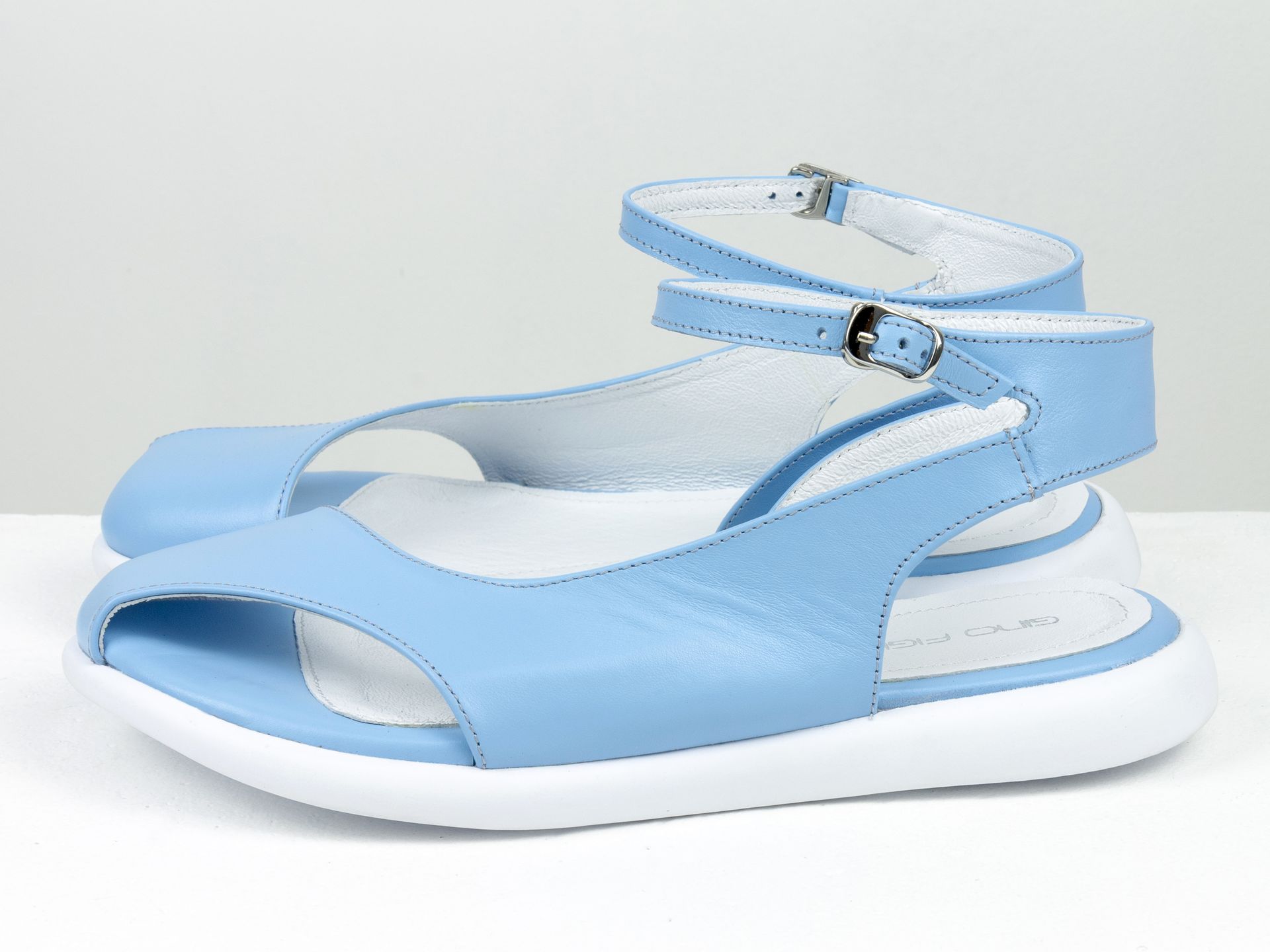Дизайнерские женские босоножки с ремешком на облегченной подошве из натуральной кожи голубого цвета Gino Figini