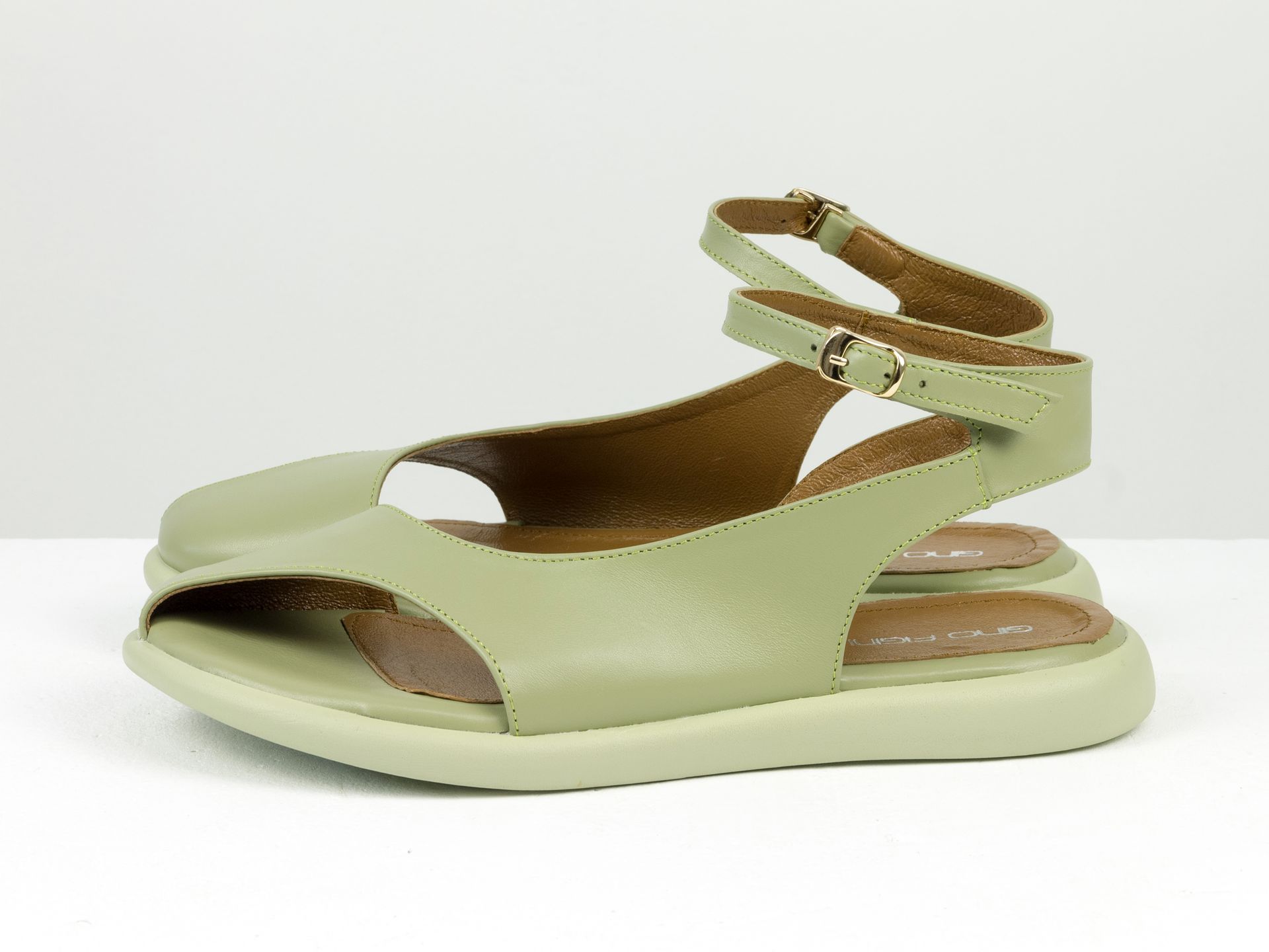 Дизайнерские женские босоножки с ремешком на облегченной подошве из натуральной кожи оливкового цвета Gino Figini