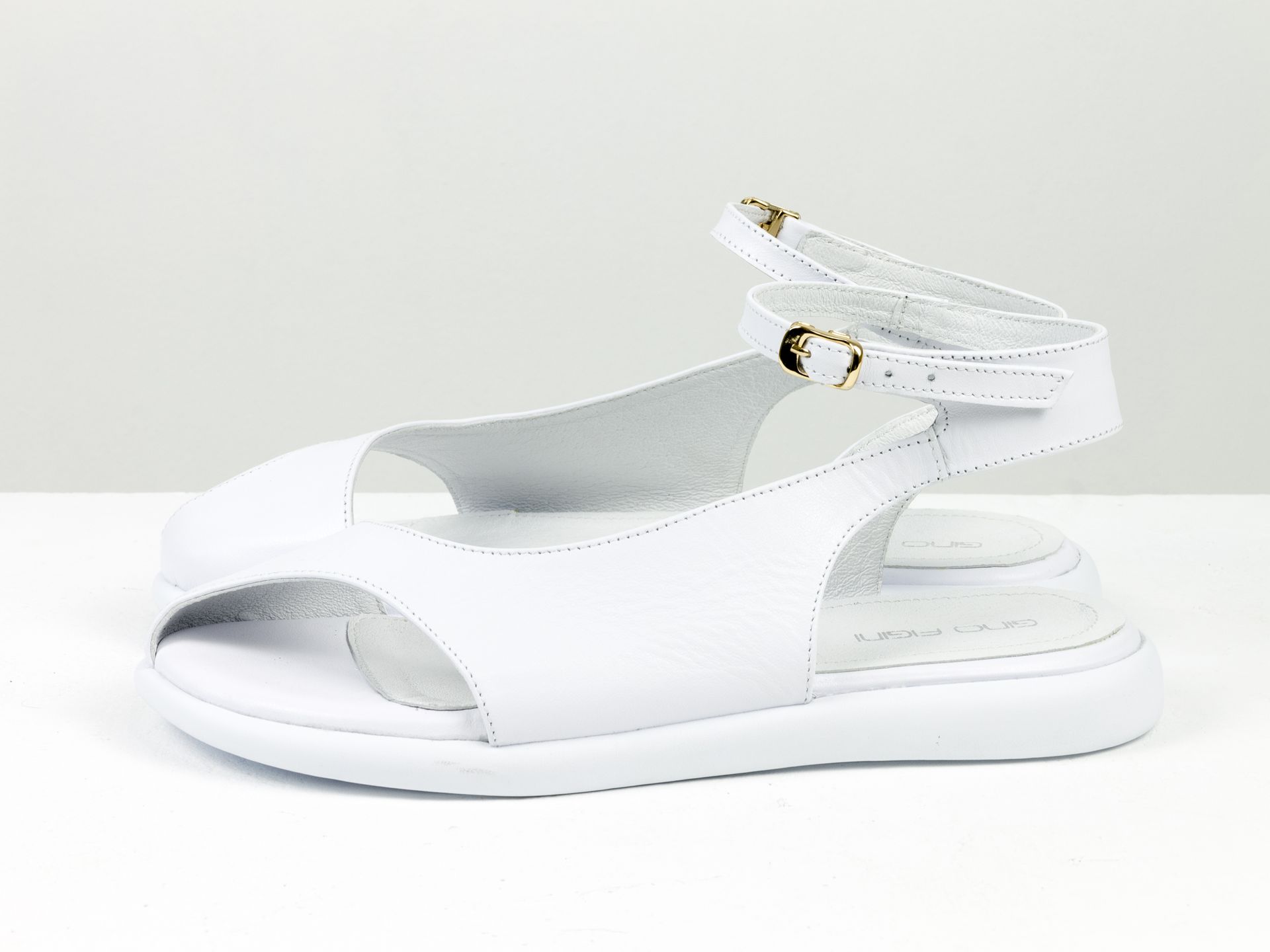 Дизайнерские женские босоножки с ремешком на облегченной подошве из натуральной кожи белого цвета Gino Figini