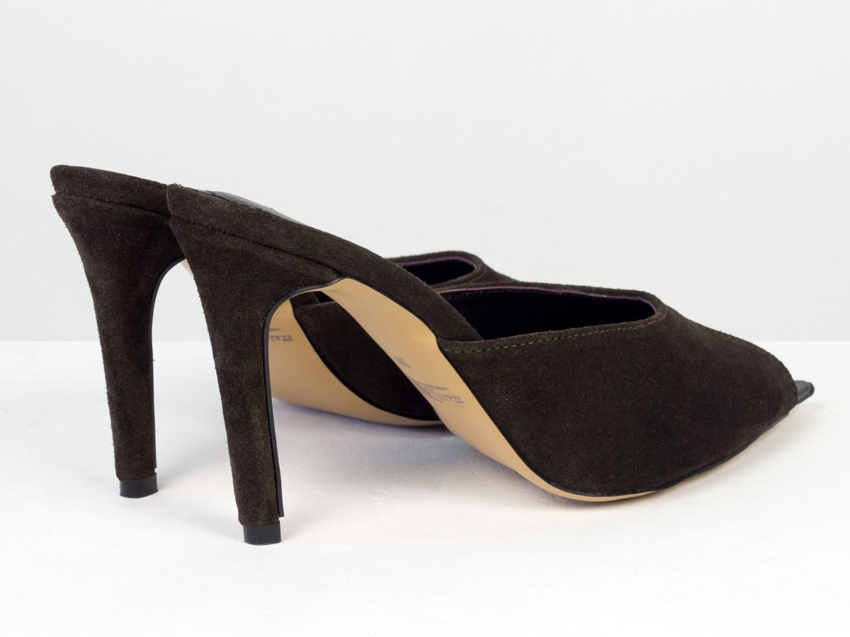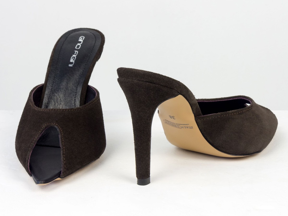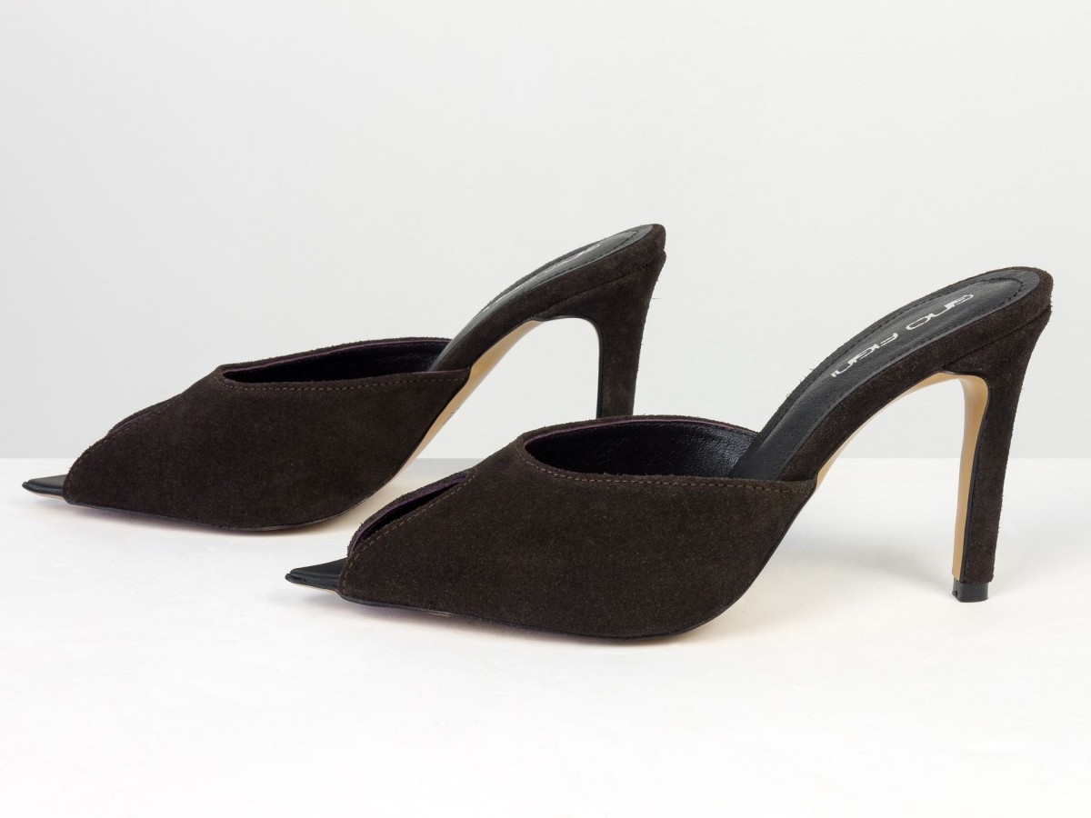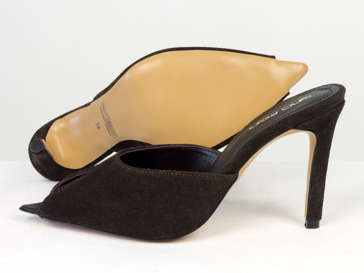 Эффектные мюли, которые сразу привлекают внимание. Модель выполнена из натуральной замши теплого коричневого оттенка и дополнена контрастным носком из черной гладкой кожи — именно эта деталь делает эту пару особенно стильной и современной. Открытая пятка придает образу легкость, а изящный каблук визуально удлиняет силуэт и подчеркивает женственность.