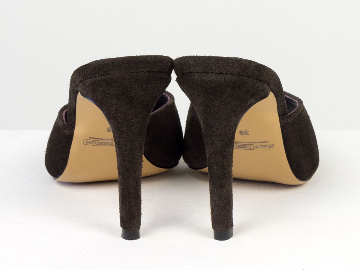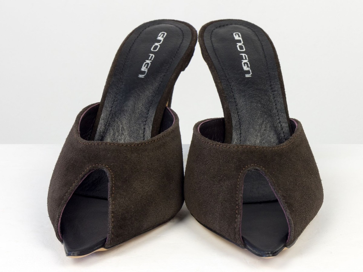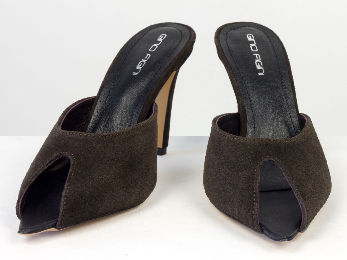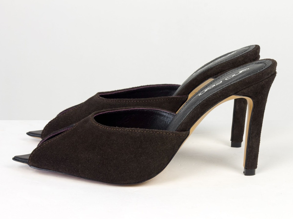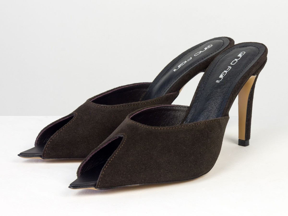 Эффектные мюли, которые сразу привлекают внимание. Модель выполнена из натуральной замши теплого коричневого оттенка и дополнена контрастным носком из черной гладкой кожи — именно эта деталь делает эту пару особенно стильной и современной. Открытая пятка придает образу легкость, а изящный каблук визуально удлиняет силуэт и подчеркивает женственность.