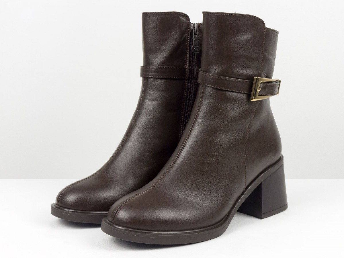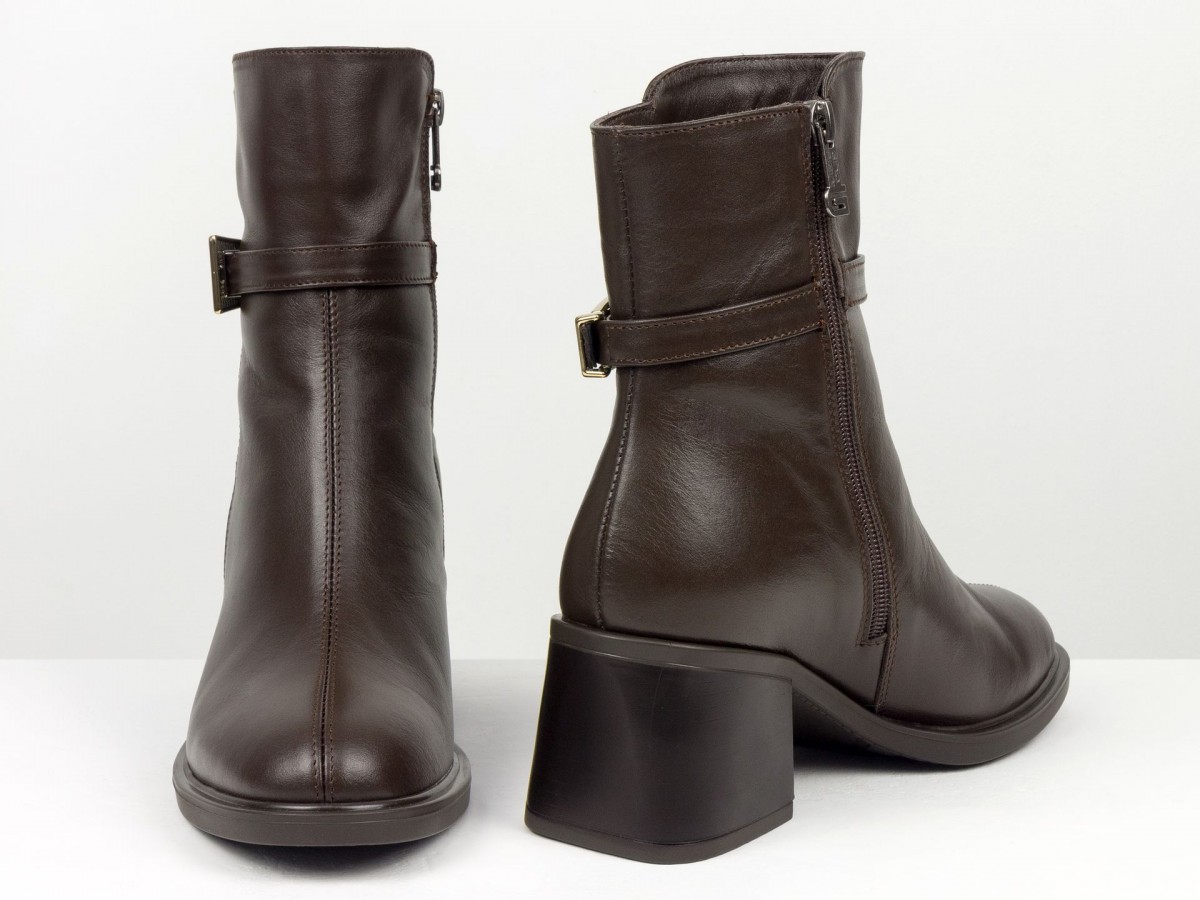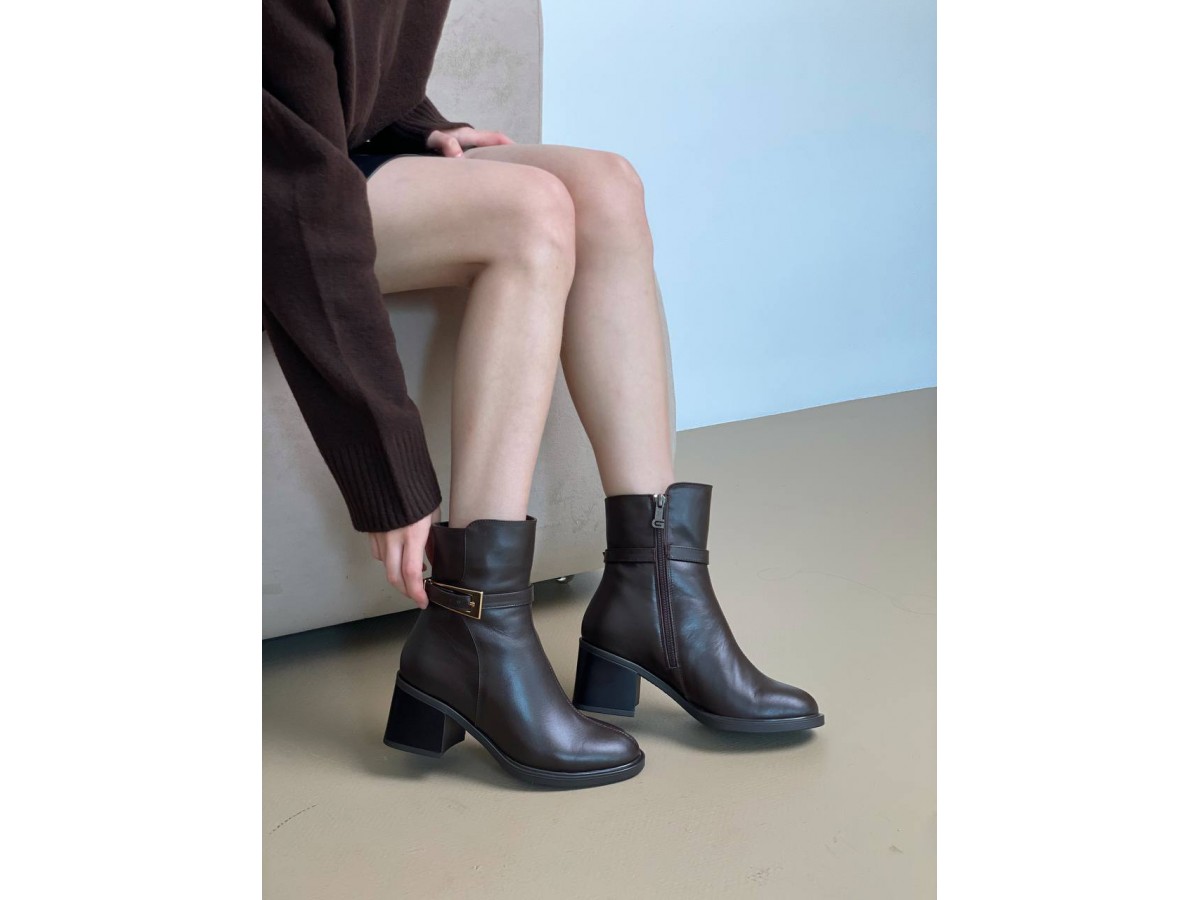 Стильные женские ботинки из новой коллекции, изготовленные из натуральной кожи насыщенного шоколадного оттенка. Модель на удобном широком каблуке средней высоты сочетает комфорт и элегантность. Функциональная молния обеспечивает легкую обувку, а декоративная металлическая пряжка золотистого цвета добавляет изысканности образу.