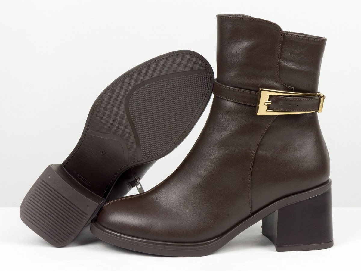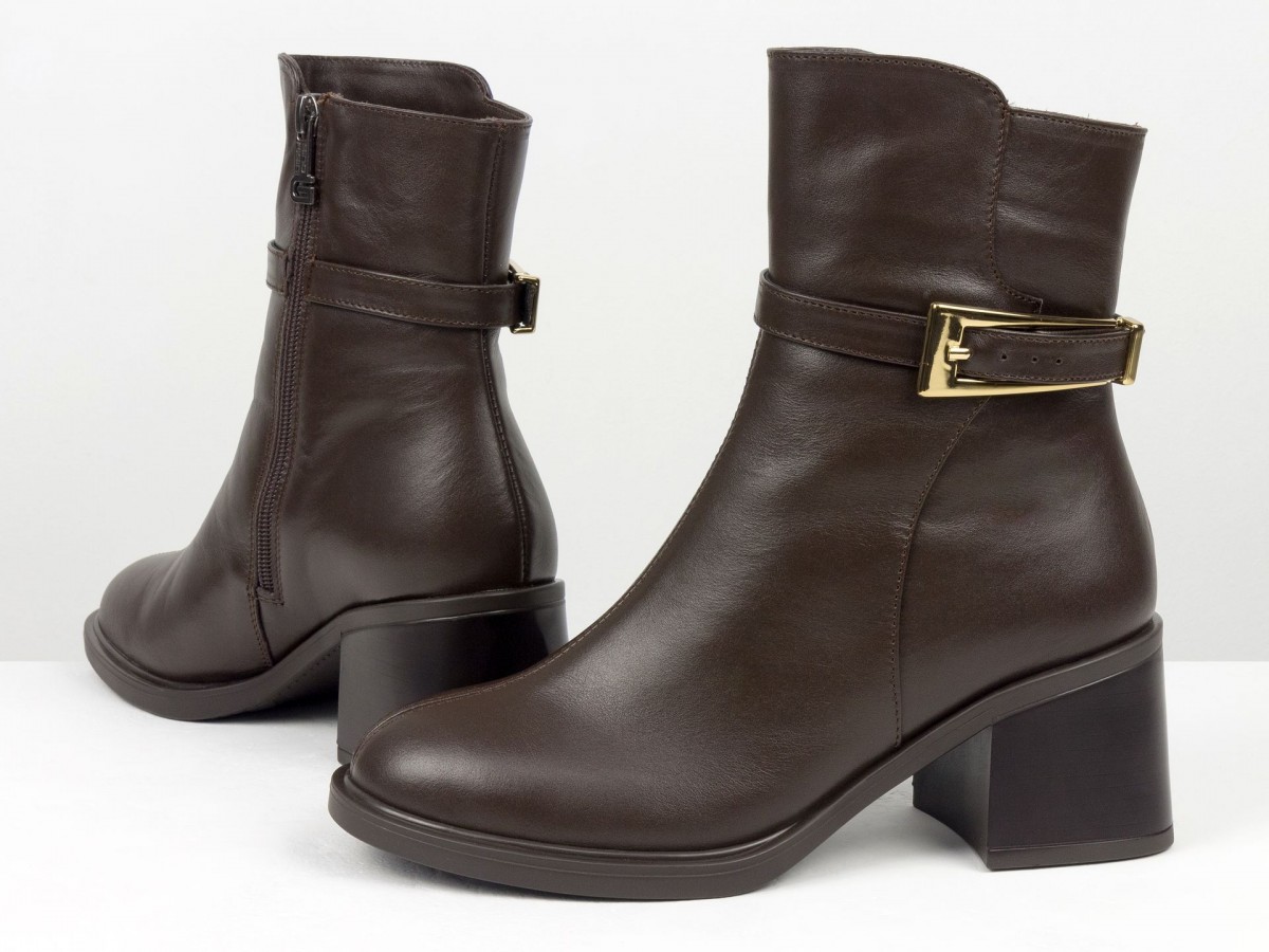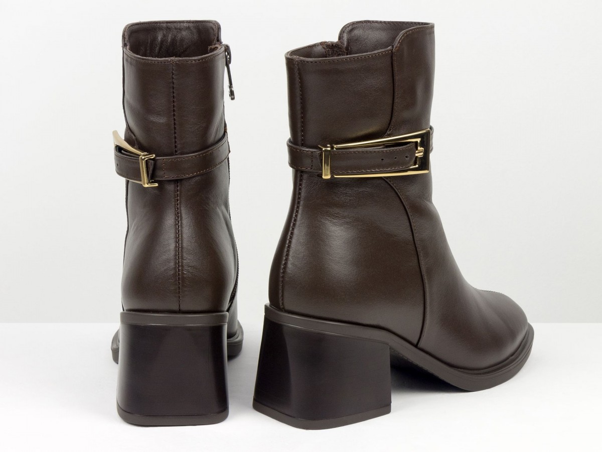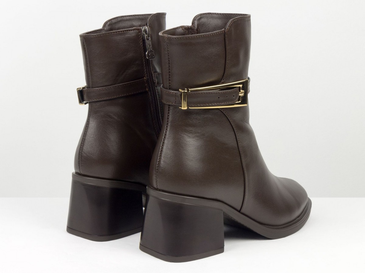 Стильные женские ботинки из новой коллекции, изготовленные из натуральной кожи насыщенного шоколадного оттенка. Модель на удобном широком каблуке средней высоты сочетает комфорт и элегантность. Функциональная молния обеспечивает легкую обувку, а декоративная металлическая пряжка золотистого цвета добавляет изысканности образу.