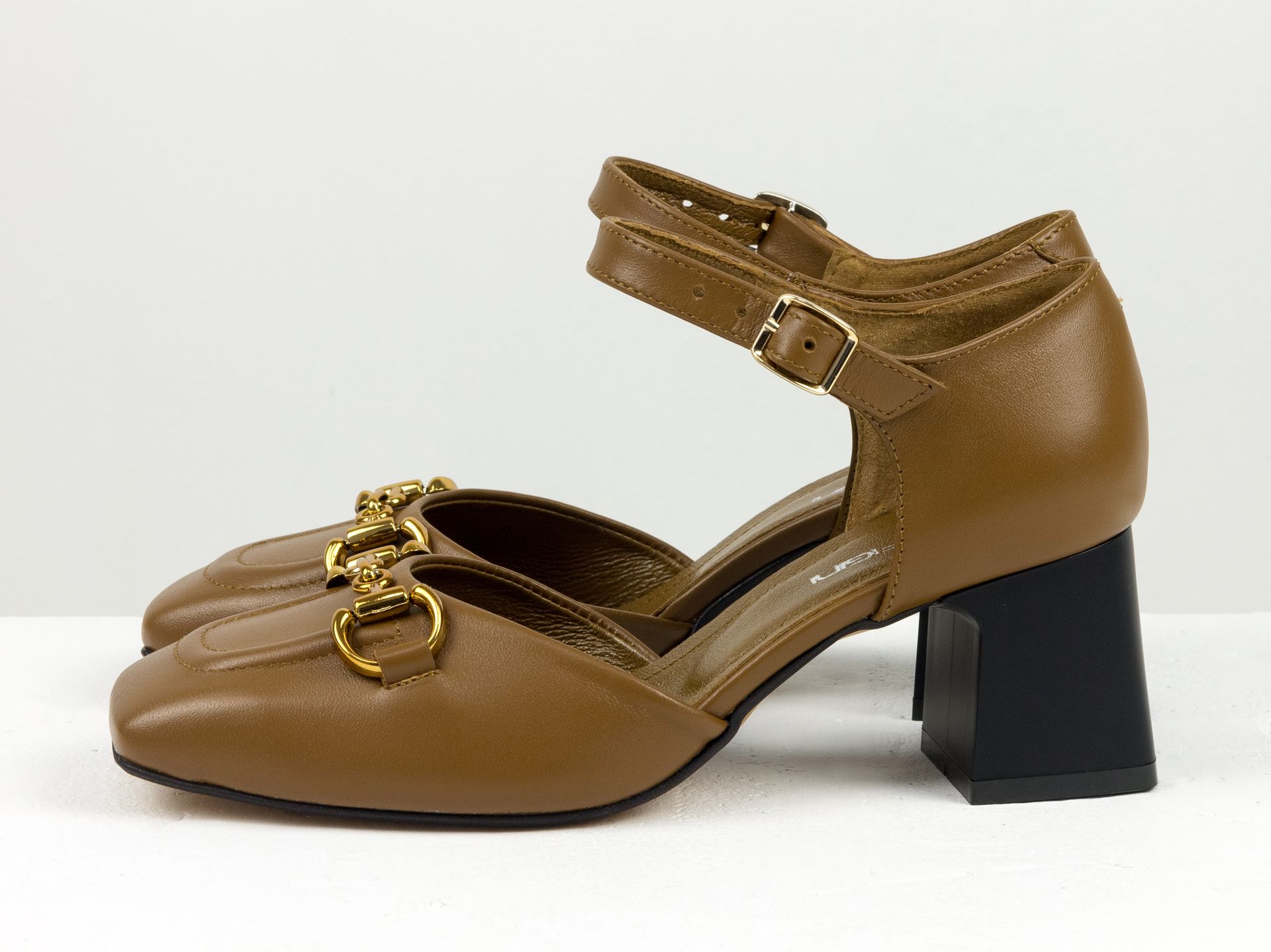Дизайнерські босоніжки на невисокому підборі з натуральної італійської шкіри карамельного кольору із золотою фурнітурою Gino Figini