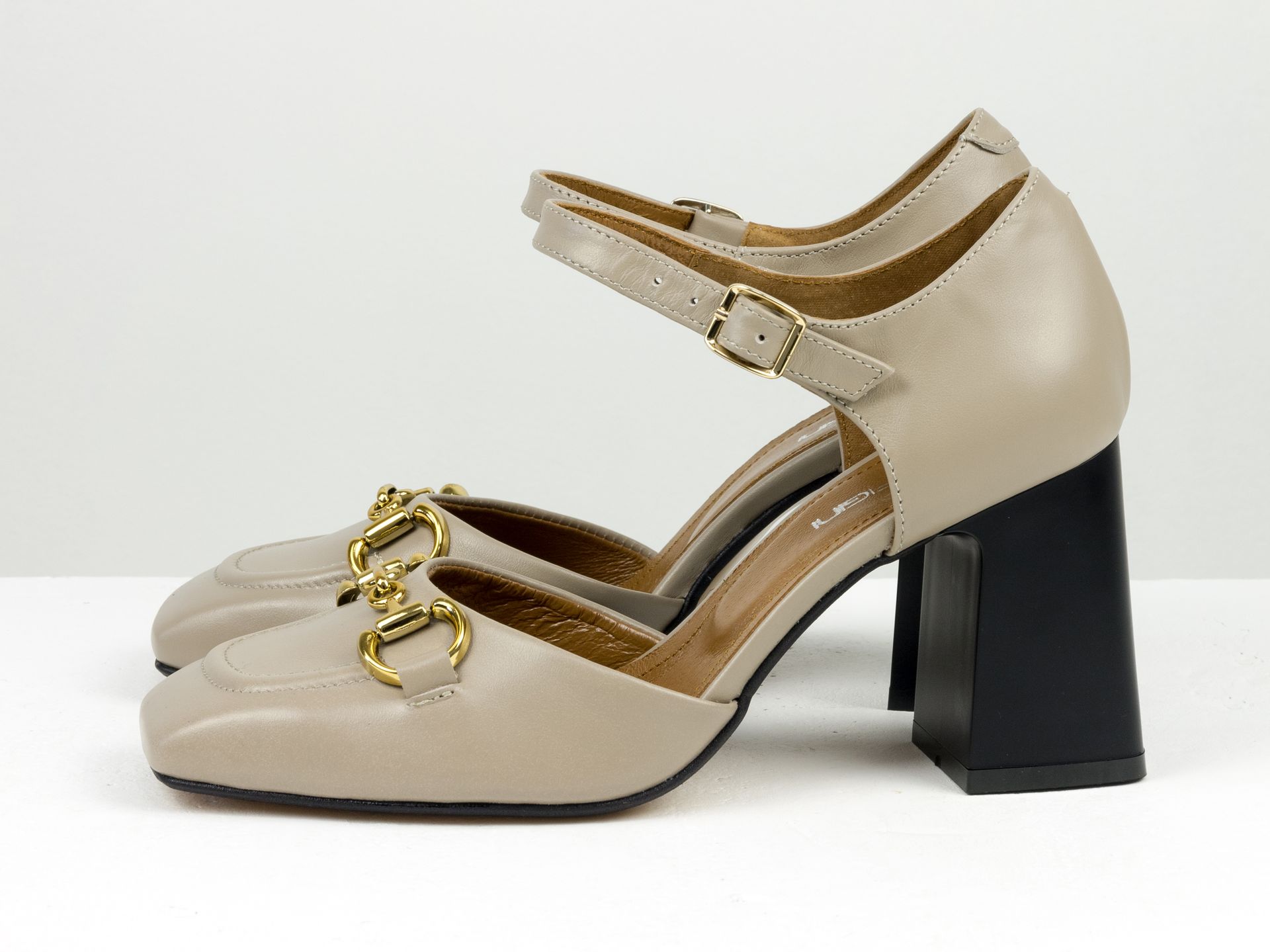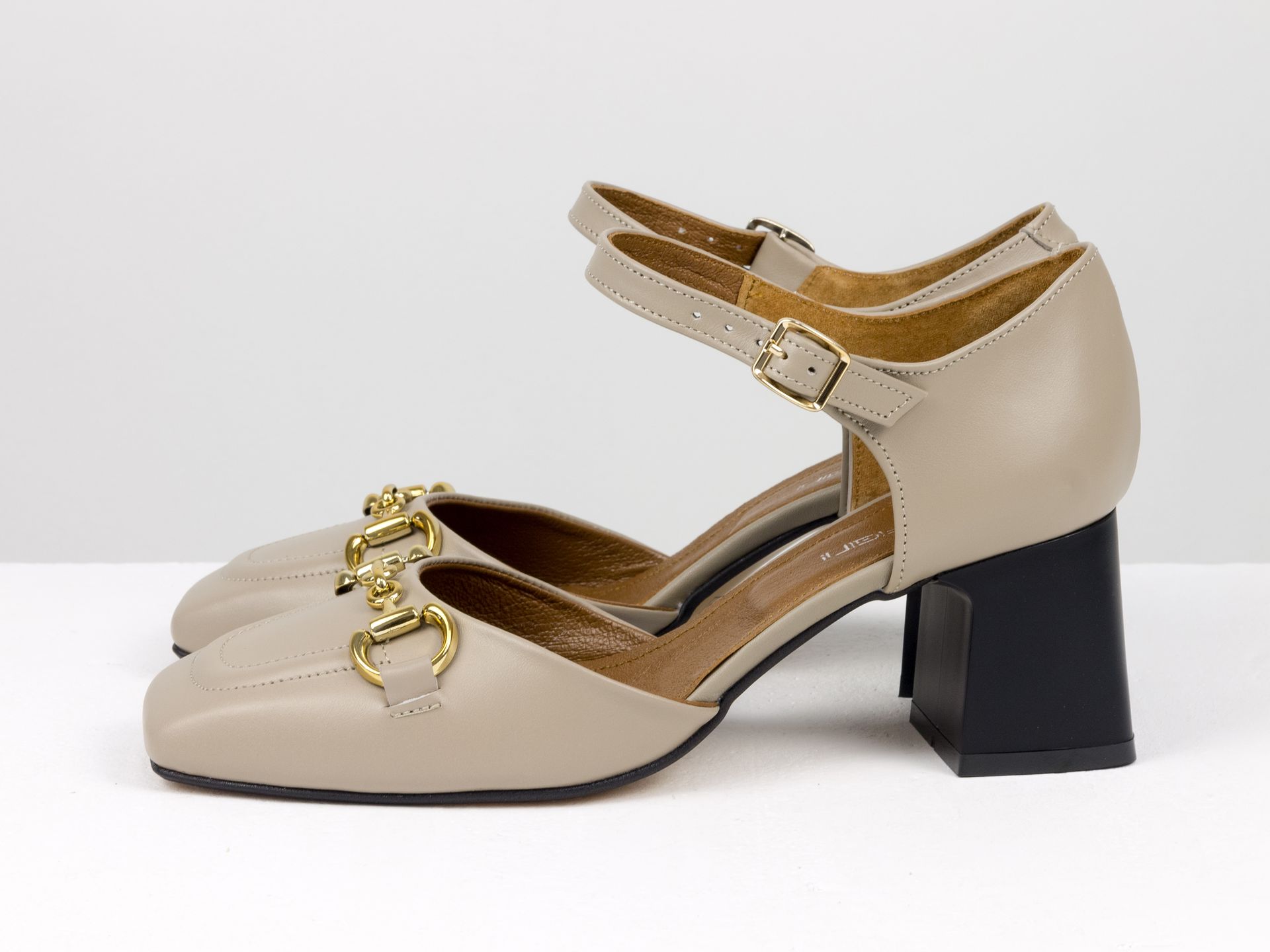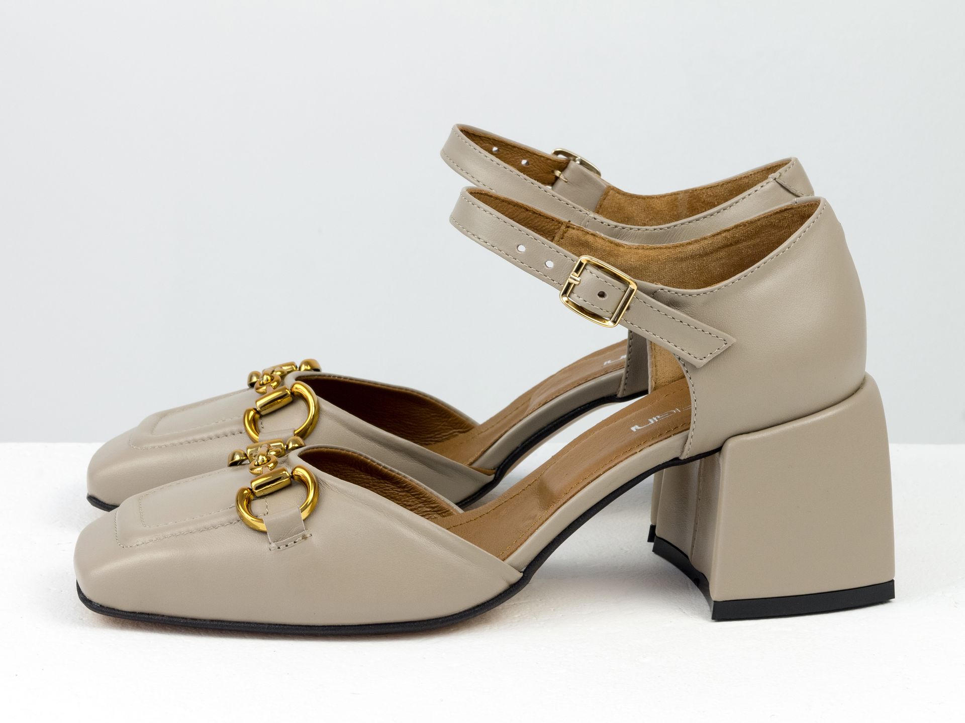 Дизайнерські бежеві босоніжки на стійкому підборі з натуральної італійської шкіри із золотою фурнітурою Gino Figini