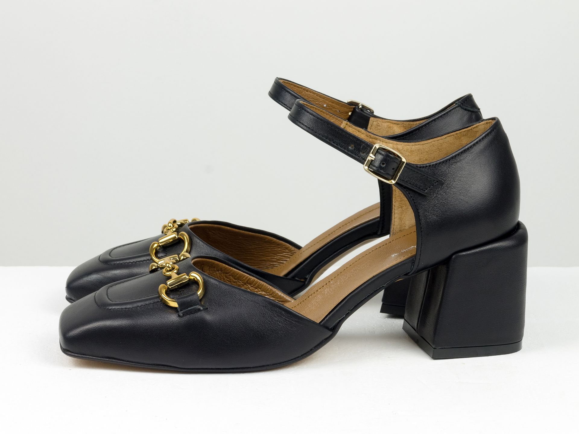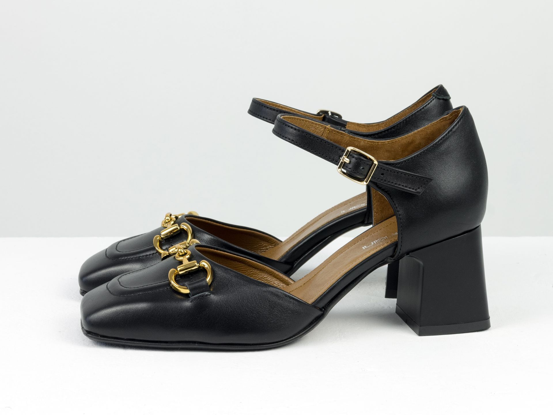 Дизайнерські босоніжки на невисокому обтяжному підборі з натуральної італійської шкіри чорного кольору із золотою фурнітурою Gino Figini