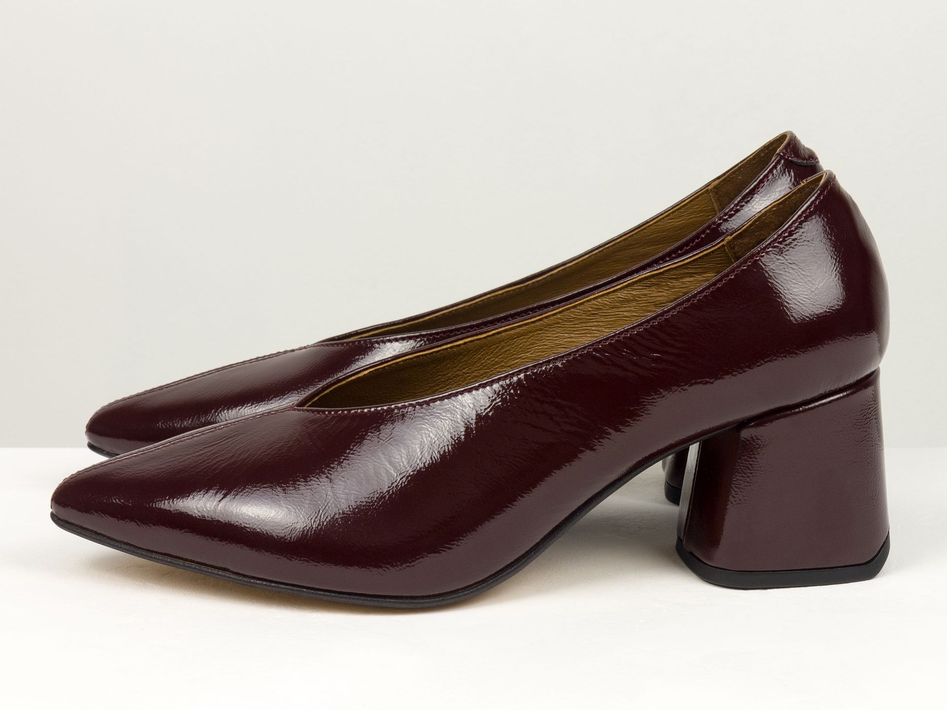 Дизайнерські туфлі-рукавички на невисокому обтяжному підборі з натуральної лакованої італійської шкіри бордового кольору Gino Figini