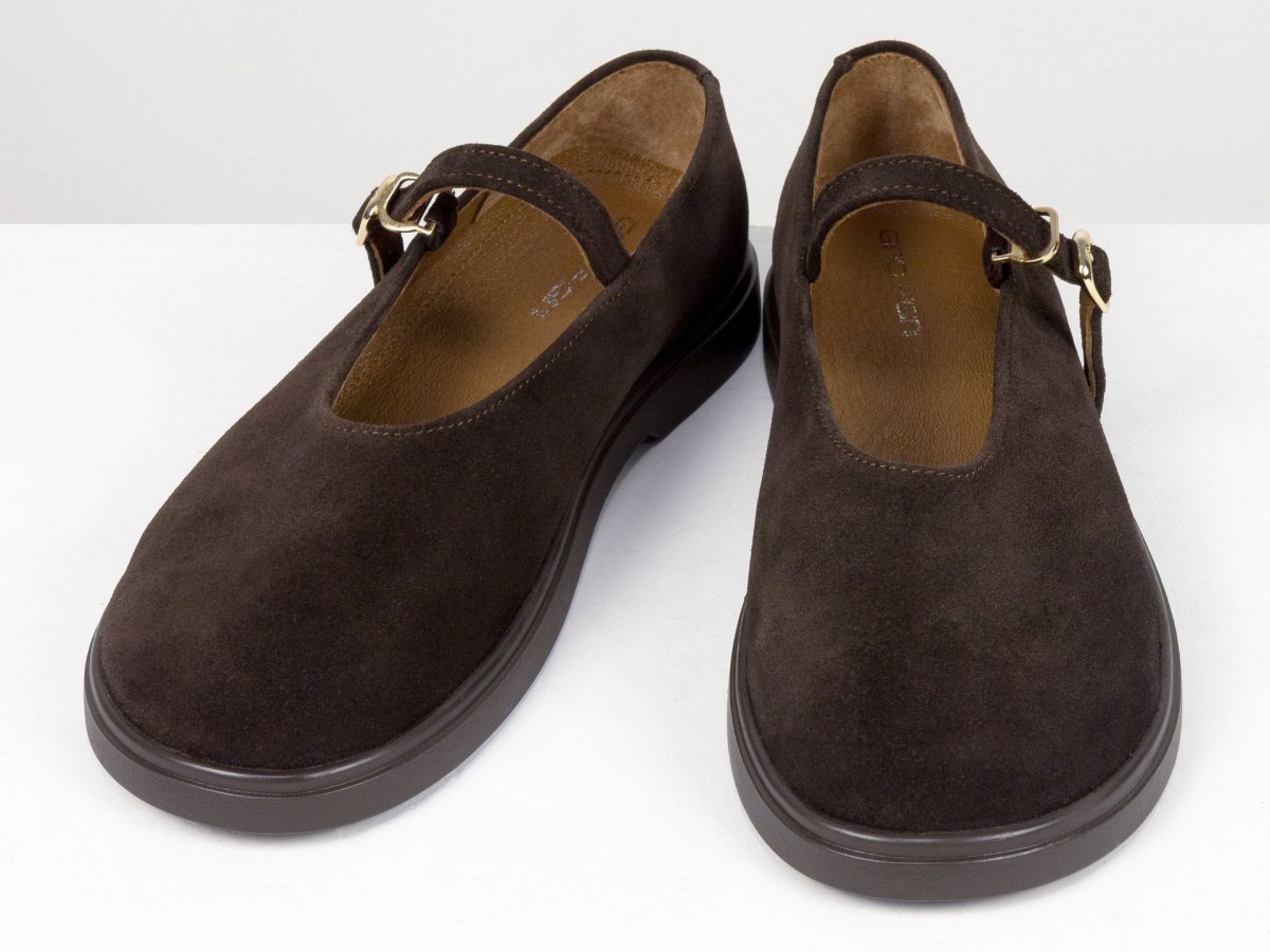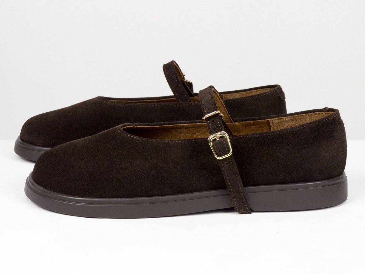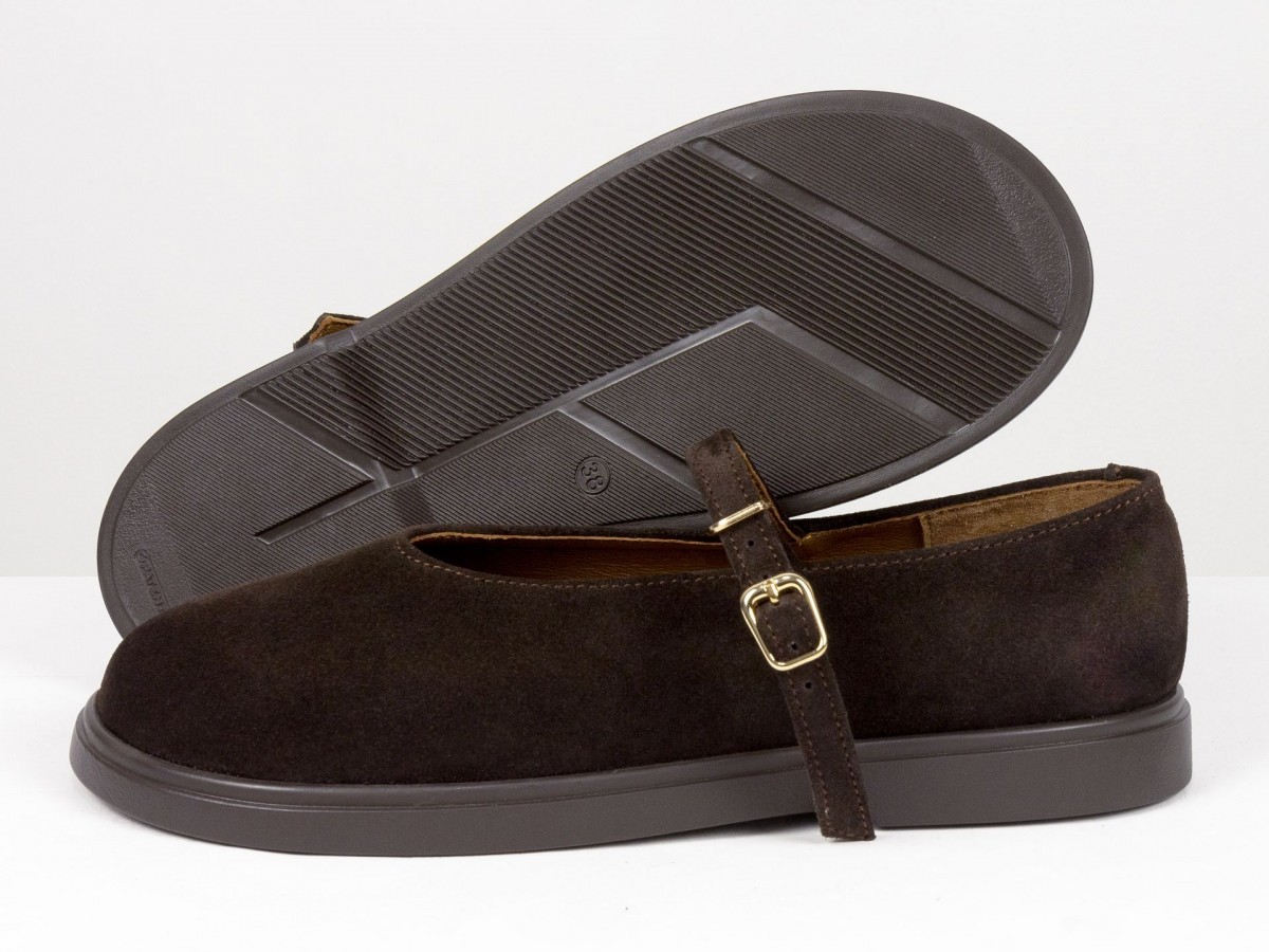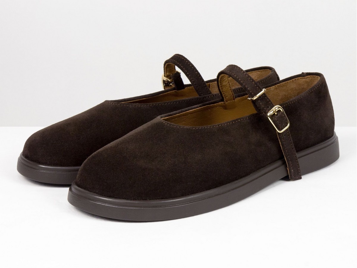 Стильные замшевые балетки в классическом исполнении Mary Jane с ремешком и золотой пряжкой. Натуральная замша мягко облегает стопу, выполнены на анатомическом колодке, создавая комфорт в течение всего дня. Легкая и гибкая подошва обеспечивает удобство при ходьбе, а универсальный коричневый оттенок легко сочетается как с джинсами, так и с платьями. Идеальный выбор для ежедневной носки и создания элегантных casual-образов.
