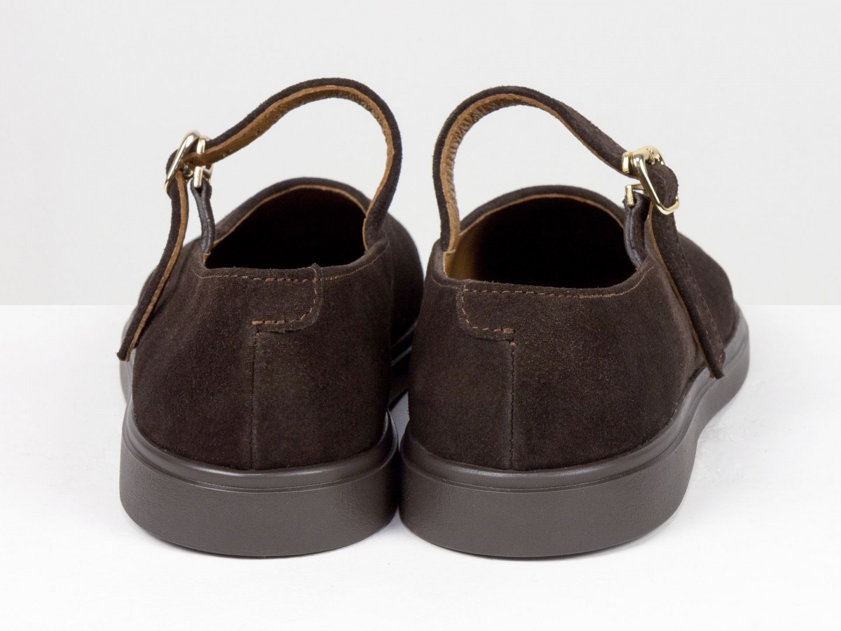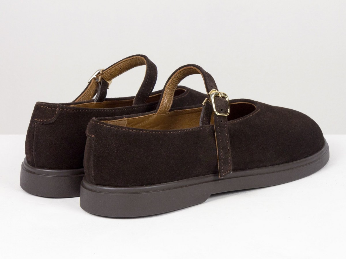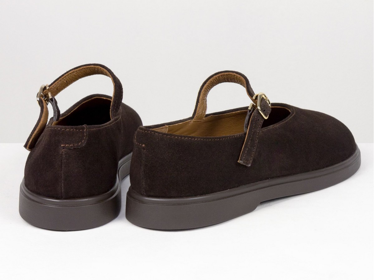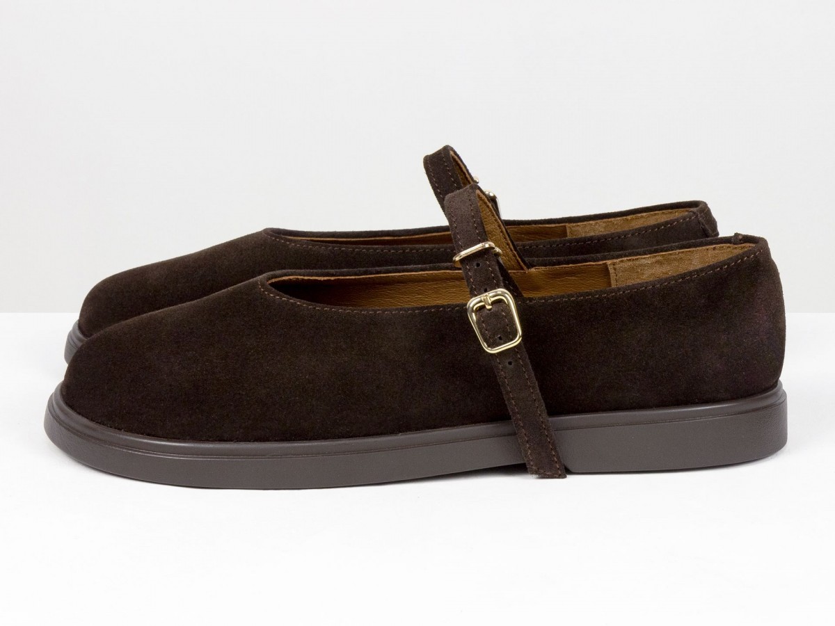 Стильные замшевые балетки в классическом исполнении Mary Jane с ремешком и золотой пряжкой. Натуральная замша мягко облегает стопу, выполнены на анатомическом колодке, создавая комфорт в течение всего дня. Легкая и гибкая подошва обеспечивает удобство при ходьбе, а универсальный коричневый оттенок легко сочетается как с джинсами, так и с платьями. Идеальный выбор для ежедневной носки и создания элегантных casual-образов.