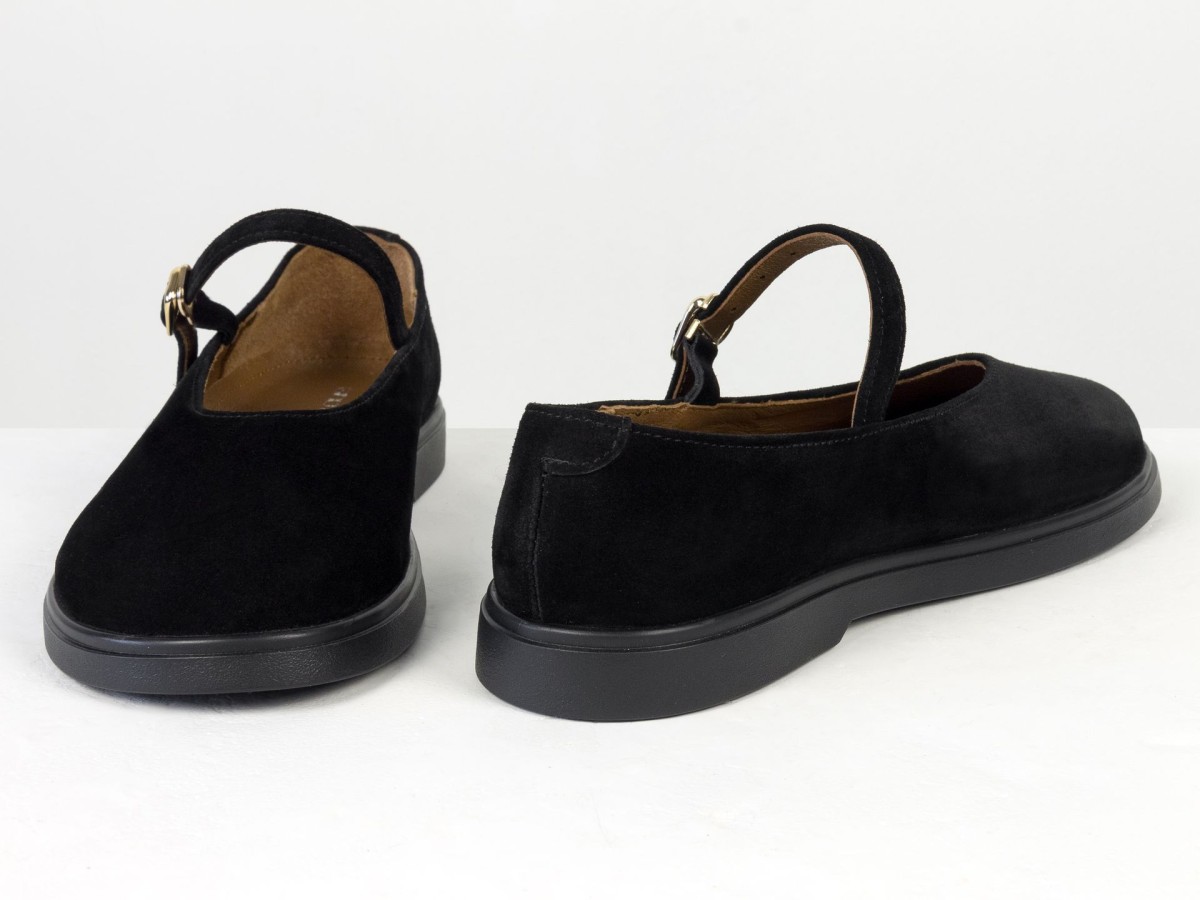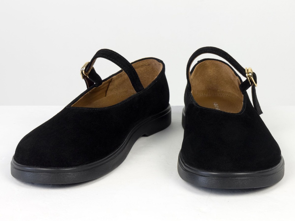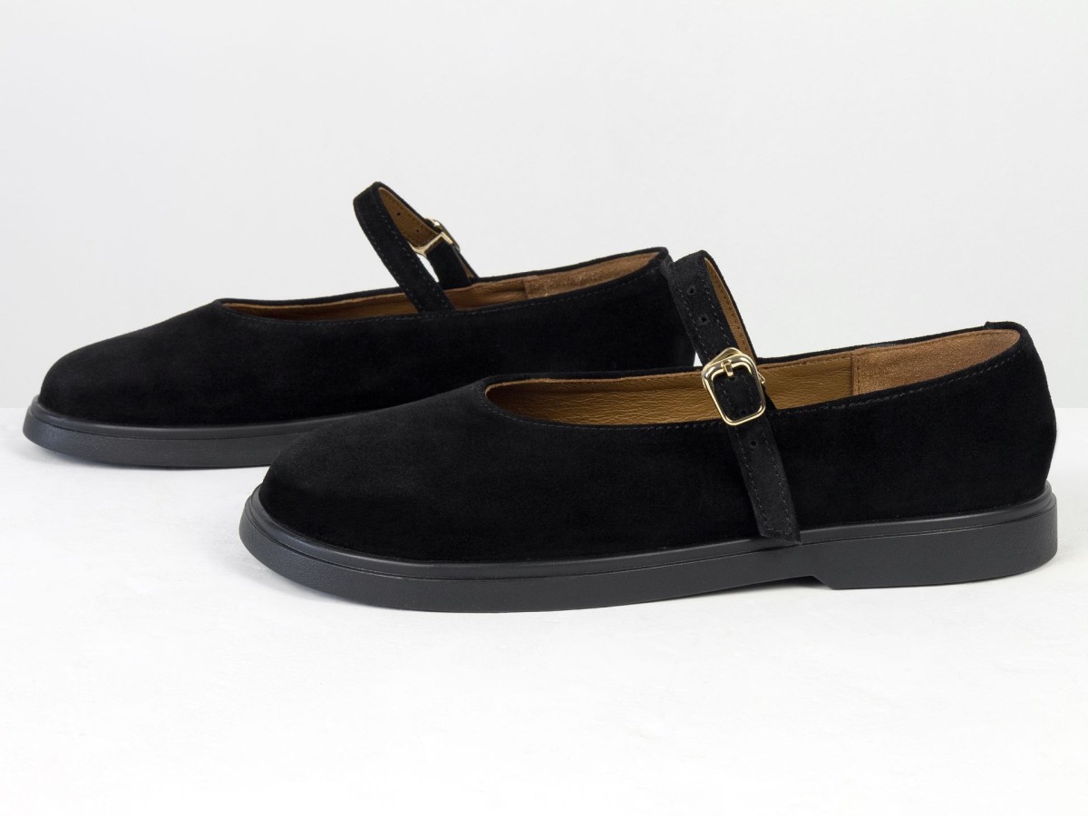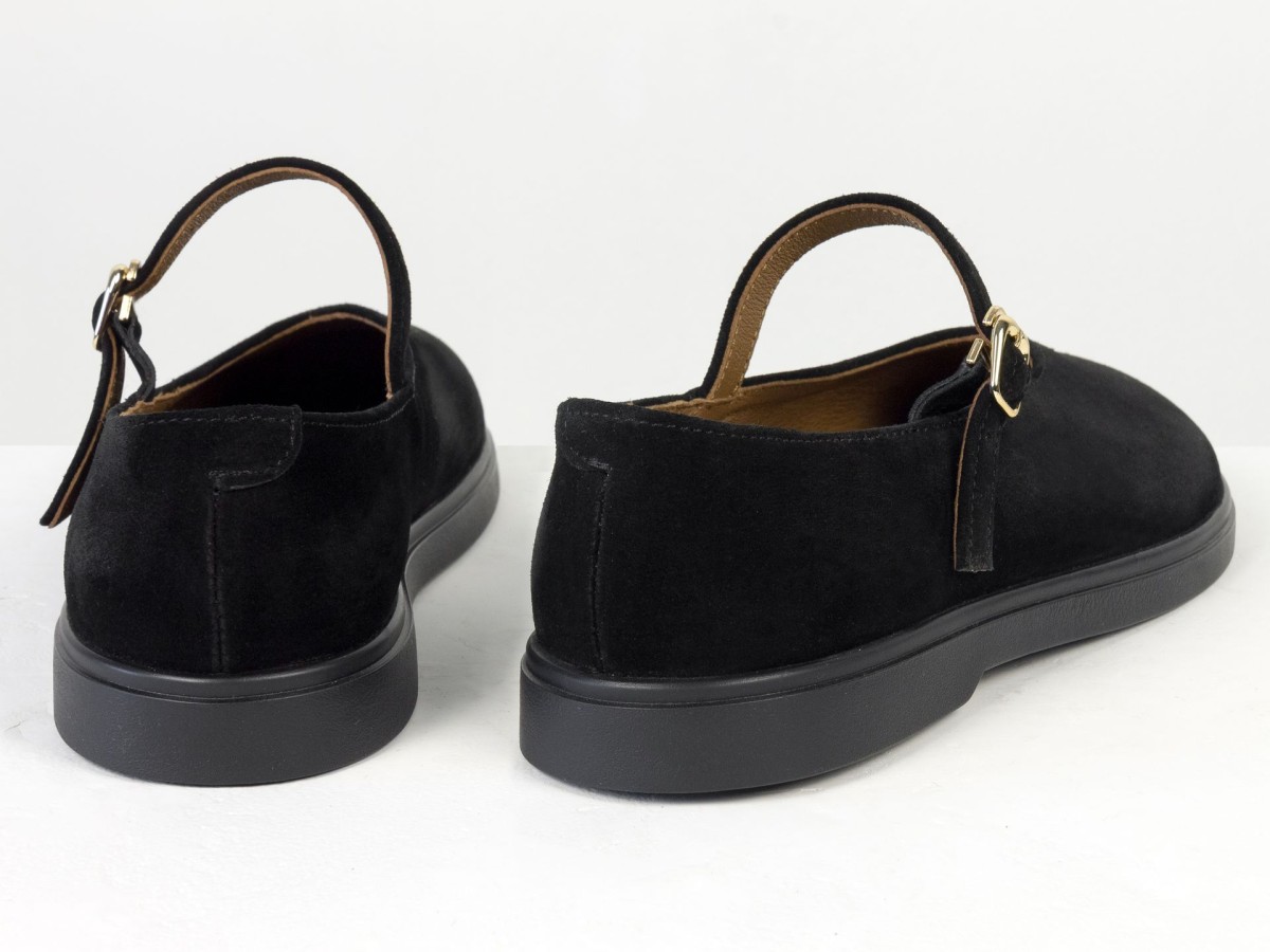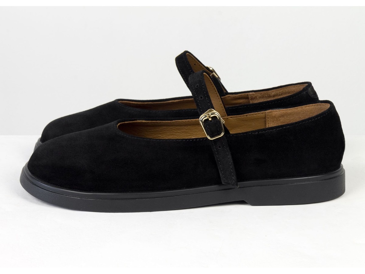 Стильні замшеві балетки у класичному виконанні Mary Jane з ремінцем і золотою пряжкою. Натуральна замша м’яко облягає стопу,виконані на анатомічній колодці, створюючи комфорт протягом усього дня. Легка та гнучка підошва забезпечує зручність під час ходьби, а універсальний чорний відтінок легко поєднується як із джинсами, так і з сукнями. Ідеальний вибір для щоденного носіння та створення елегантних casual-образів.