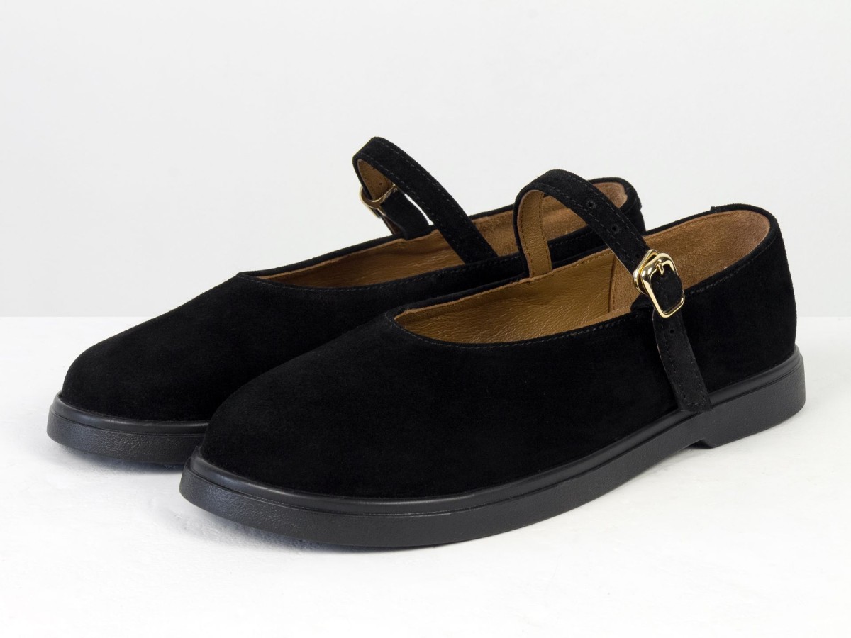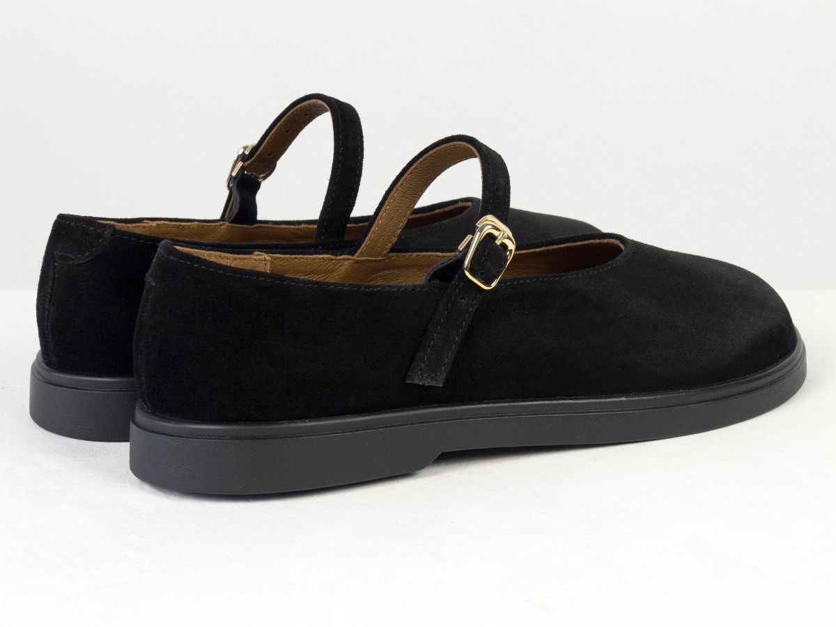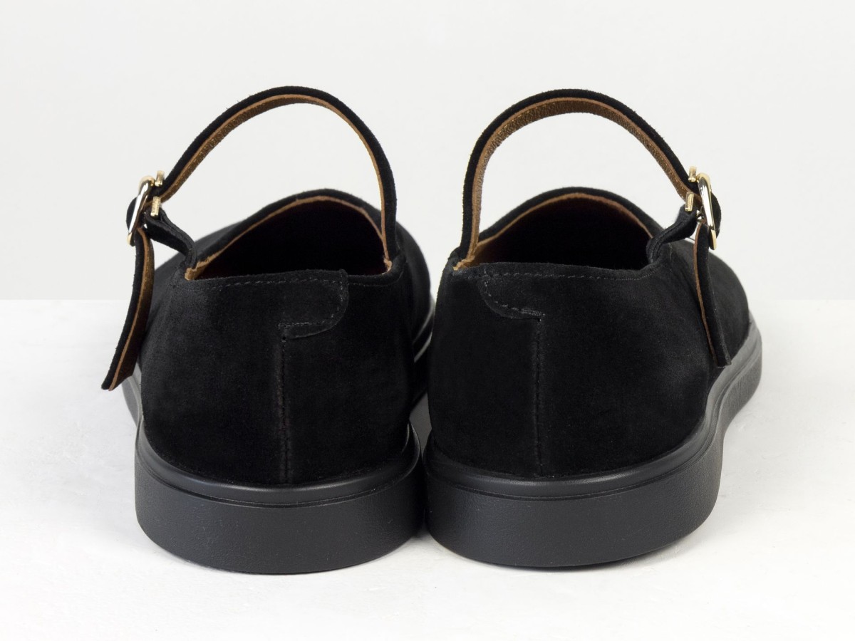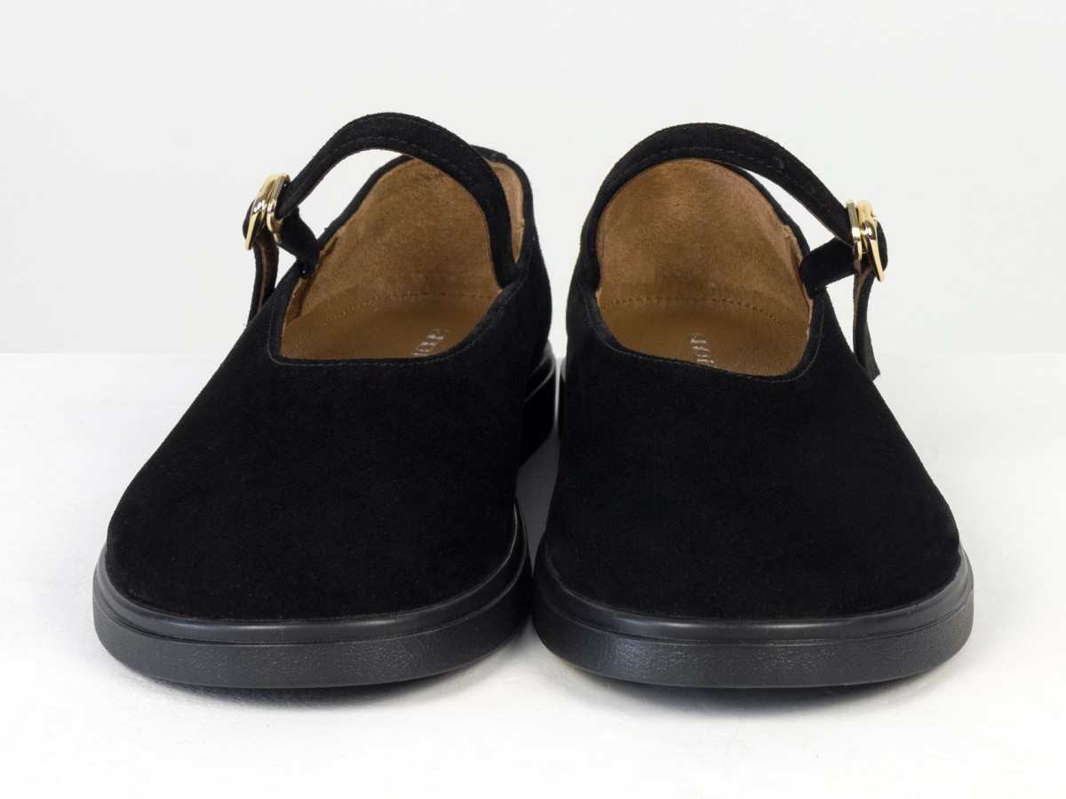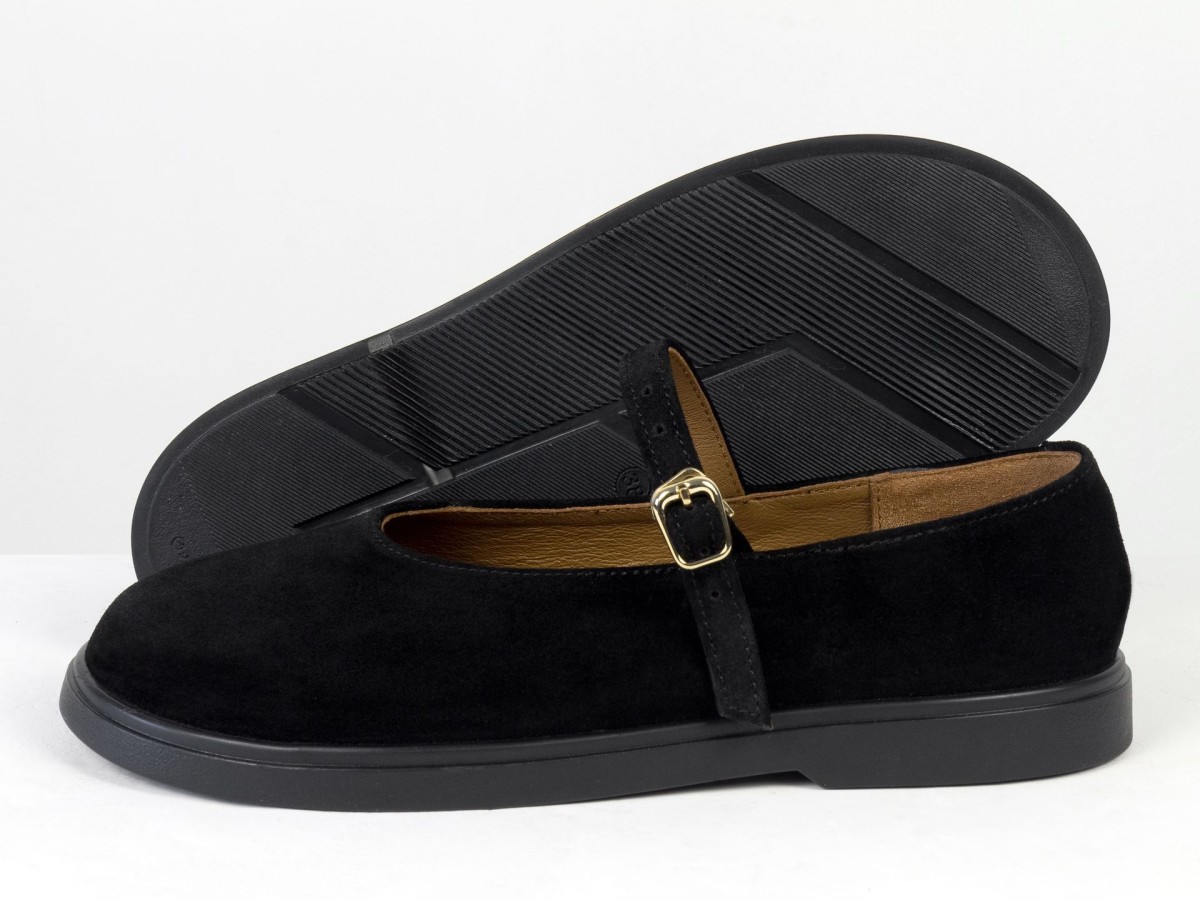 Стильні замшеві балетки у класичному виконанні Mary Jane з ремінцем і золотою пряжкою. Натуральна замша м’яко облягає стопу,виконані на анатомічній колодці, створюючи комфорт протягом усього дня. Легка та гнучка підошва забезпечує зручність під час ходьби, а універсальний чорний відтінок легко поєднується як із джинсами, так і з сукнями. Ідеальний вибір для щоденного носіння та створення елегантних casual-образів.