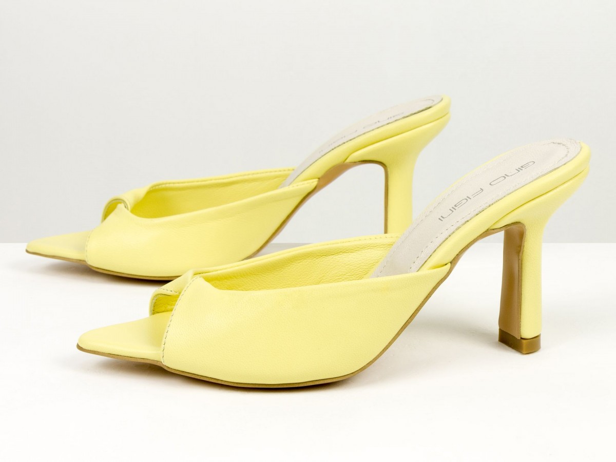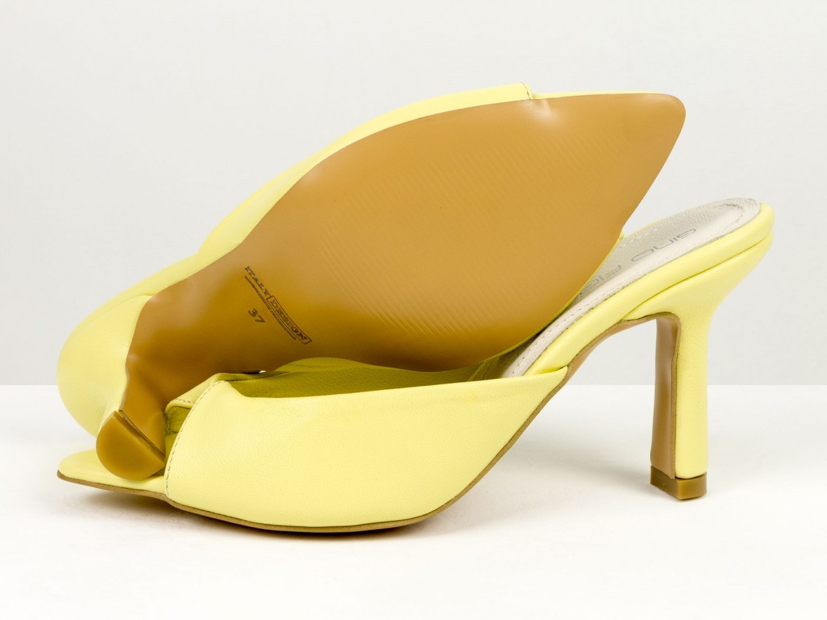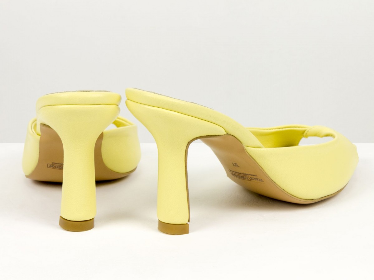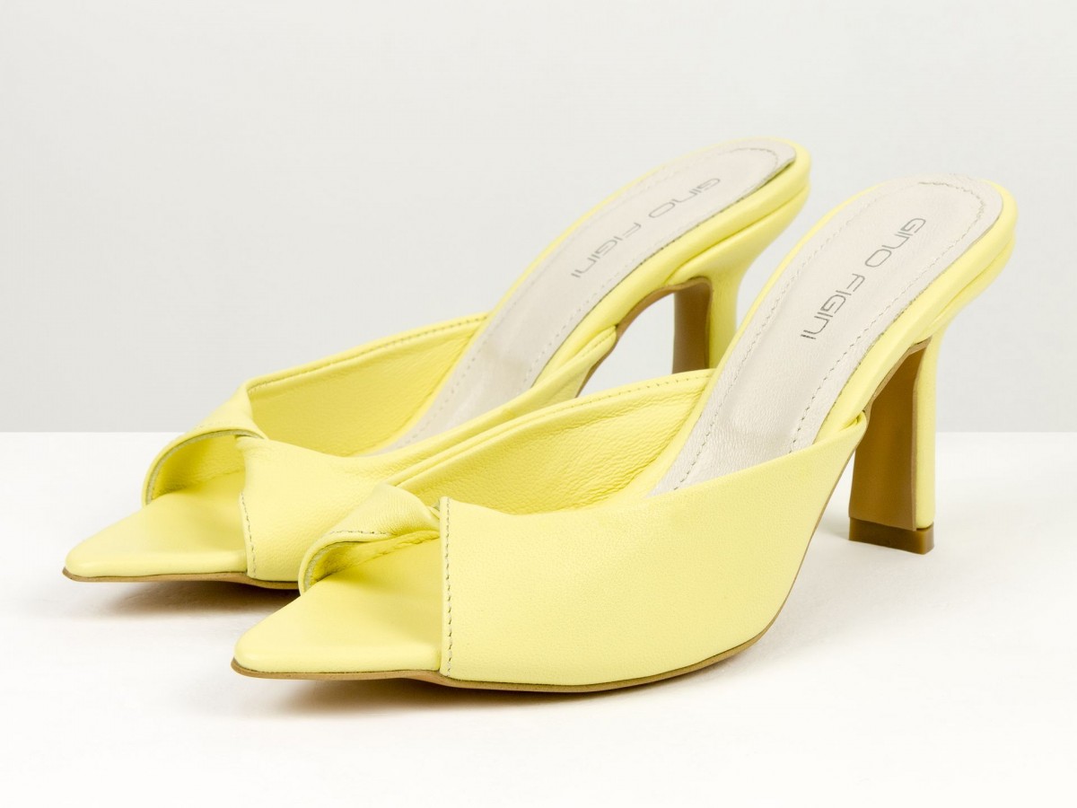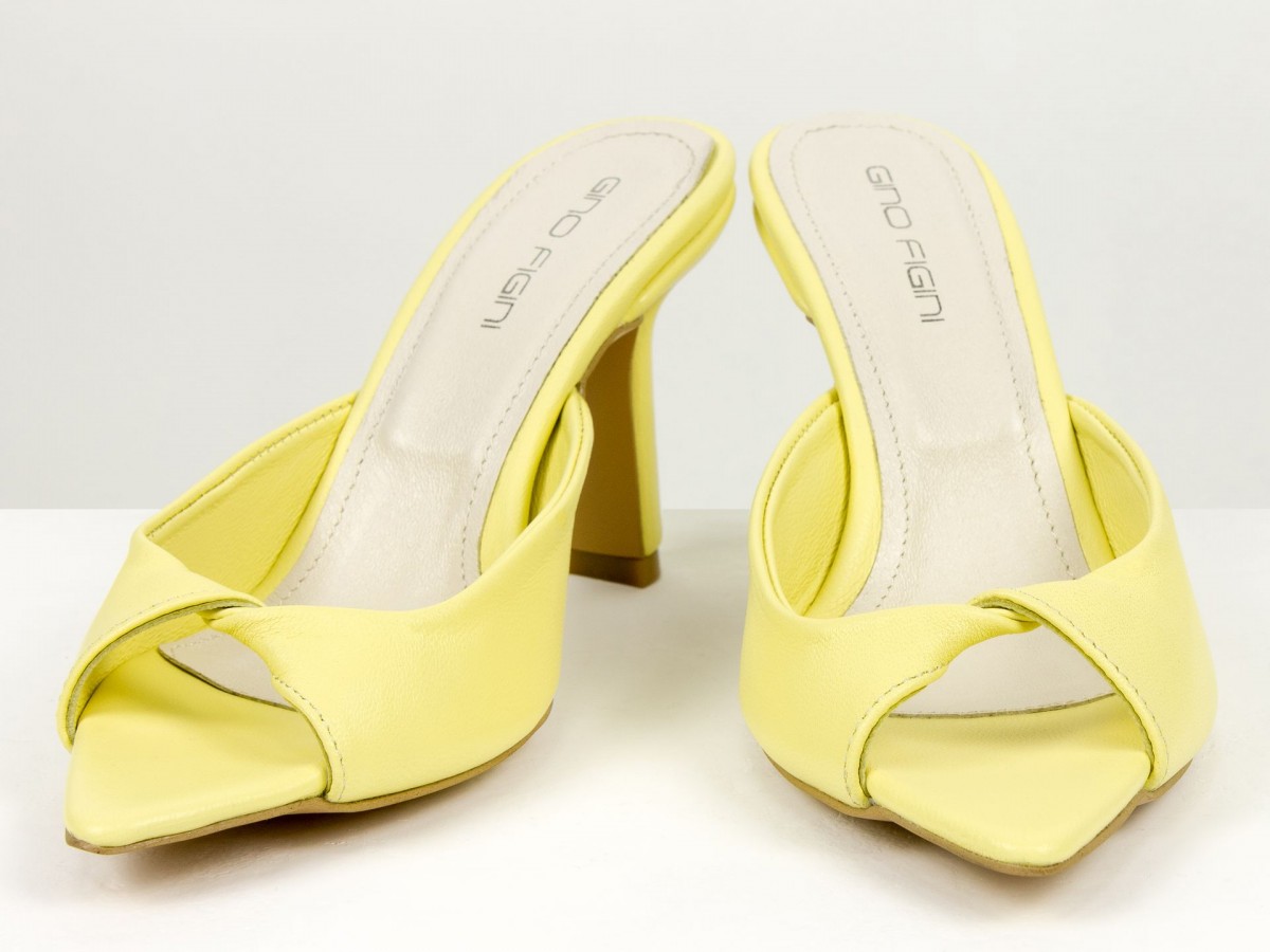 Яркие желтые мюли на каблуке - стильный акцент в вашем образе. Модель изготовлена из натуральной мягкой кожи, которая комфортно облегает стопу. Открытый мыс добавляет легкости, а устойчивый изящный каблук обеспечивает удобство при ходьбе. Идеальный вариант для лета, вечерних выходов, праздников и ежедневной носки в теплую погоду. Элегантный дизайн хорошо сочетается с платьями, джинсами и классическими образами.