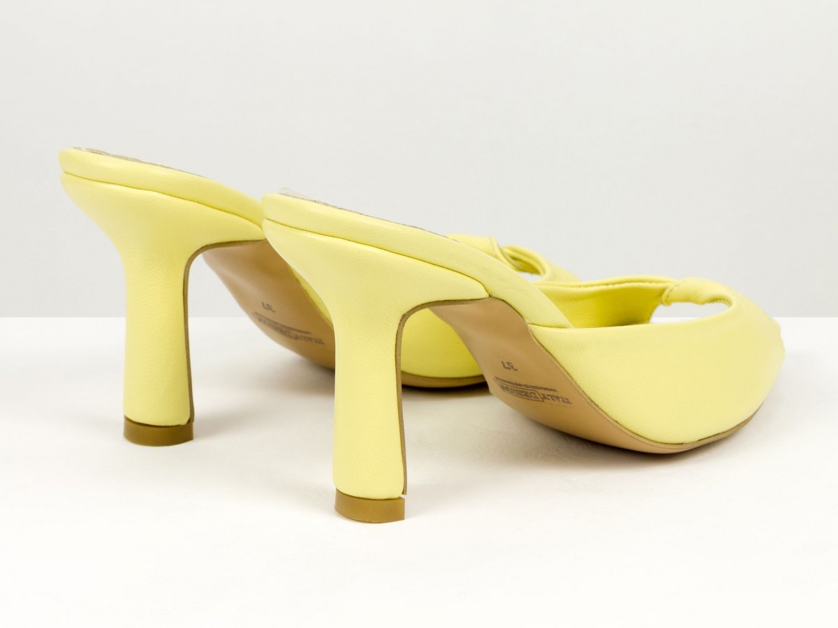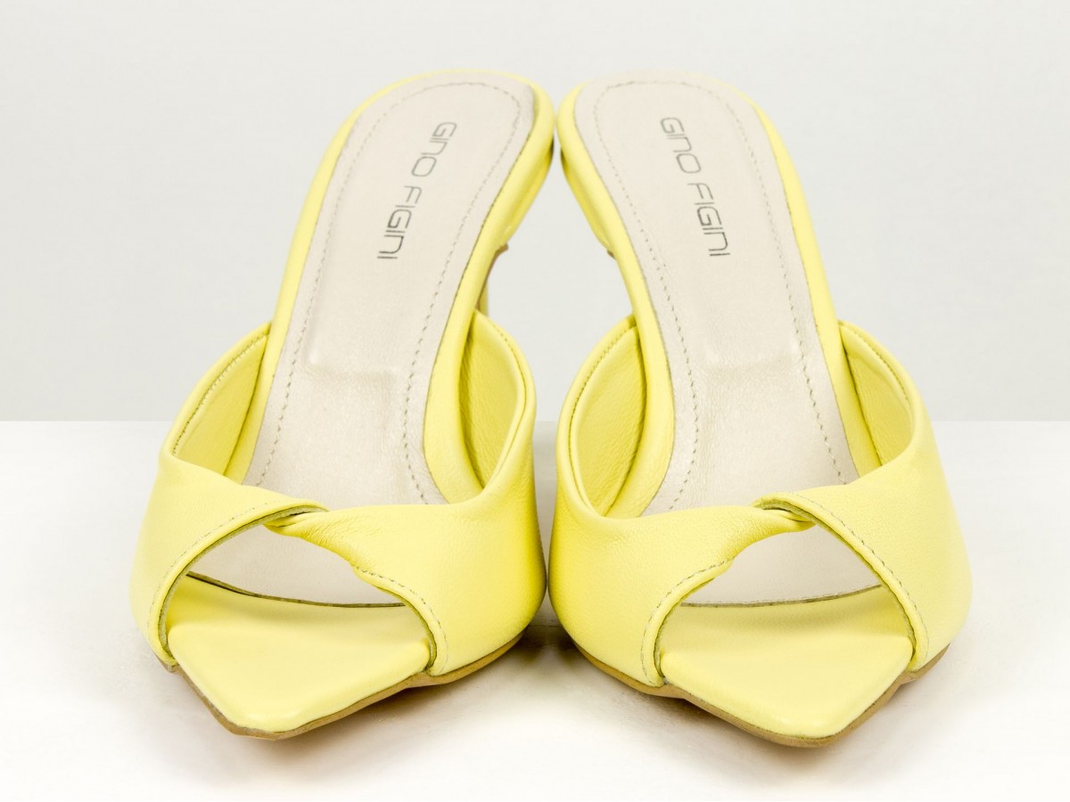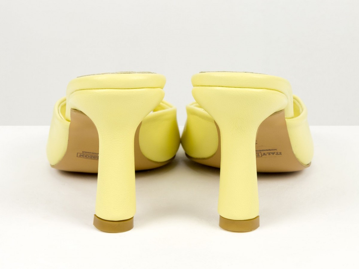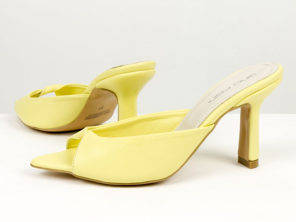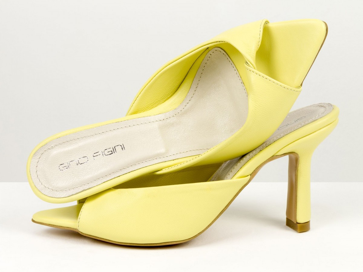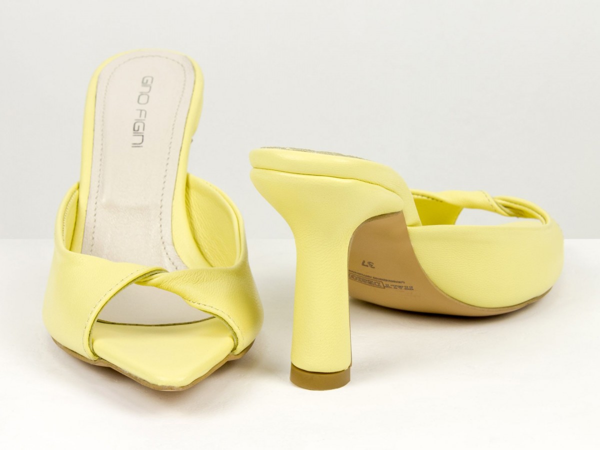 Яркие желтые мюли на каблуке - стильный акцент в вашем образе. Модель изготовлена из натуральной мягкой кожи, которая комфортно облегает стопу. Открытый мыс добавляет легкости, а устойчивый изящный каблук обеспечивает удобство при ходьбе. Идеальный вариант для лета, вечерних выходов, праздников и ежедневной носки в теплую погоду. Элегантный дизайн хорошо сочетается с платьями, джинсами и классическими образами.