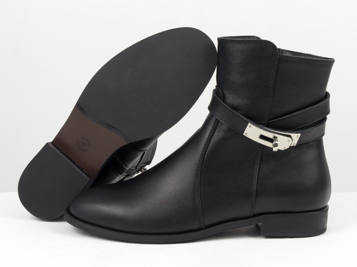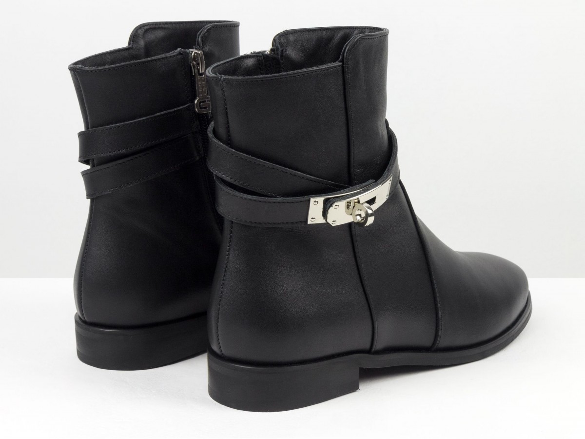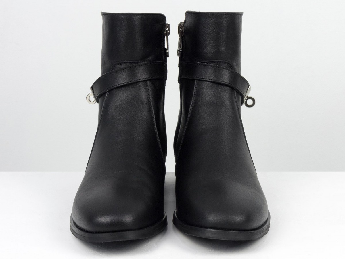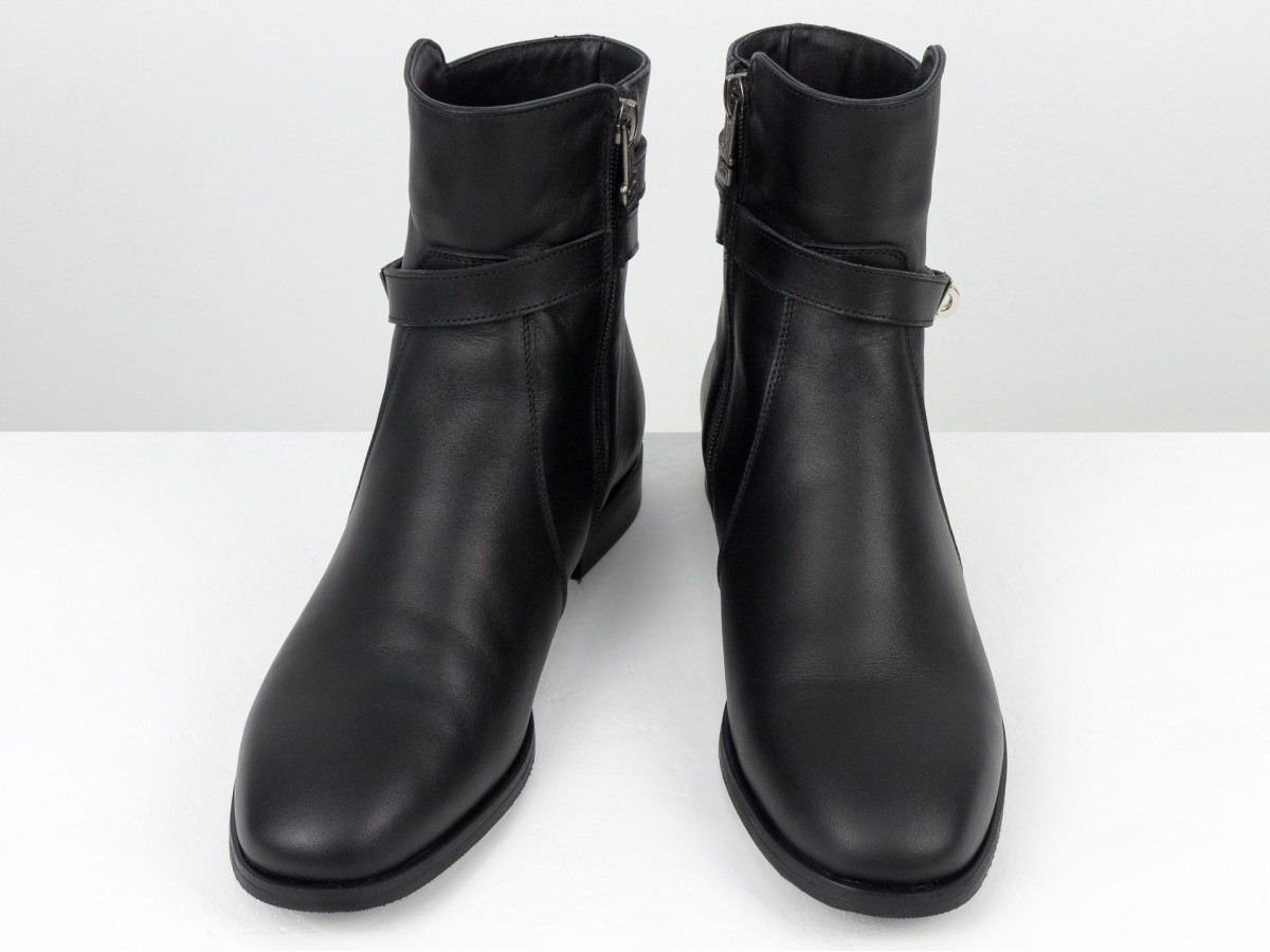 Элегантные женские ботинки из натуральной гладкой кожи — классика, которая всегда в тренде. Сдержанный черный цвет и лаконичный дизайн дополнены декоративным ремешком с металлической пряжкой, придающей модели изысканный акцент.
