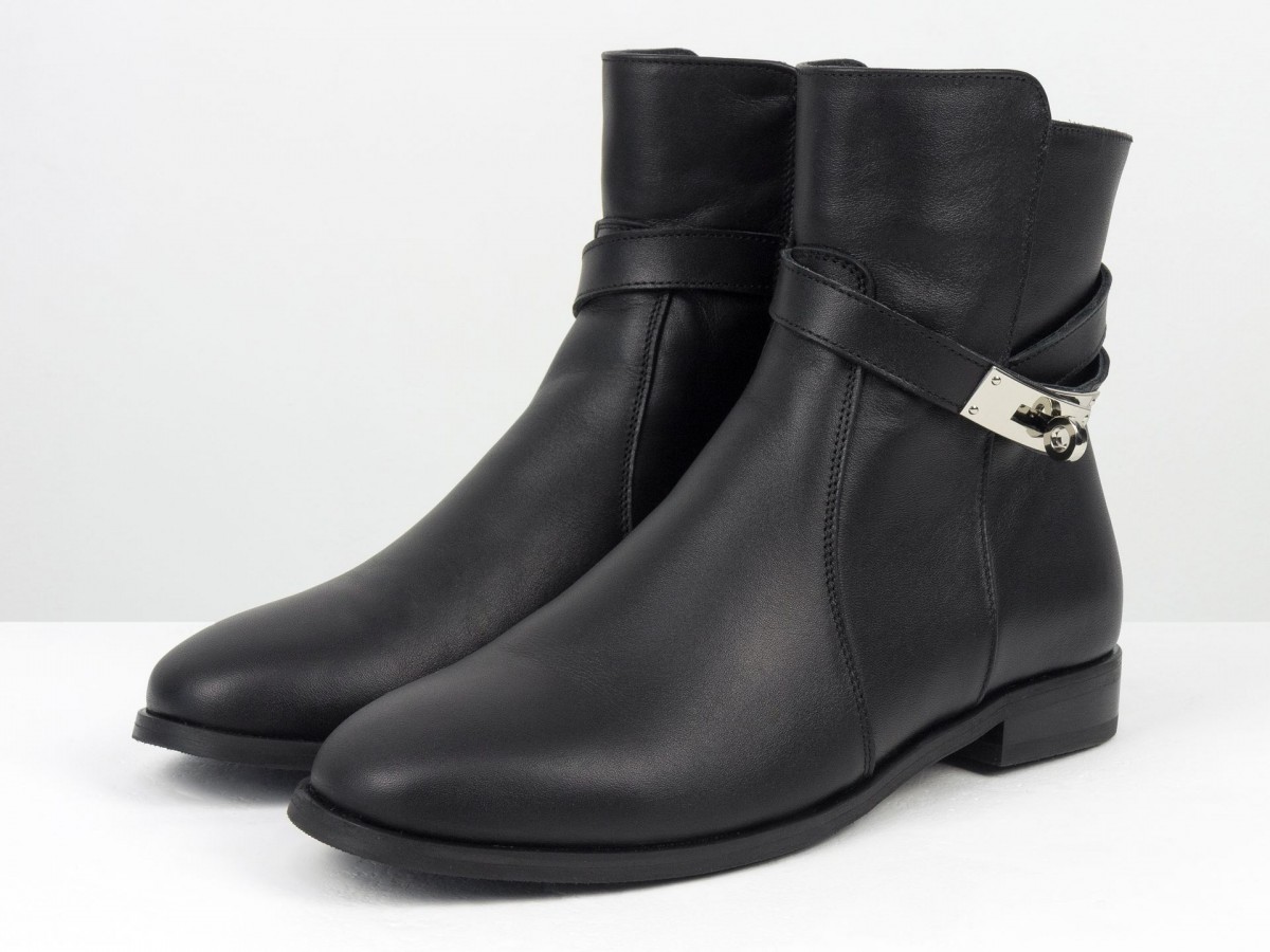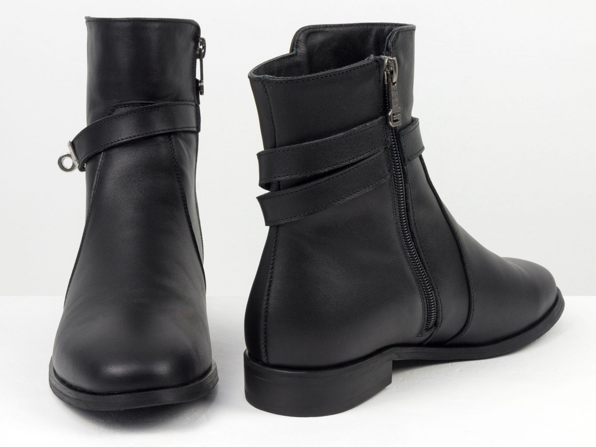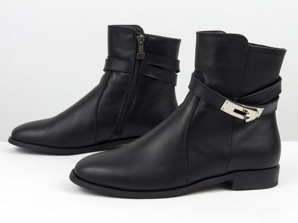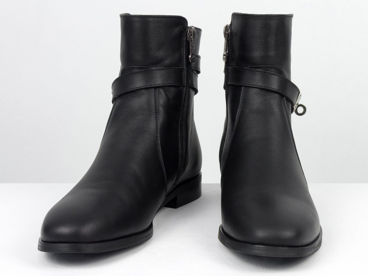 Элегантные женские ботинки из натуральной гладкой кожи — классика, которая всегда в тренде. Сдержанный черный цвет и лаконичный дизайн дополнены декоративным ремешком с металлической пряжкой, придающей модели изысканный акцент.