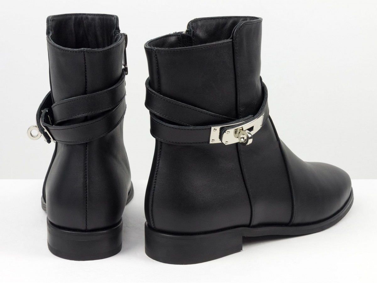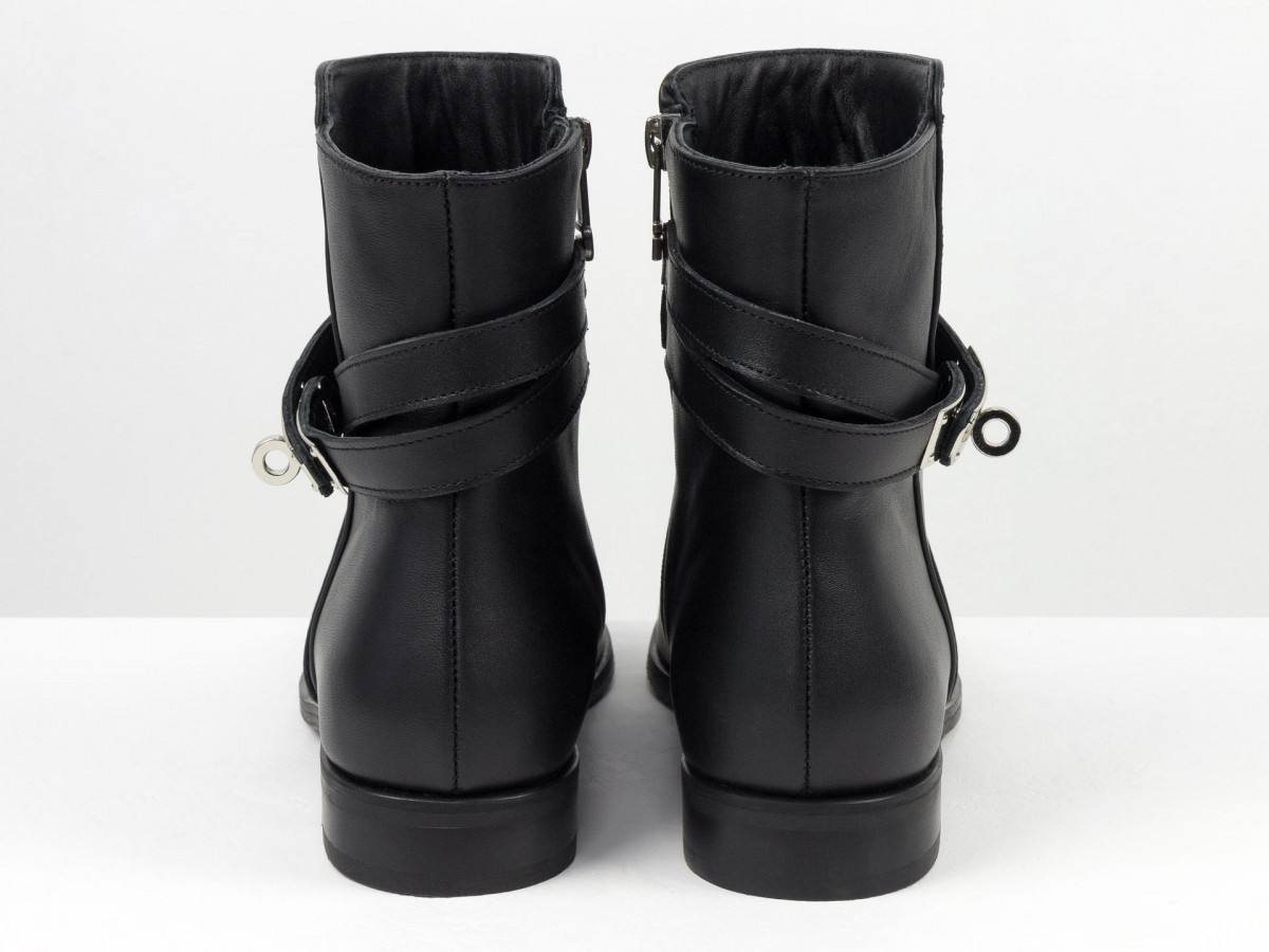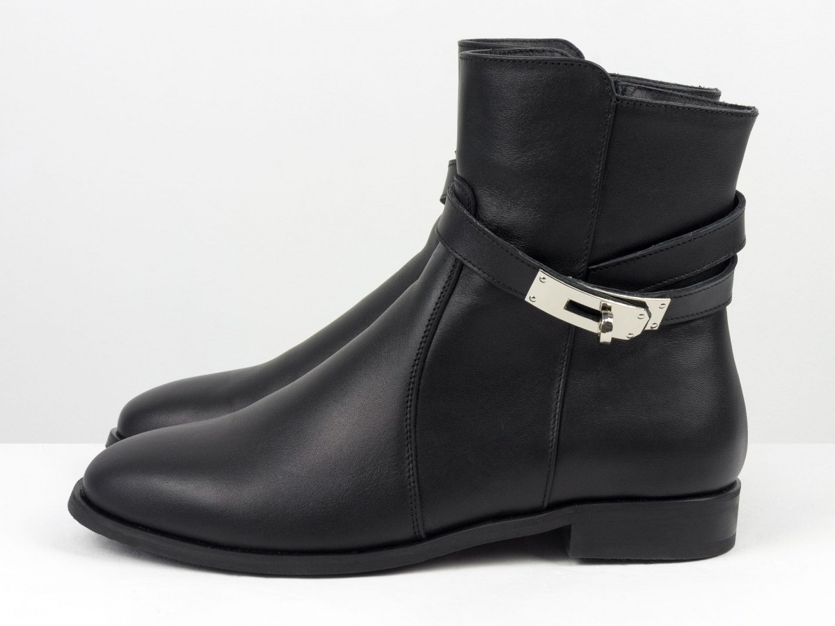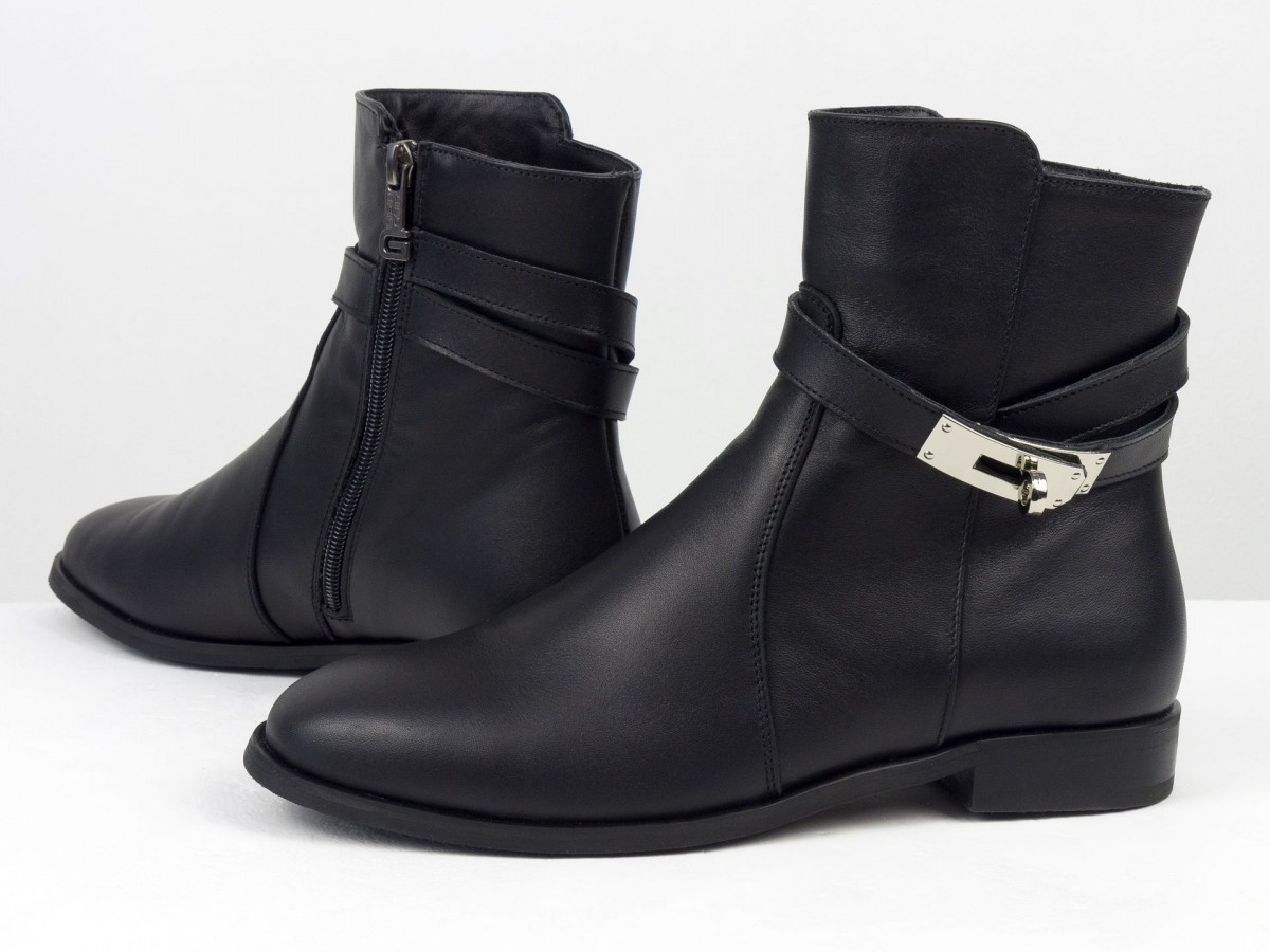 Элегантные женские ботинки из натуральной гладкой кожи — классика, которая всегда в тренде. Сдержанный черный цвет и лаконичный дизайн дополнены декоративным ремешком с металлической пряжкой, придающей модели изысканный акцент.