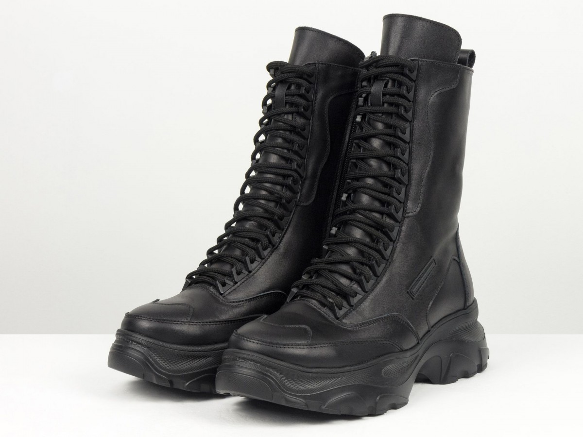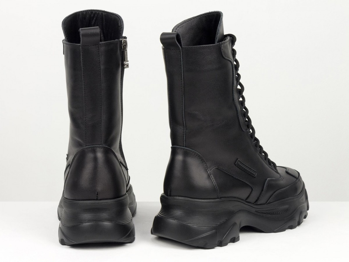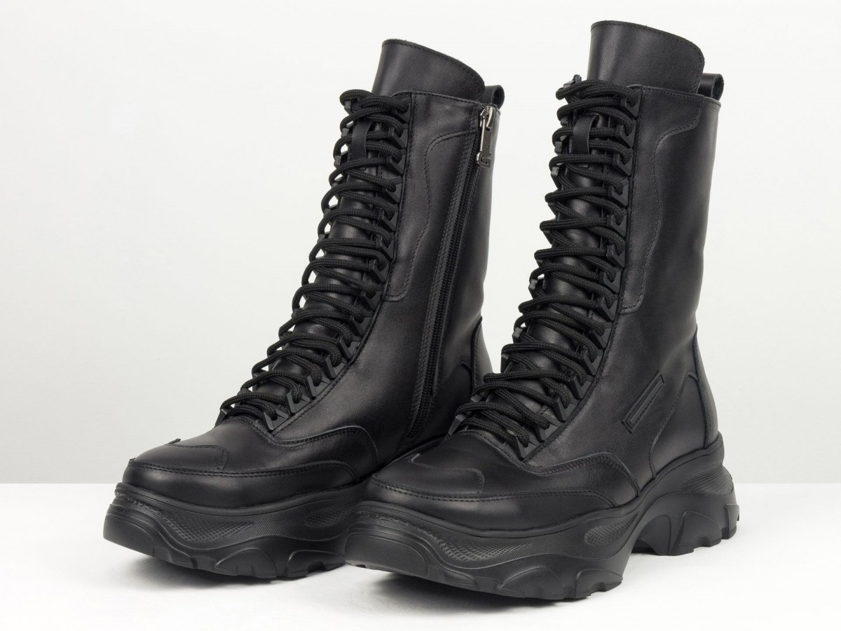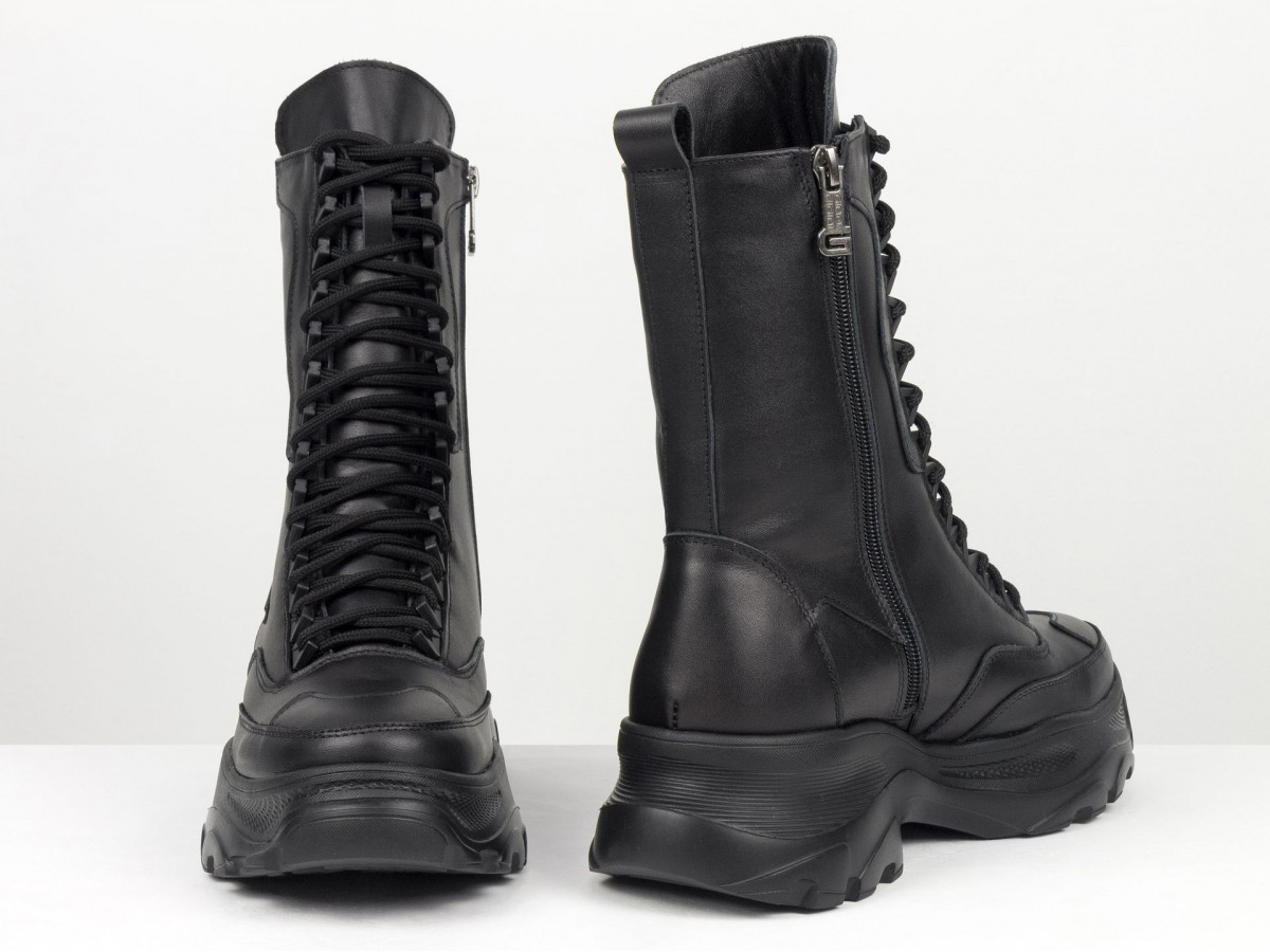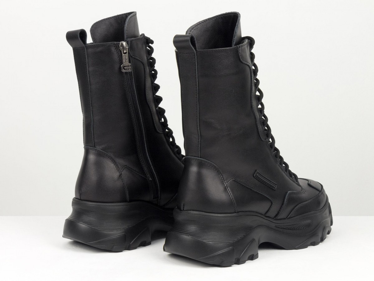 Сиять, удивлять и быть не как все! Вот для чего стоит выбрать новую модель ботинок берц высокого исполнения в черном цвете из натуральной кожи в сочетании с высокой подошвой. Черный классический цвет весьма практичен и гармоничен с любыми брутальными и повседневными гардеробными ансамблями, а удобная колодка с густой шнуровкой делают необычным и уникальным дизайн модели. В этом также помогают яркие элементы, фурнитура, дорогая кожа и легкое прилегание к ножкам, делая внешний вид нарядным и аккуратным. К этой обуви подходят спортивные костюмы, джинсы, узкие брючки и даже юбки разной длины. Вашим ножкам будет комфортно, удобно, легко дефилировать целый день без усталости в нужном направлении. С этим справляется высокого качества натуральная кожа, принимающая форму ноги, антискользящая подошва, шнуровка, фиксирующая отлично ботинки по ножке. А еще их заметными, эффектными и выразительными делают уникальный крой, высокий многослойный язычок с необычной окантовкой простроченный носик. Такие ботиночки подходят всем девушкам с разным подъемом и объемом ножек.