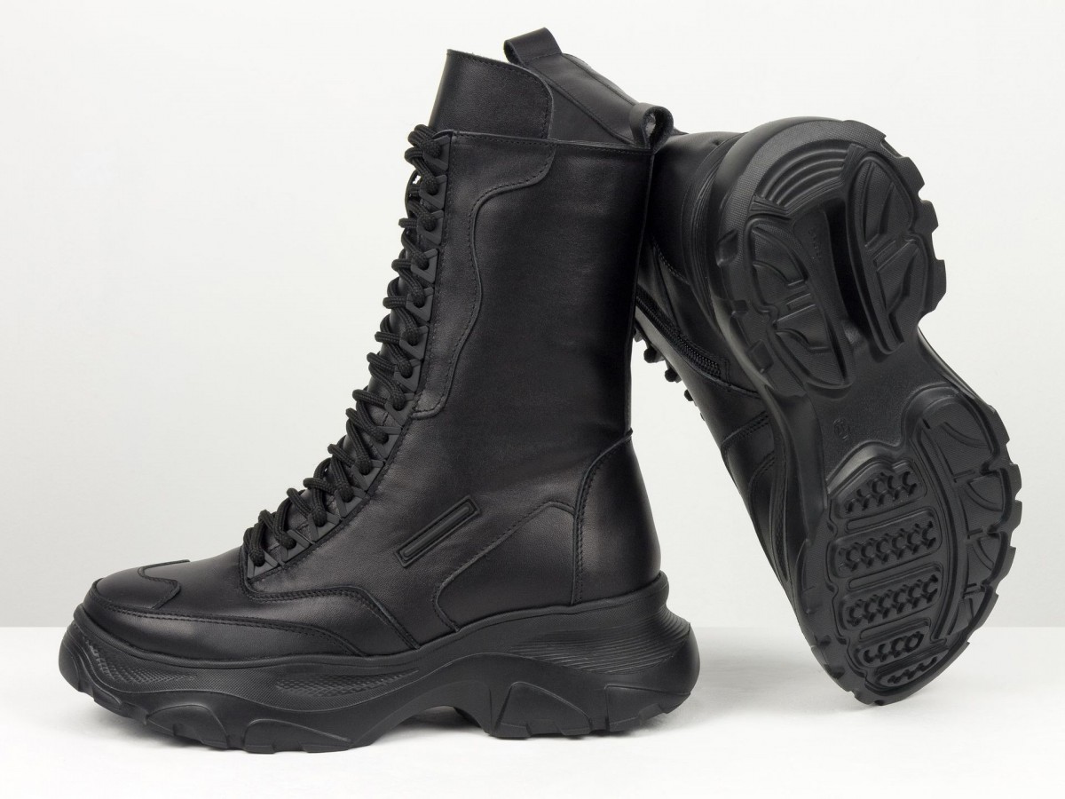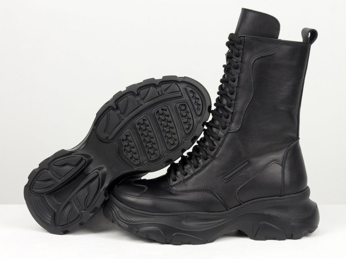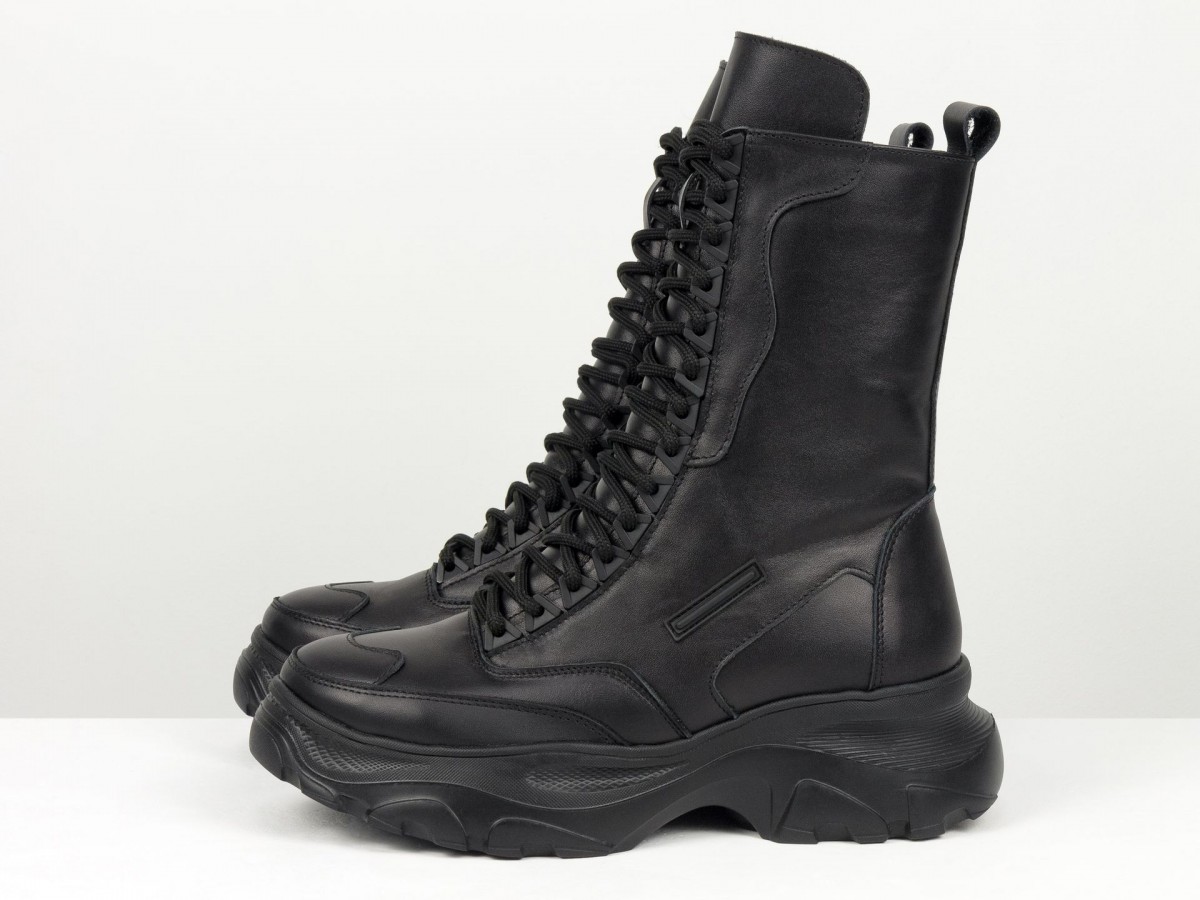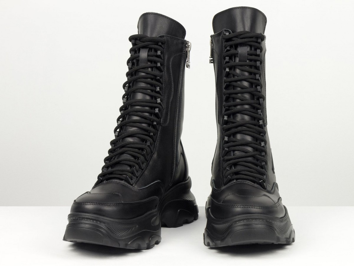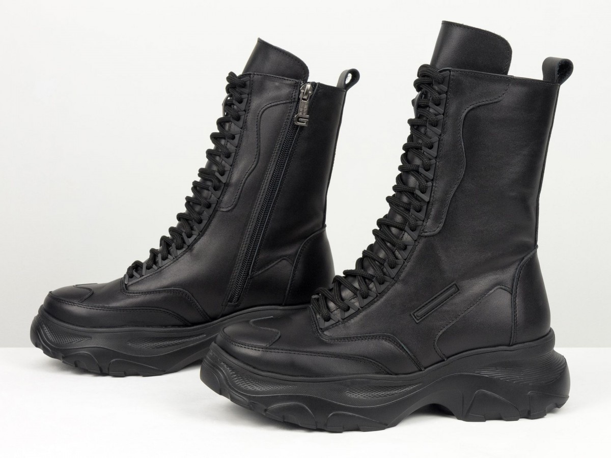 Сиять, удивлять и быть не как все! Вот для чего стоит выбрать новую модель ботинок берц высокого исполнения в черном цвете из натуральной кожи в сочетании с высокой подошвой. Черный классический цвет весьма практичен и гармоничен с любыми брутальными и повседневными гардеробными ансамблями, а удобная колодка с густой шнуровкой делают необычным и уникальным дизайн модели. В этом также помогают яркие элементы, фурнитура, дорогая кожа и легкое прилегание к ножкам, делая внешний вид нарядным и аккуратным. К этой обуви подходят спортивные костюмы, джинсы, узкие брючки и даже юбки разной длины. Вашим ножкам будет комфортно, удобно, легко дефилировать целый день без усталости в нужном направлении. С этим справляется высокого качества натуральная кожа, принимающая форму ноги, антискользящая подошва, шнуровка, фиксирующая отлично ботинки по ножке. А еще их заметными, эффектными и выразительными делают уникальный крой, высокий многослойный язычок с необычной окантовкой простроченный носик. Такие ботиночки подходят всем девушкам с разным подъемом и объемом ножек.