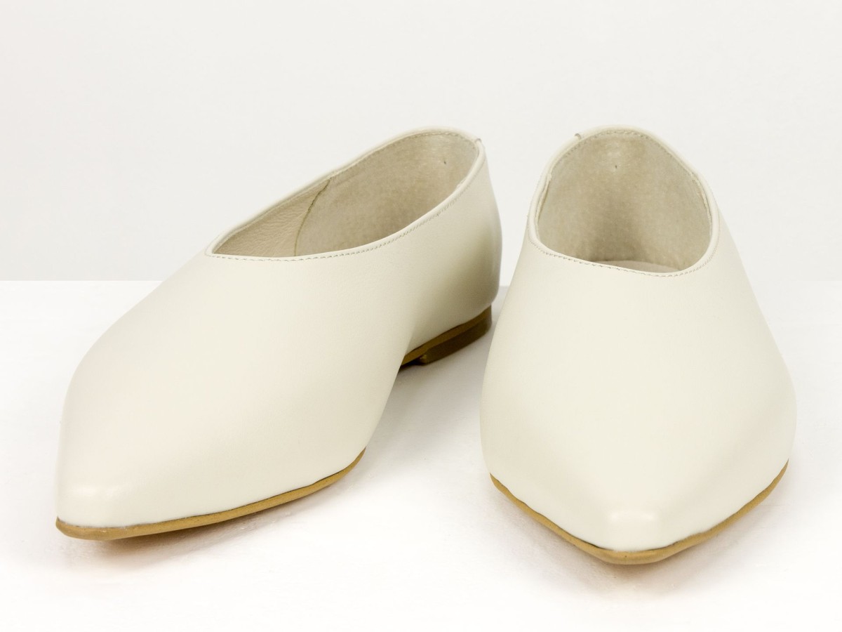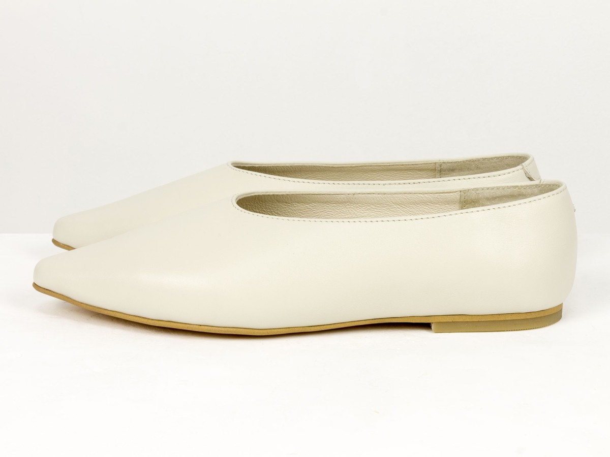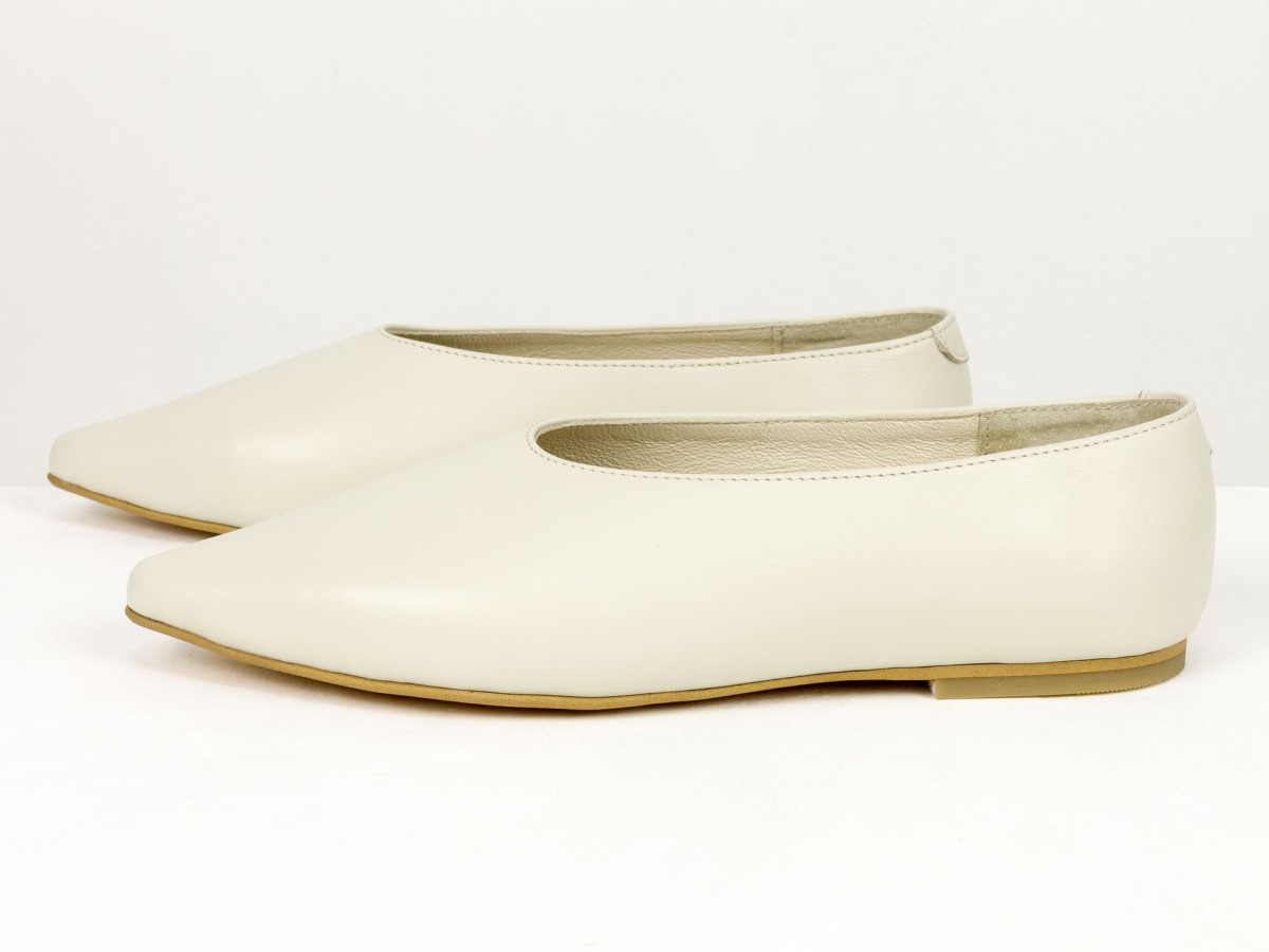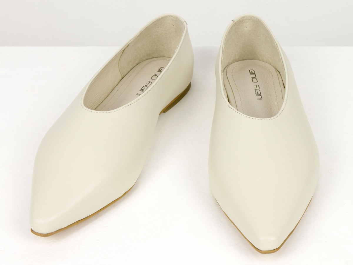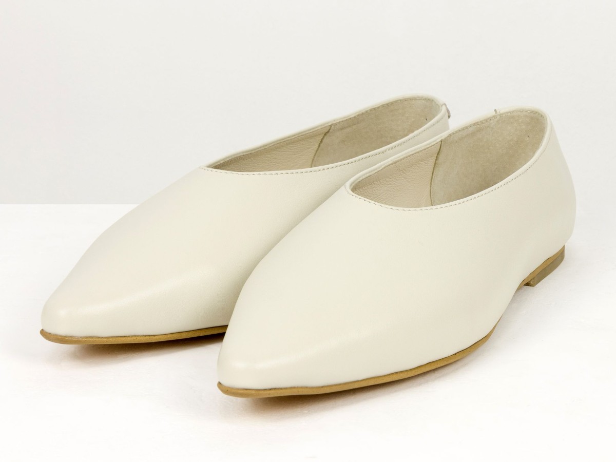 Стильні балетки у сучасному форматі лоферів з м’якої натуральної шкіри молочного кольору . Витончений загострений носок візуально подовжує ніжку, а закритий верх створює елегантний силует. Усередині натуральна шкіра, що забезпечує комфорт протягом усього дня. Легка підошва та універсальний дизайн роблять цю модель ідеальним вибором як для ділових образів, так і для повсякденного носіння.