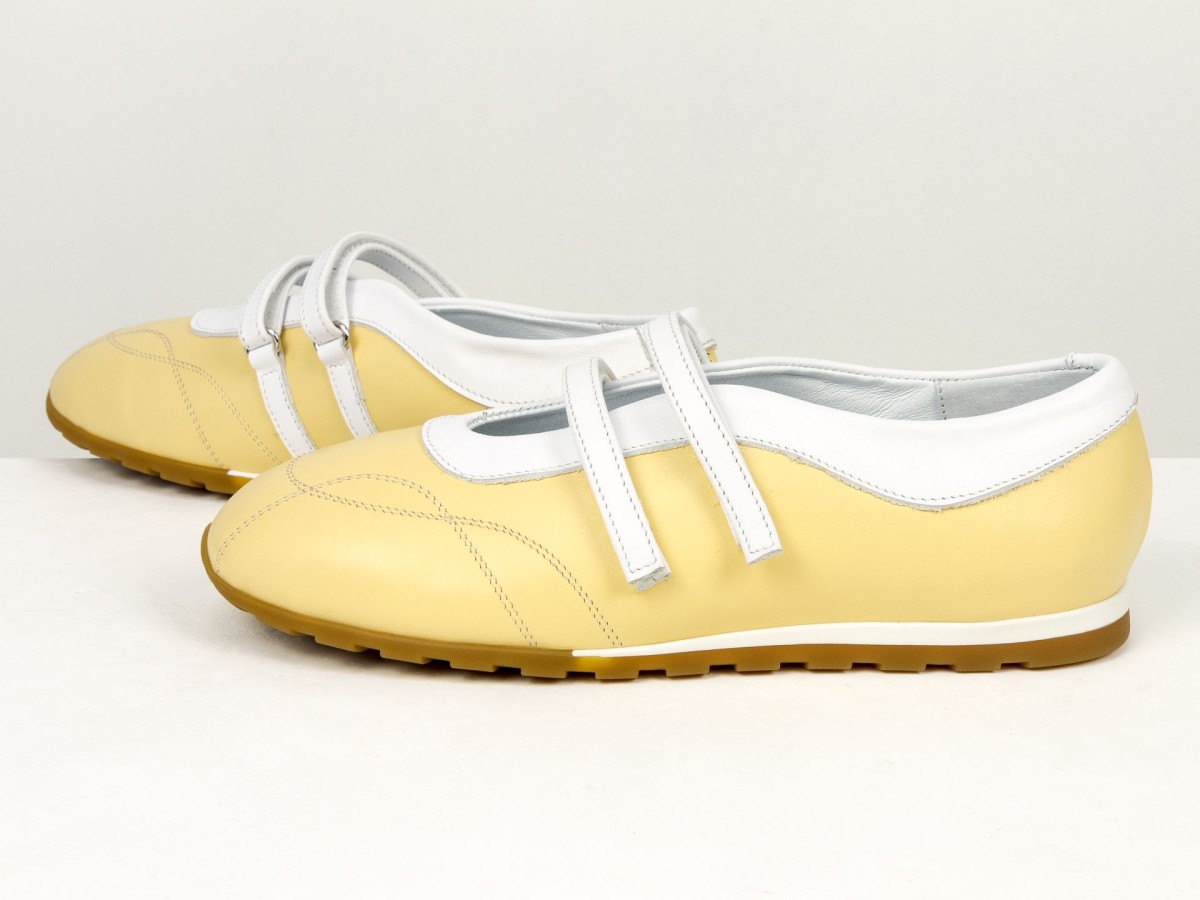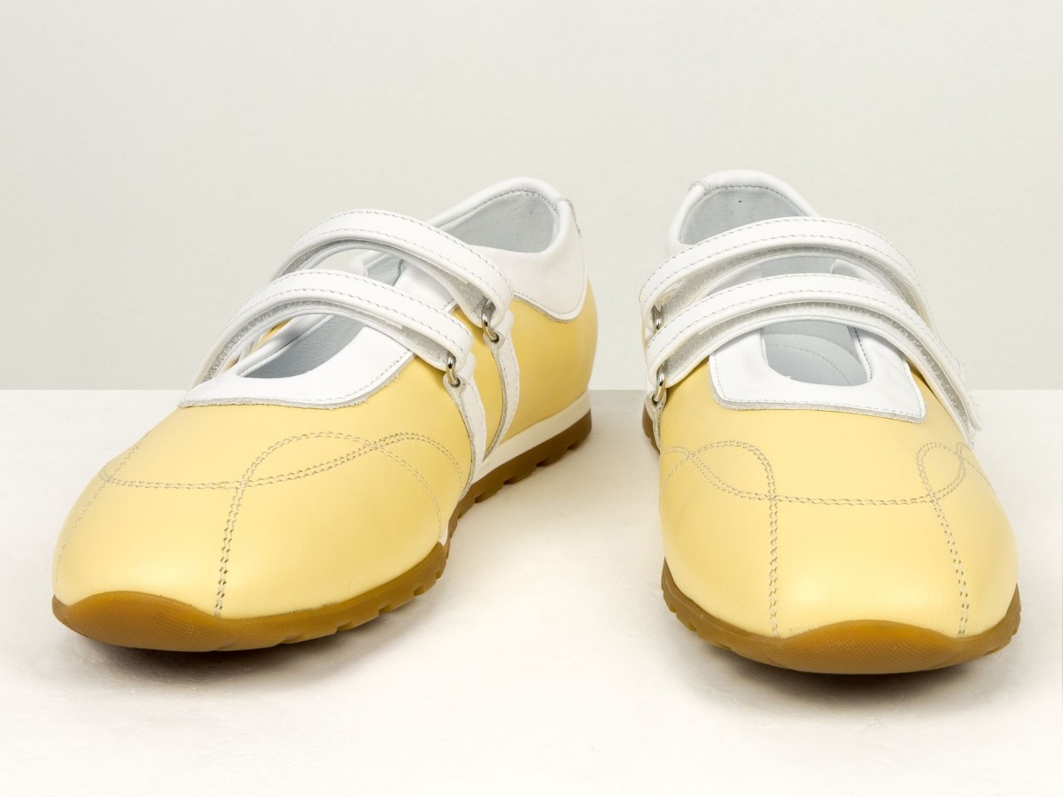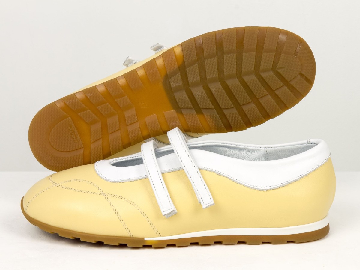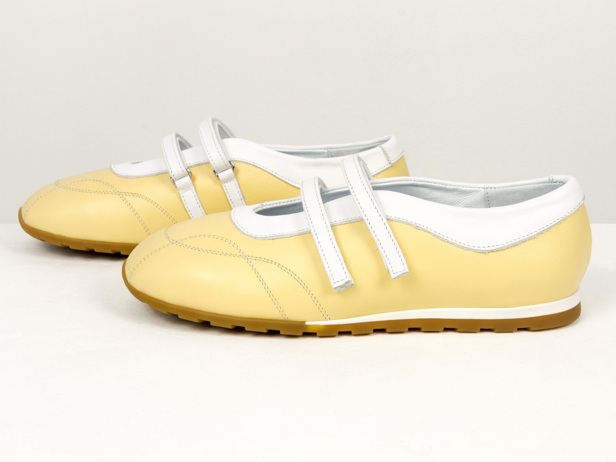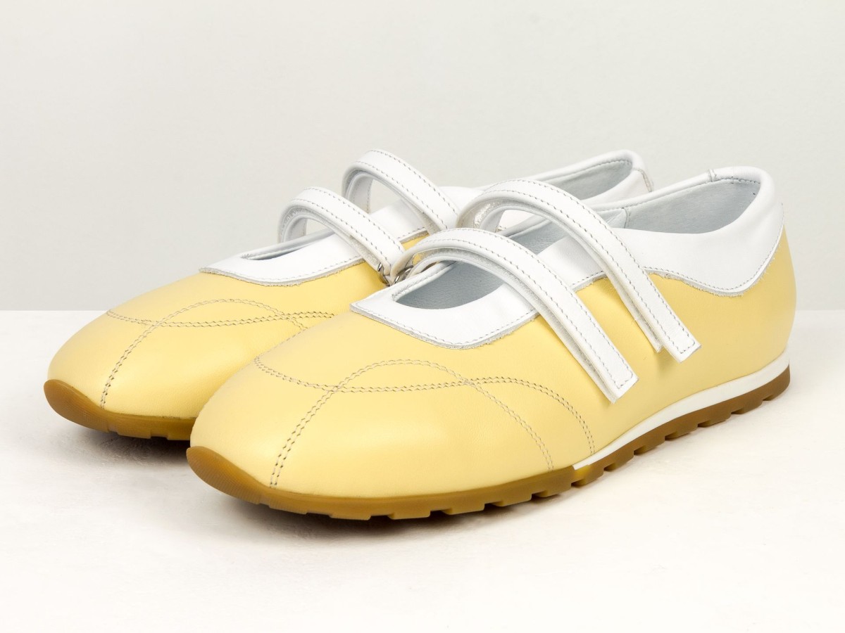 Жіночі балетки з натуральної шкіри у ніжному жовтому кольорі — легка та стильна модель для щоденного використання. Актуальний дизайн з ремінцями додає образу жіночності та забезпечує додаткову фіксацію стопи. Верх виконаний з якісної натуральної шкіри, яка добре тримає форму та адаптується під стопу. М’яка підкладка забезпечує комфорт навіть при тривалому носінні. Гнучка підошва сприяє природному руху стопи, а зручна посадка робить ці балетки ідеальним вибором для активного дня. Модель гармонійно поєднується як з сукнями, так і з джинсами чи класичними образами.