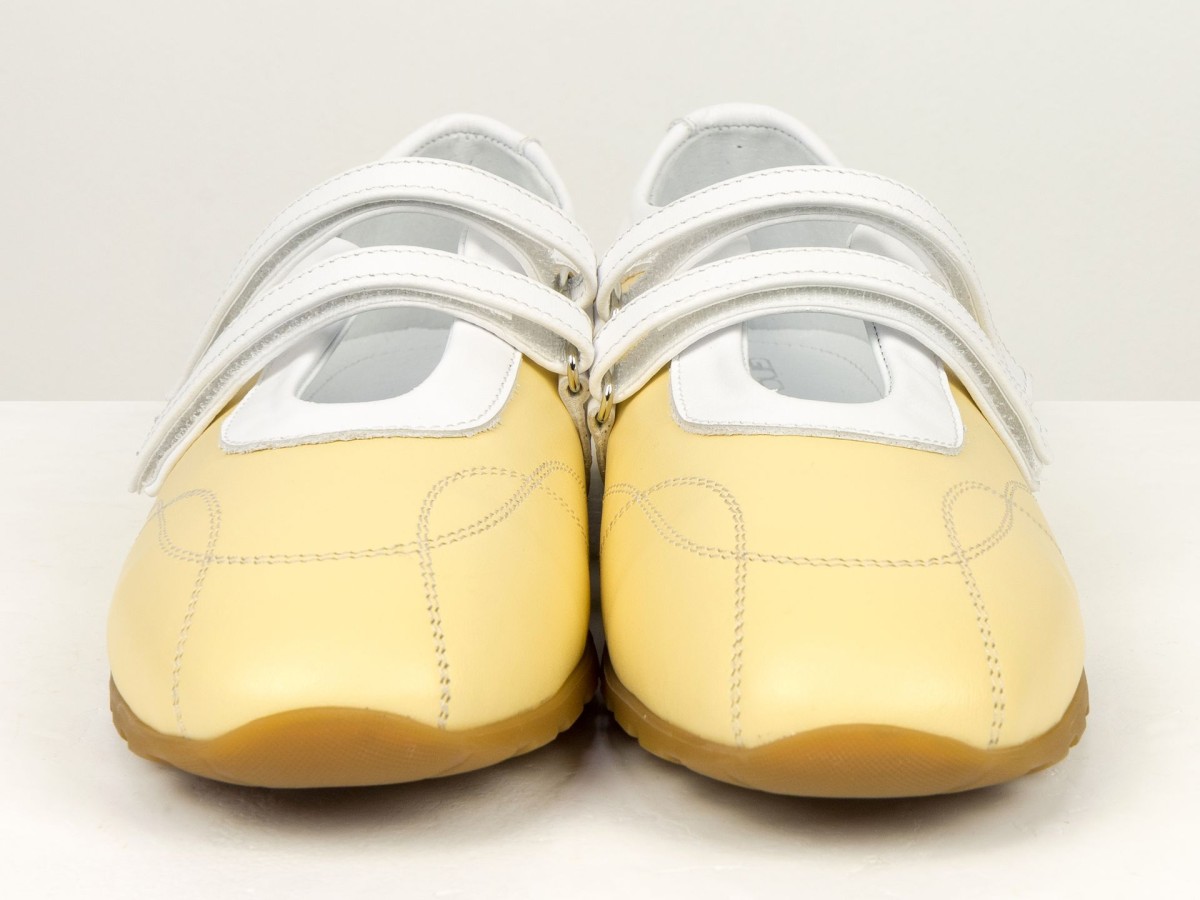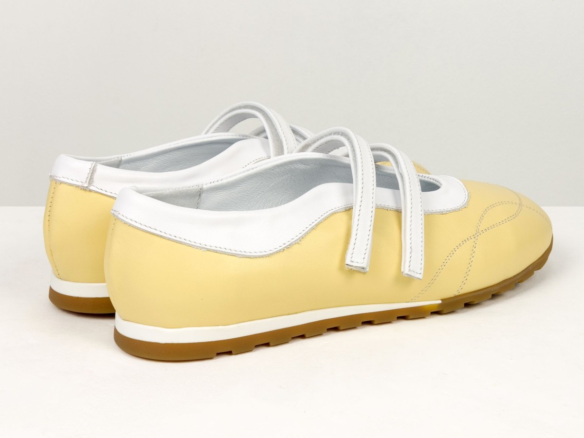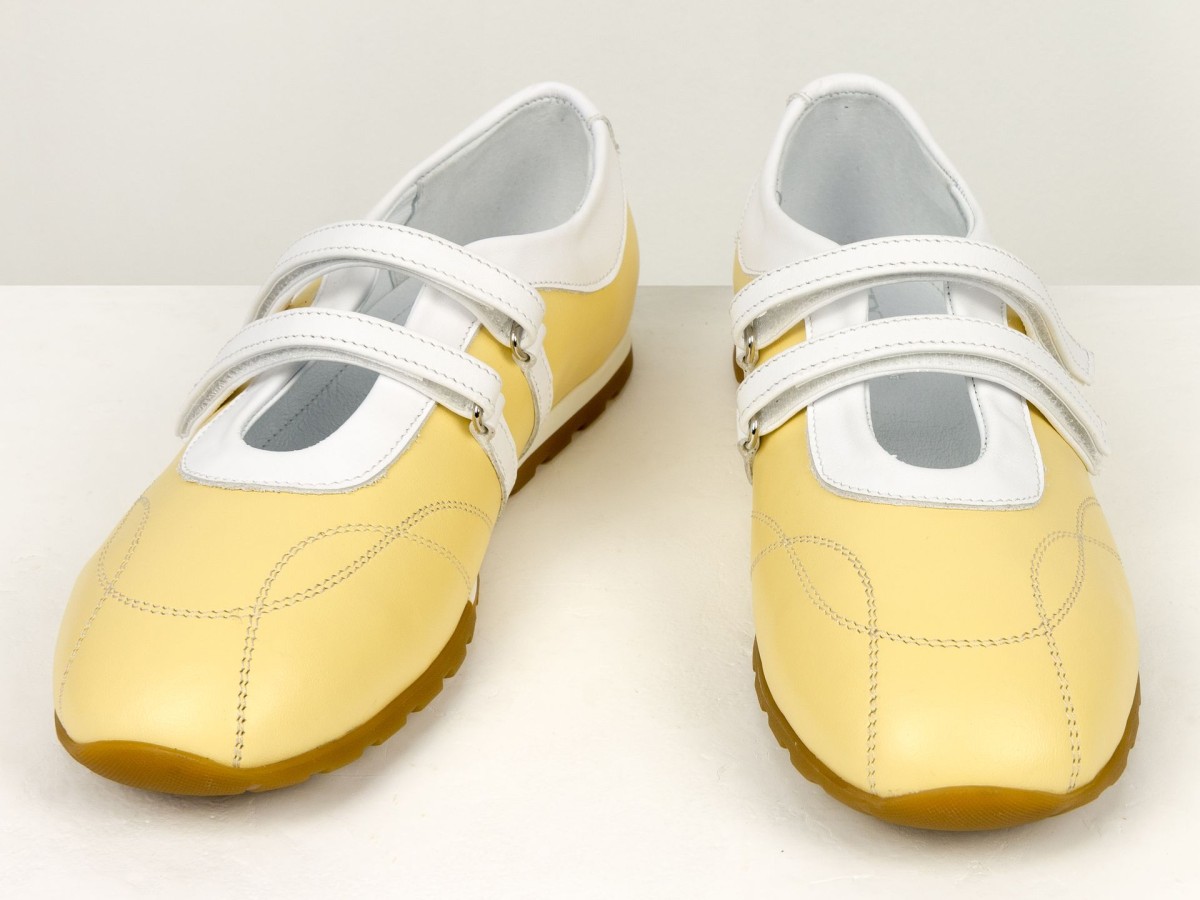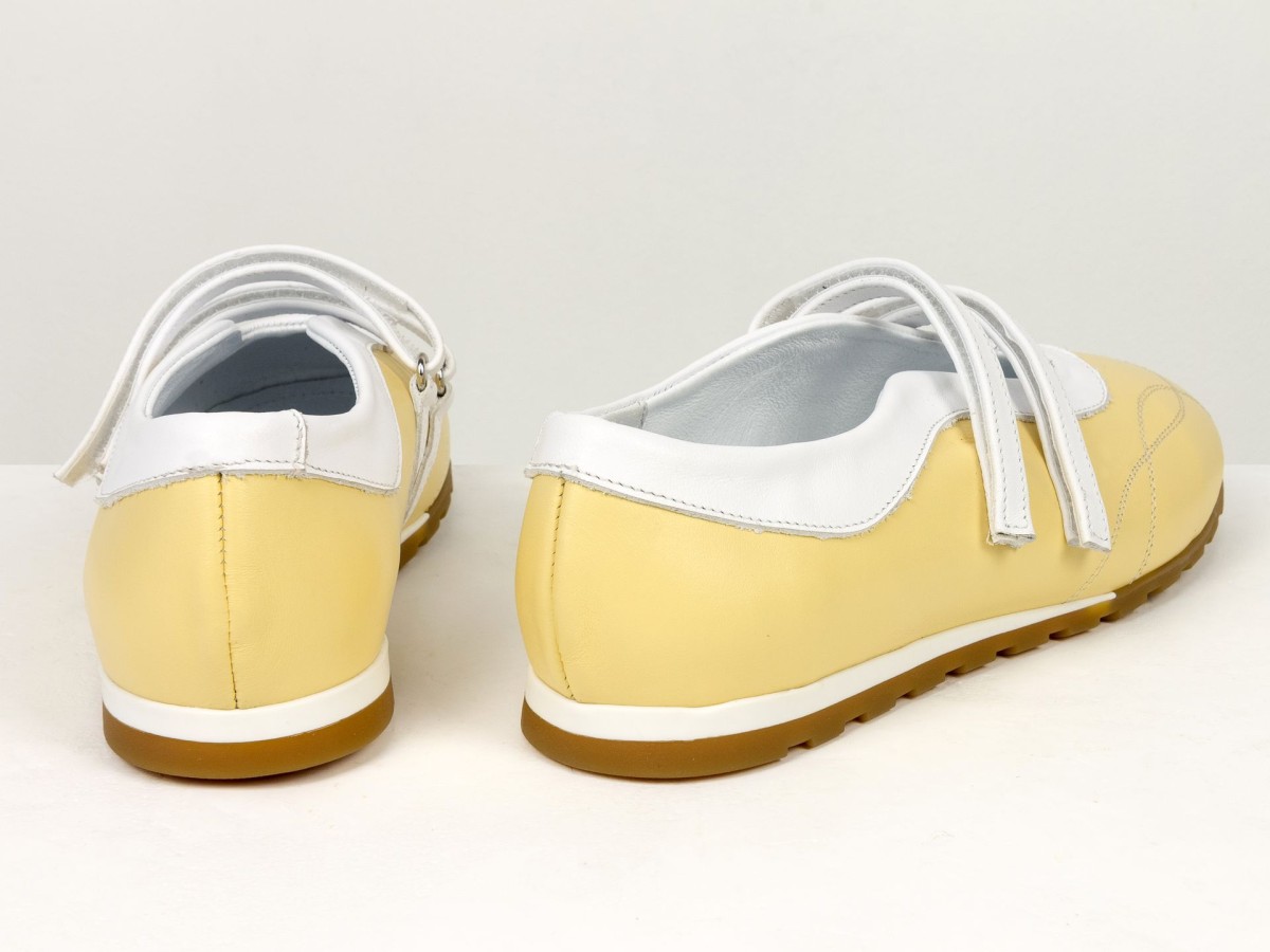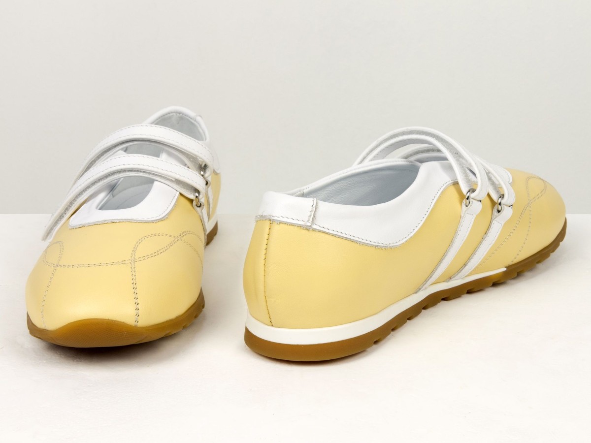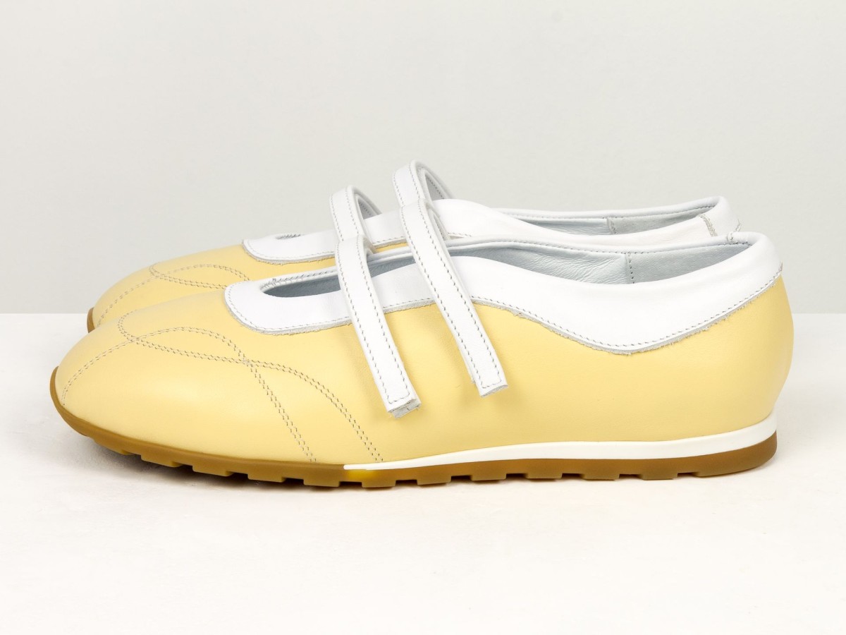 Жіночі балетки з натуральної шкіри у ніжному жовтому кольорі — легка та стильна модель для щоденного використання. Актуальний дизайн з ремінцями додає образу жіночності та забезпечує додаткову фіксацію стопи. Верх виконаний з якісної натуральної шкіри, яка добре тримає форму та адаптується під стопу. М’яка підкладка забезпечує комфорт навіть при тривалому носінні. Гнучка підошва сприяє природному руху стопи, а зручна посадка робить ці балетки ідеальним вибором для активного дня. Модель гармонійно поєднується як з сукнями, так і з джинсами чи класичними образами.