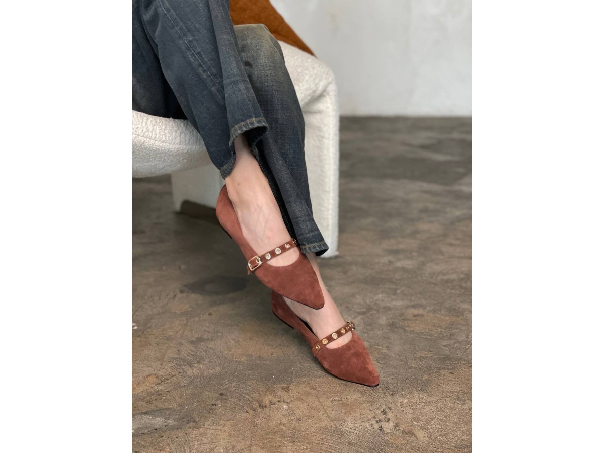 Стильні жіночі балетки з м’якої натуральної замші у глибокому шоколадному відтінку. Витончений загострений носок візуально подовжує ніжку, а декоративний ремінець із металевими люверсами та пряжкою додає сучасного акценту. Внутрішня підкладка з натуральної шкіри забезпечує комфорт протягом усього дня. Ідеальний варіант для щоденного носіння та створення елегантного міського образу.