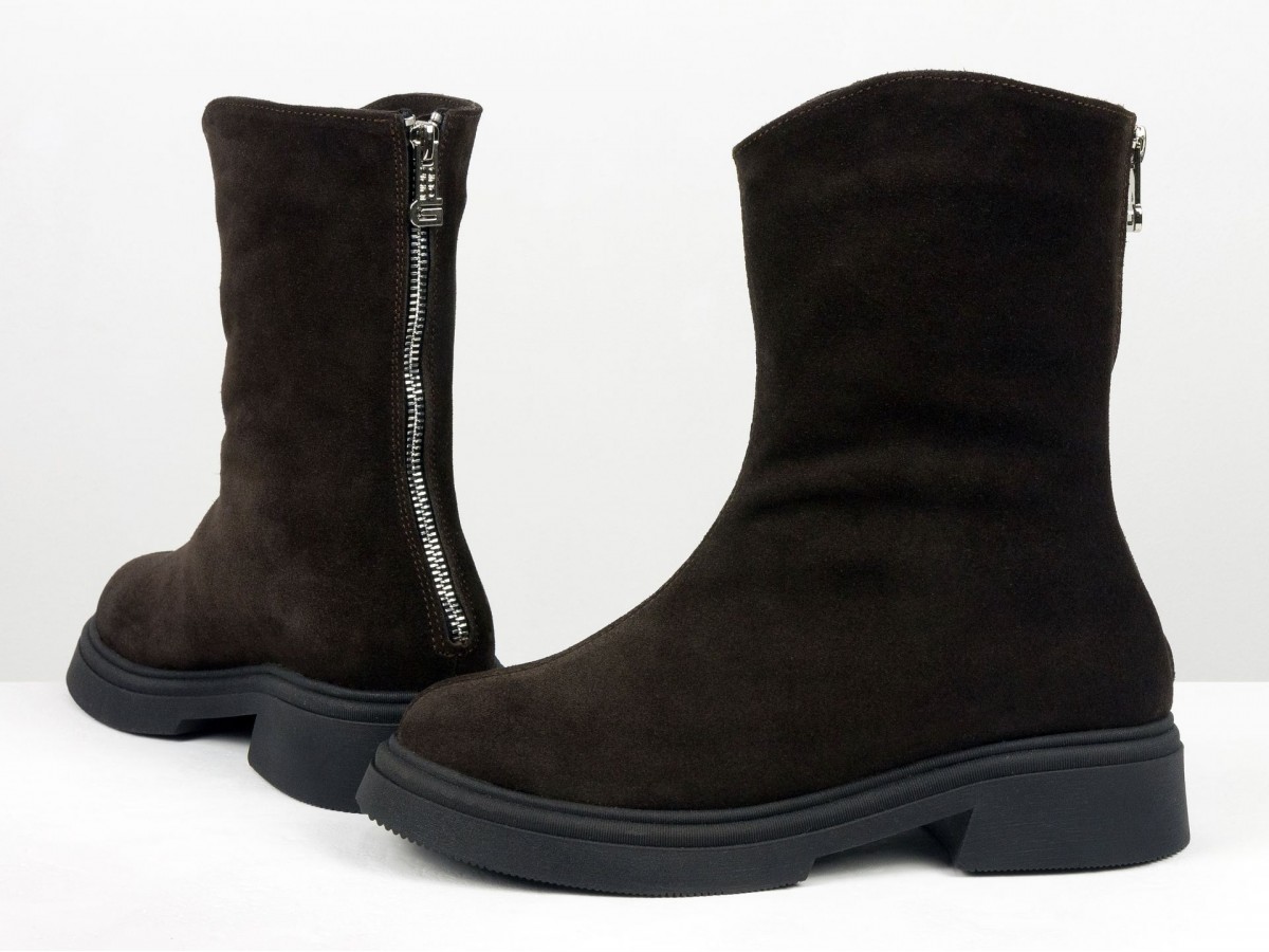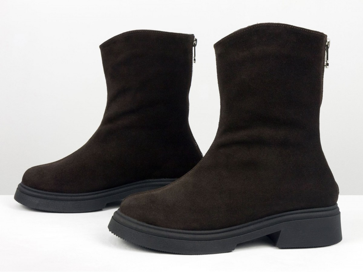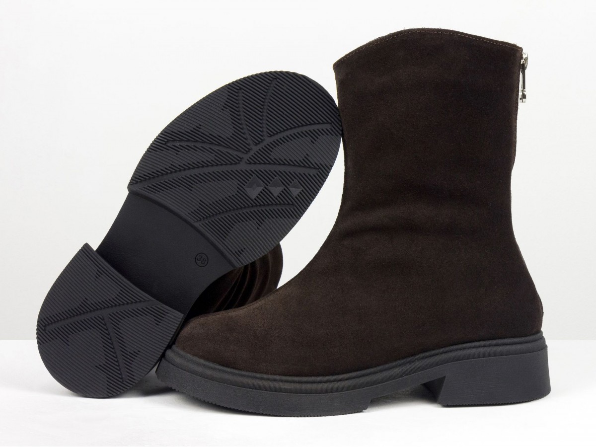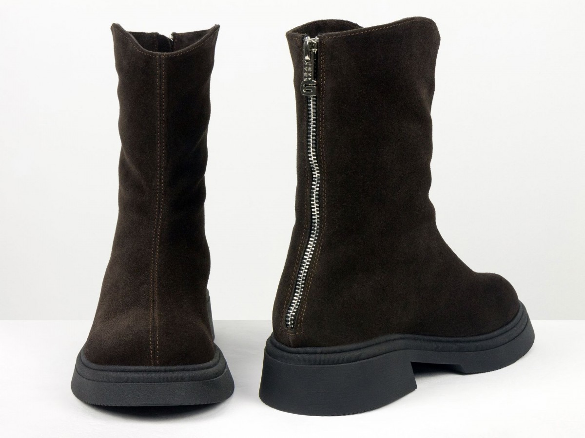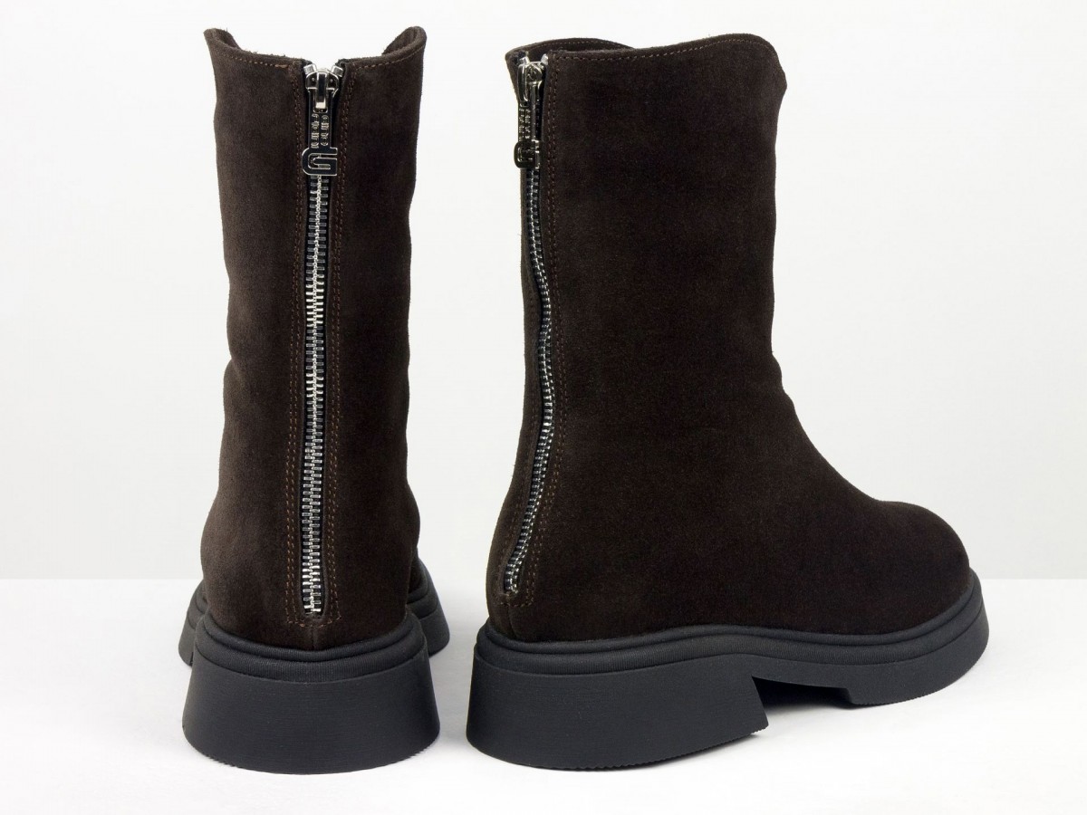 Жіночі замшеві черевики шоколадного кольору - стильна та універсальна модель для холодного сезону. Виготовлені з натуральної замші преміум якості, вони поєднують комфорт і сучасний дизайн. Черевики мають зручну застібку-блискавку збоку, м’яку посадку та легку, стійку підошву.