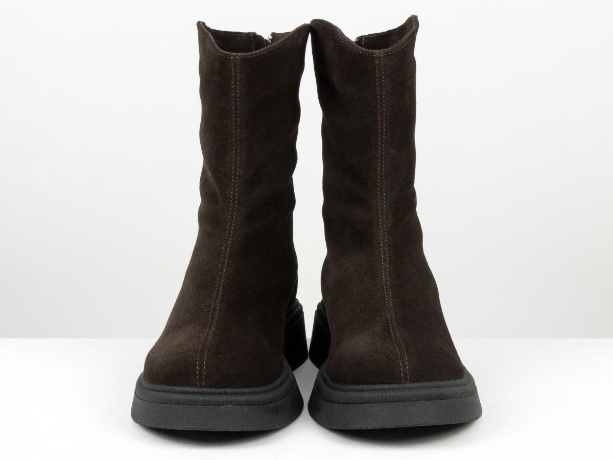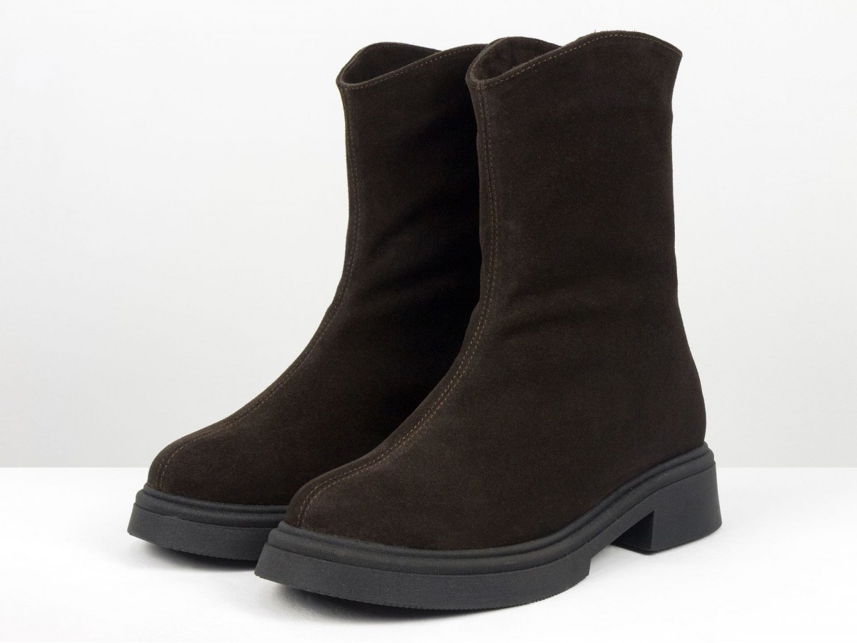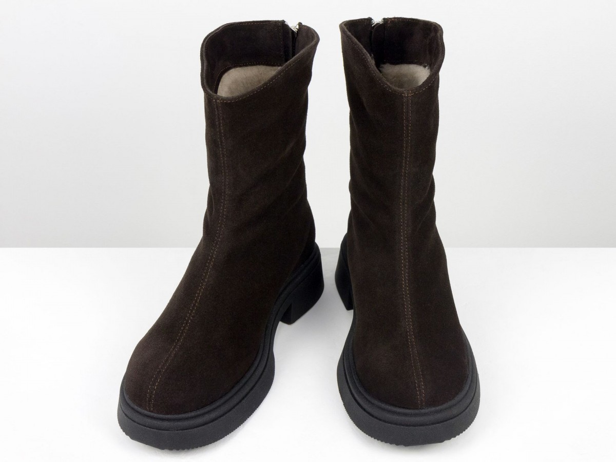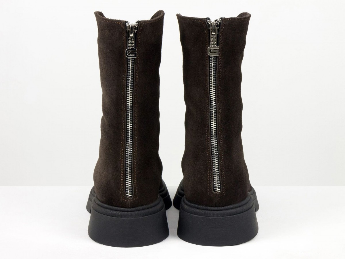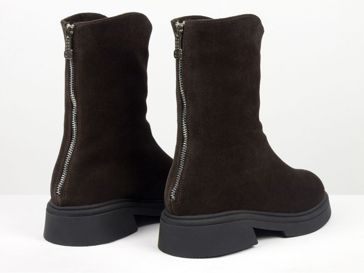 Жіночі замшеві черевики шоколадного кольору - стильна та універсальна модель для холодного сезону. Виготовлені з натуральної замші преміум якості, вони поєднують комфорт і сучасний дизайн. Черевики мають зручну застібку-блискавку збоку, м’яку посадку та легку, стійку підошву.