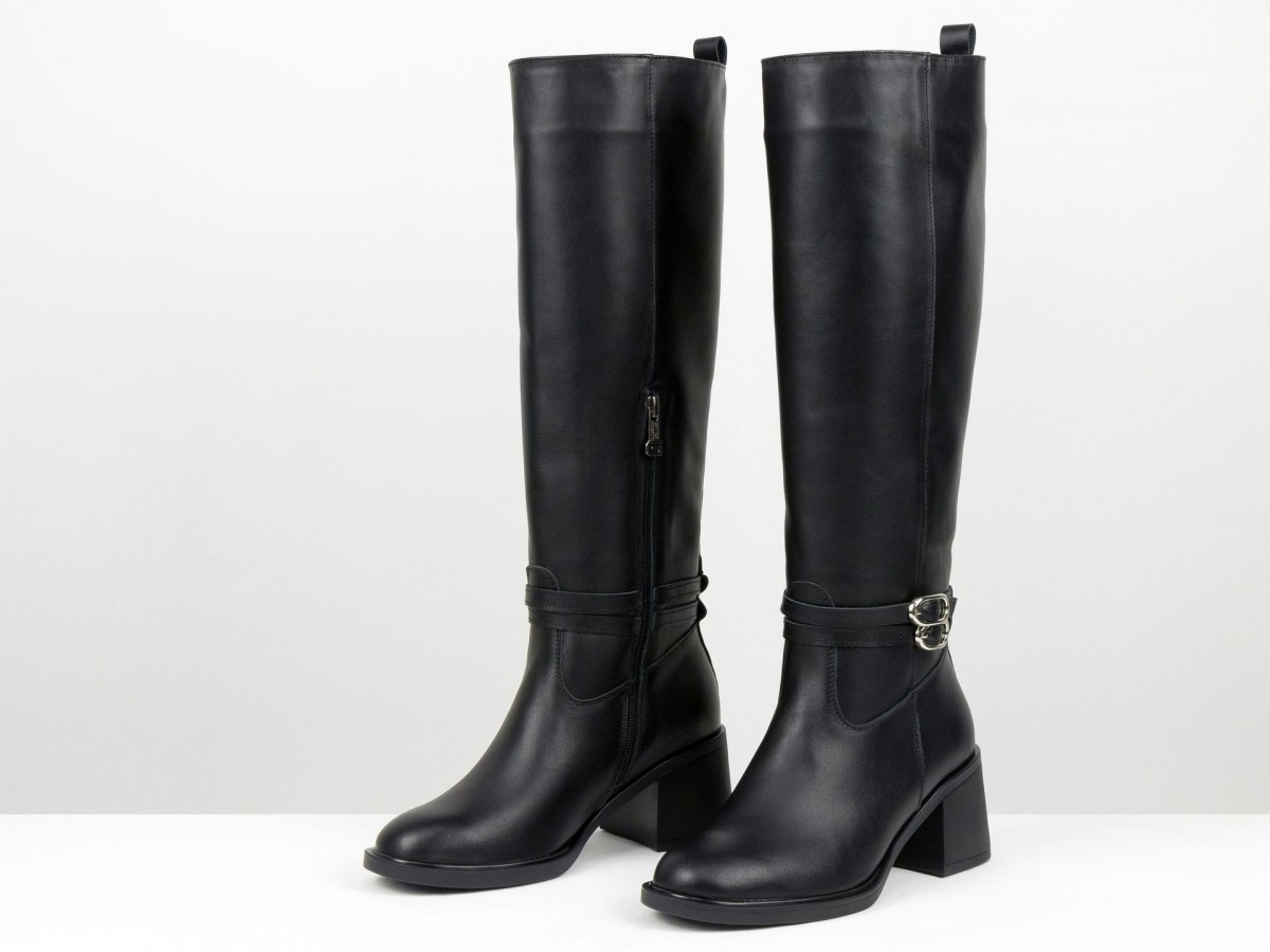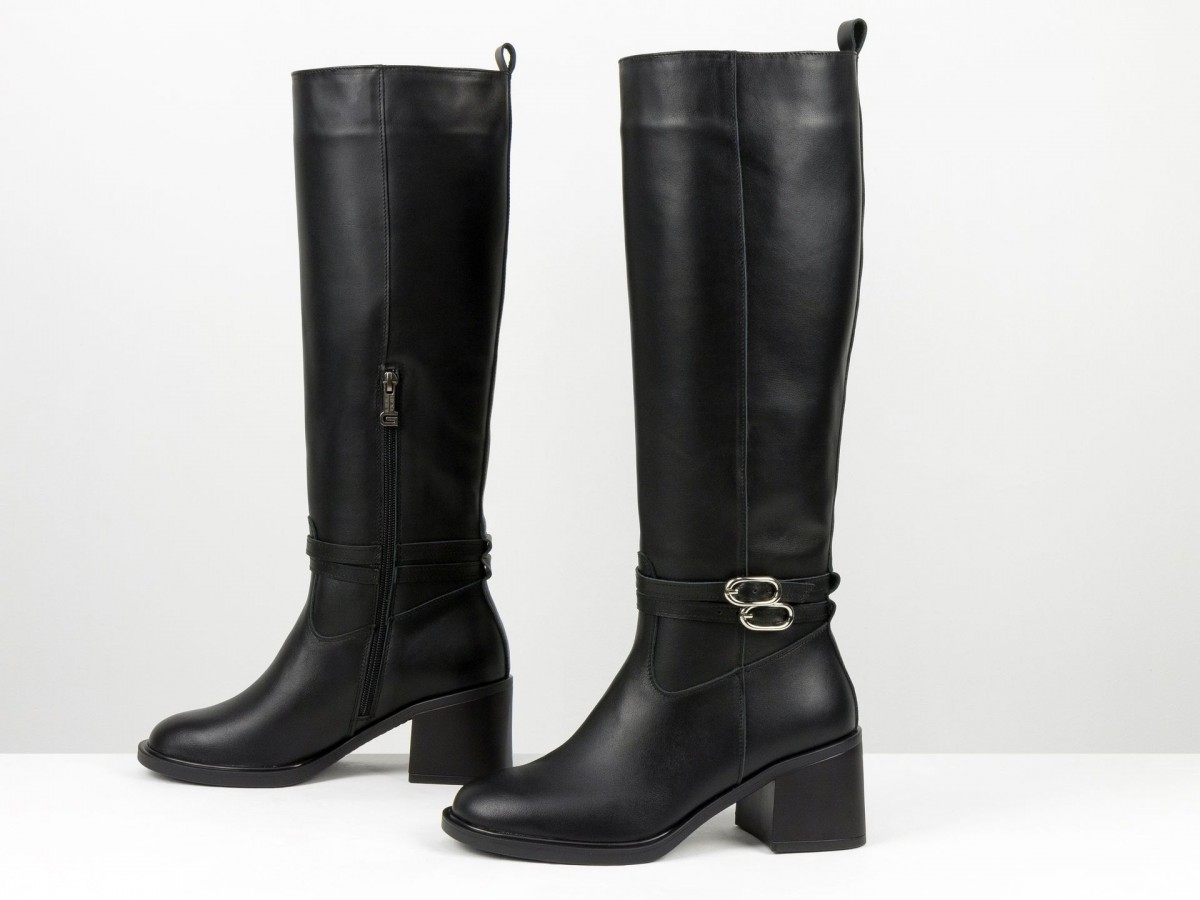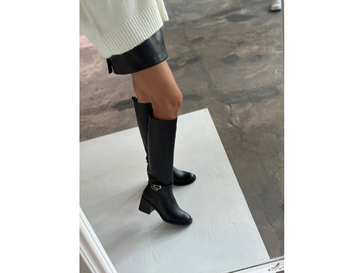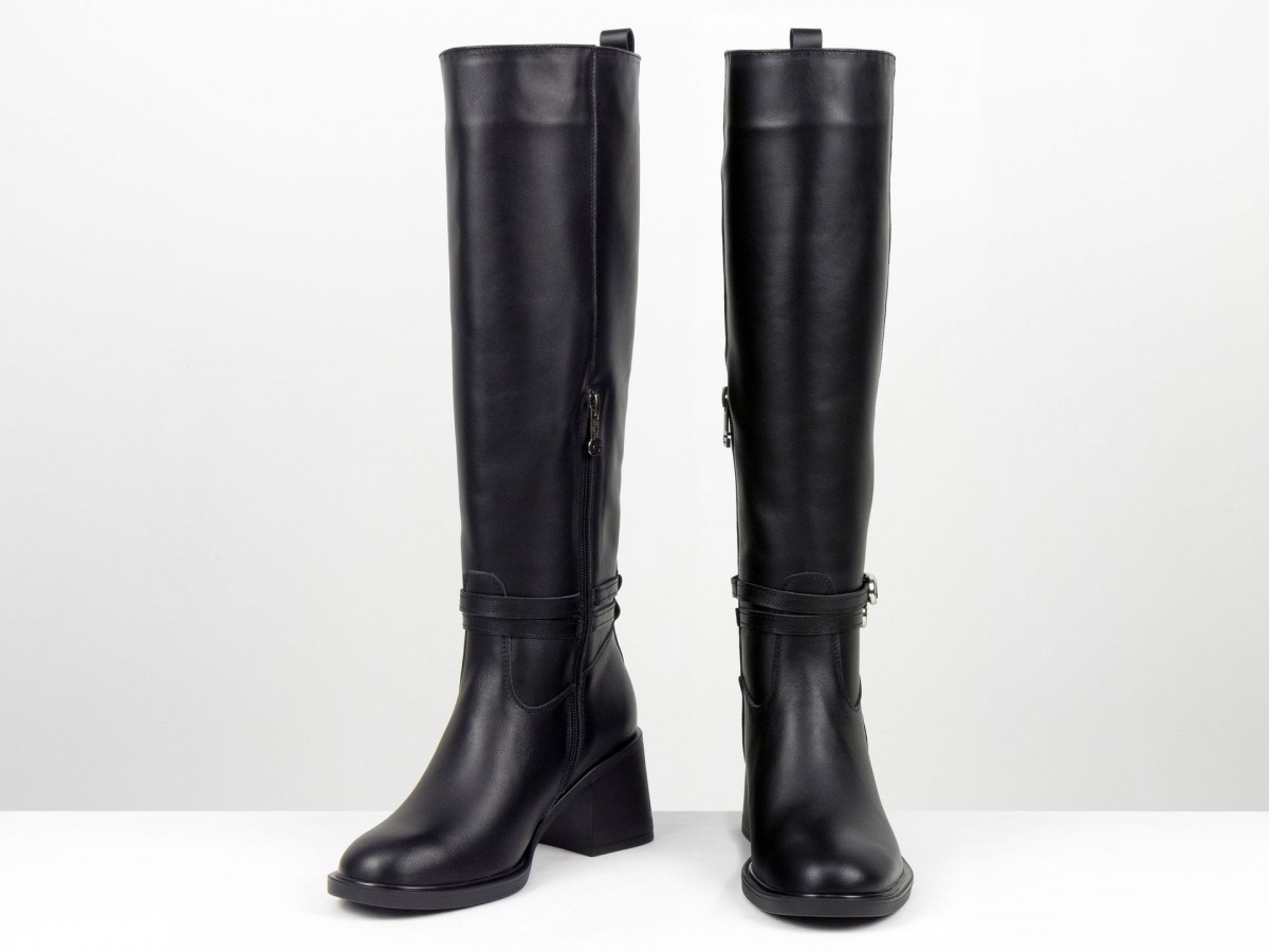 Жіночі чорні високі чоботи з натуральної шкіри - ідеальне поєднання класики та комфорту. Модель вирізняється стриманим, але водночас елегантним дизайном: гладка фактура шкіри, витончені шви та акцент у вигляді ремінця з металевою пряжкою додають стилю та завершеності образу.