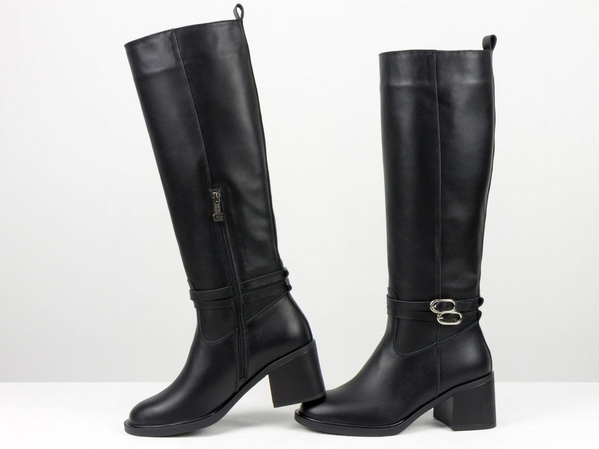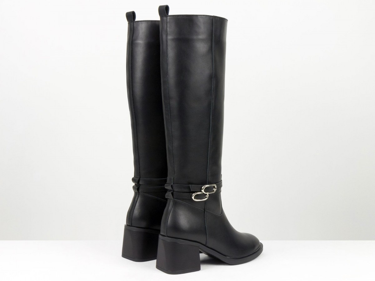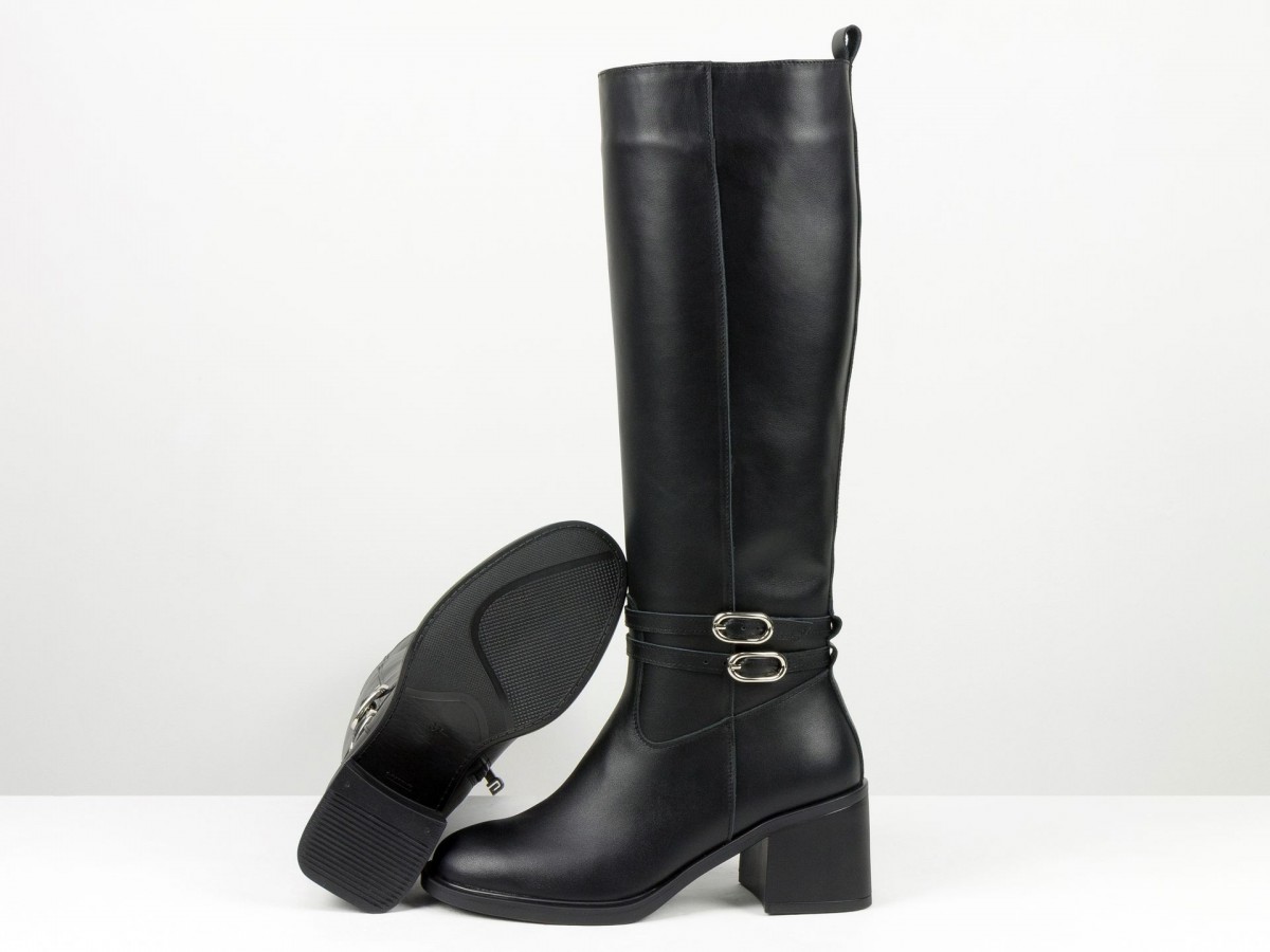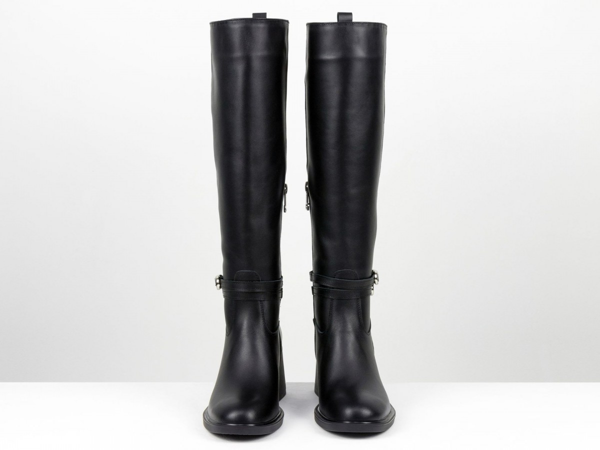 Жіночі чорні високі чоботи з натуральної шкіри - ідеальне поєднання класики та комфорту. Модель вирізняється стриманим, але водночас елегантним дизайном: гладка фактура шкіри, витончені шви та акцент у вигляді ремінця з металевою пряжкою додають стилю та завершеності образу.