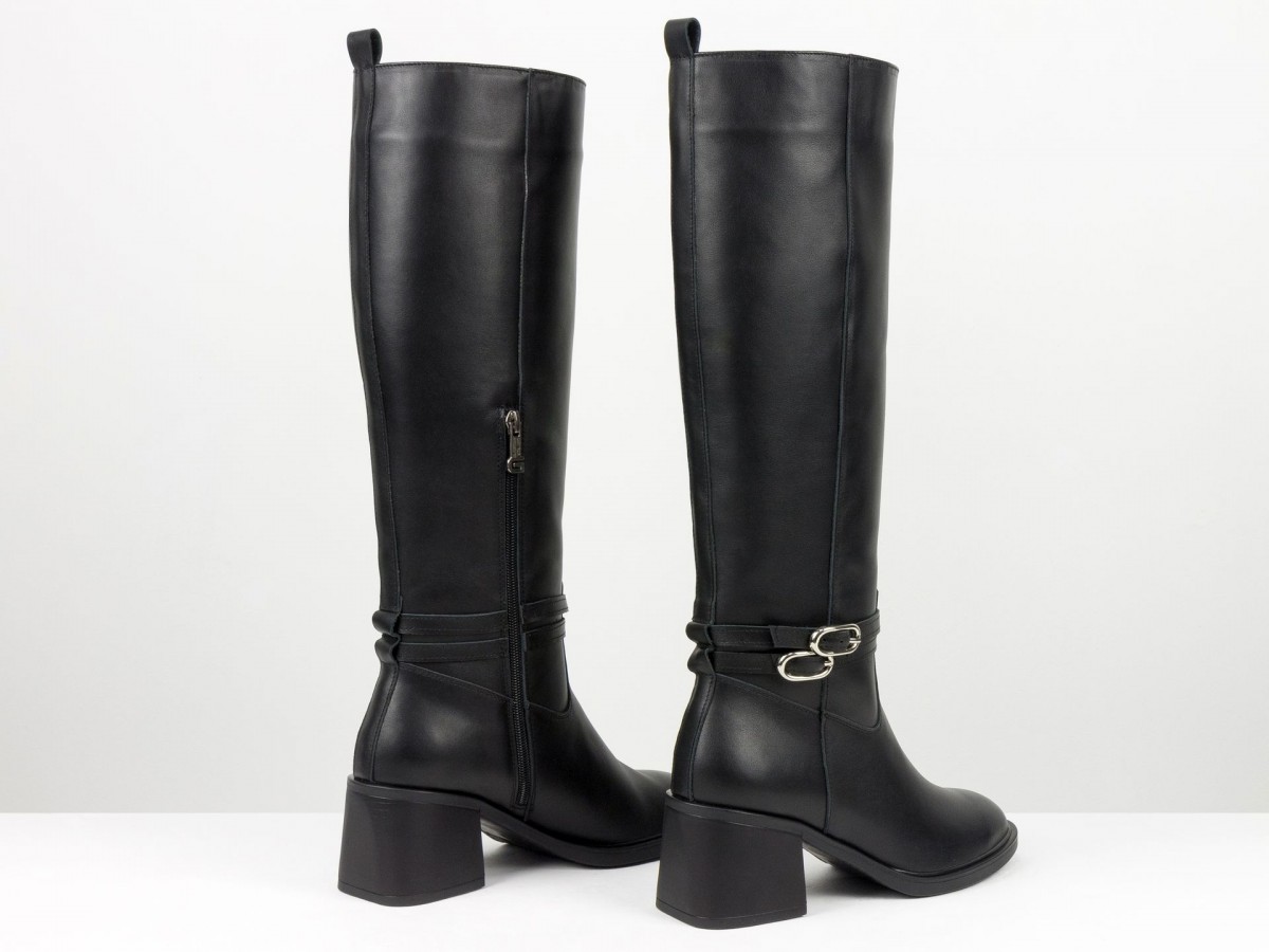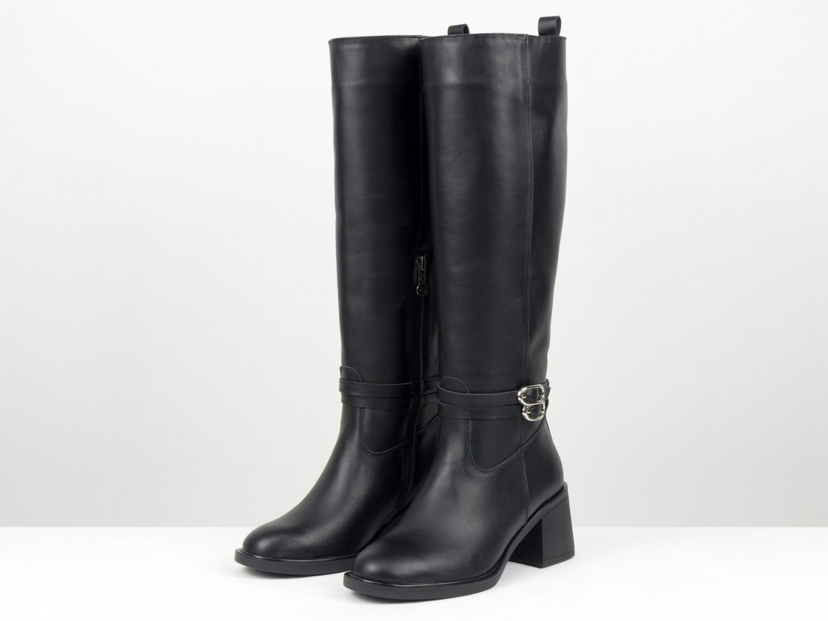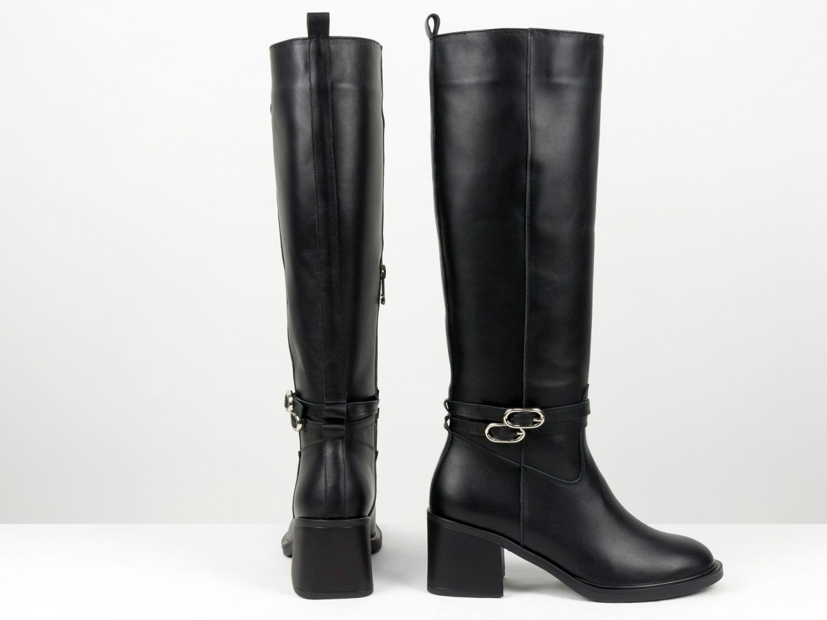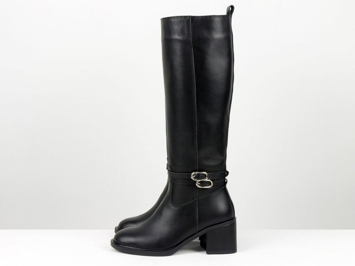 Жіночі чорні високі чоботи з натуральної шкіри - ідеальне поєднання класики та комфорту. Модель вирізняється стриманим, але водночас елегантним дизайном: гладка фактура шкіри, витончені шви та акцент у вигляді ремінця з металевою пряжкою додають стилю та завершеності образу.