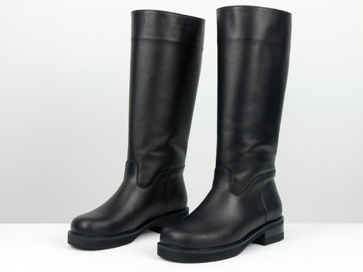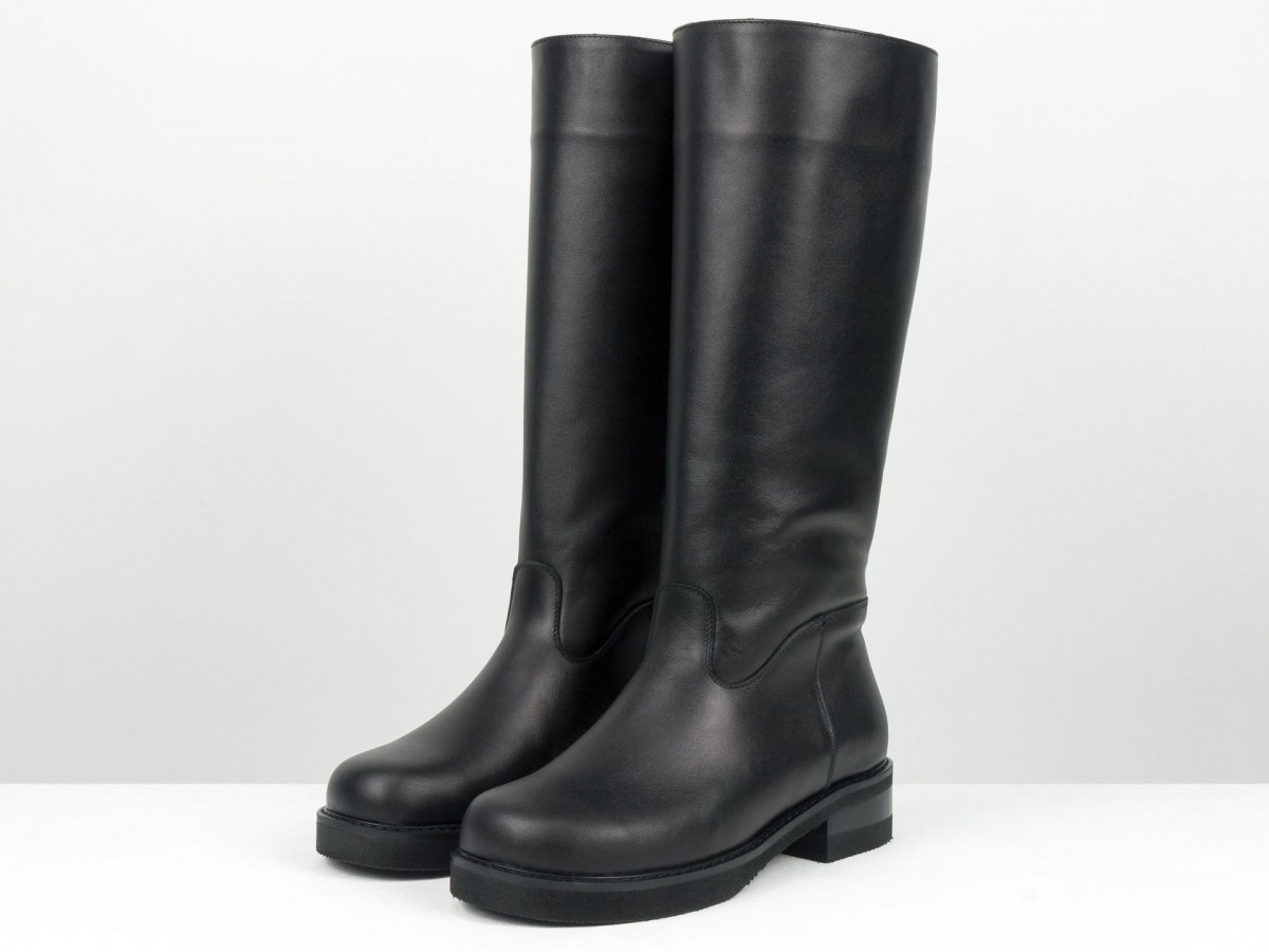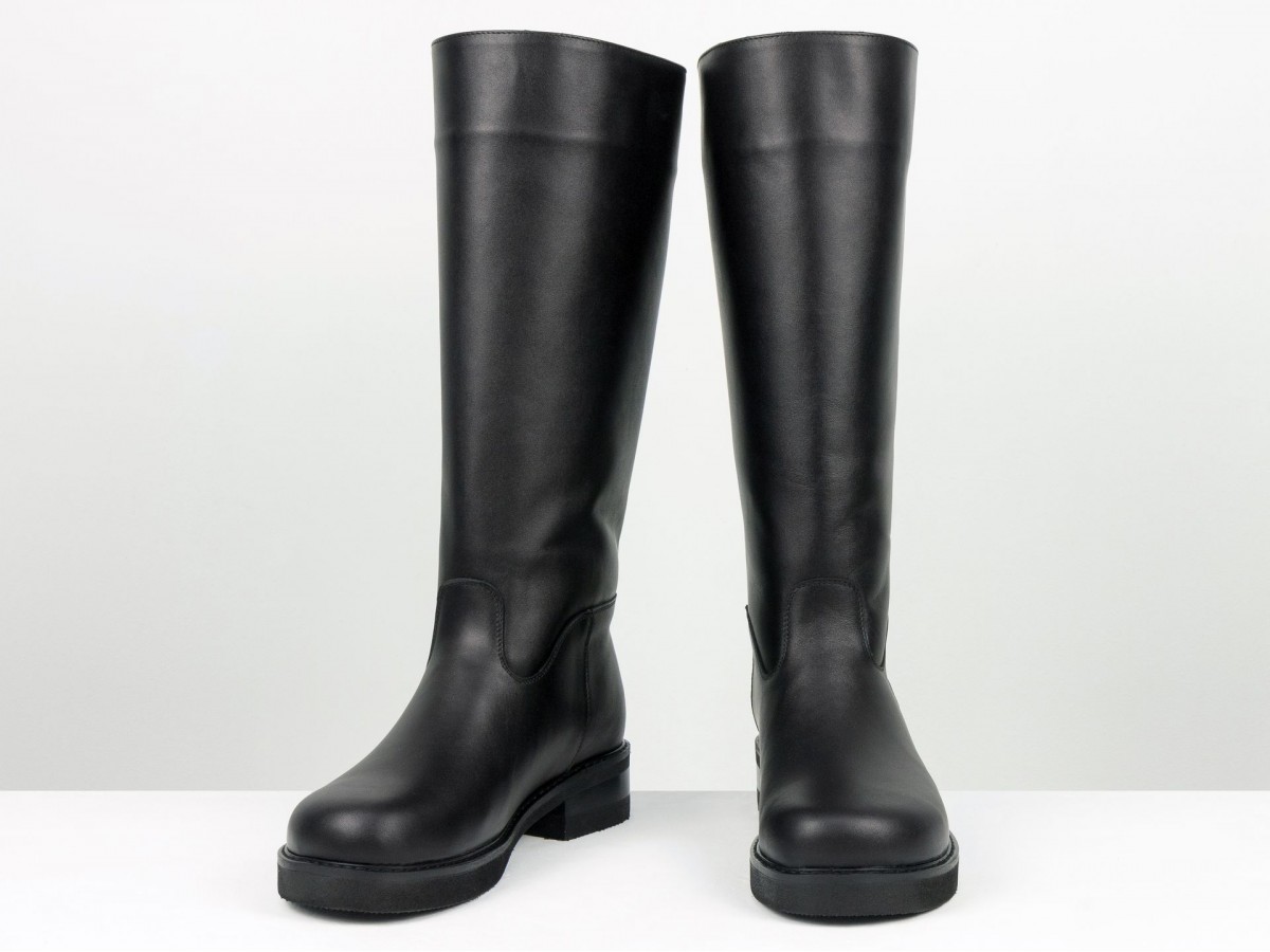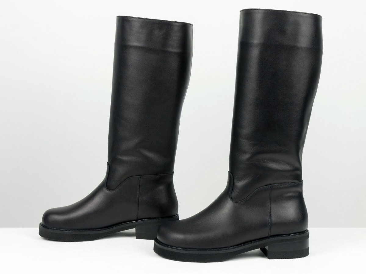 Класичні високі чоботи з натуральної гладкої шкіри - елегантна база осінньо-зимового гардероба. Лаконічний дизайн, без зайвих деталей, підкреслює вишуканість і дозволяє легко поєднувати модель як із сукнею чи спідницею, так і з вузькими джинсами або легінсами.