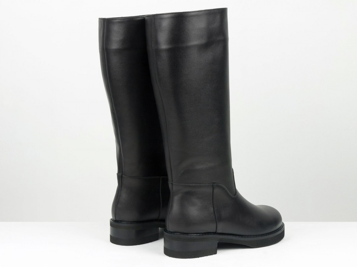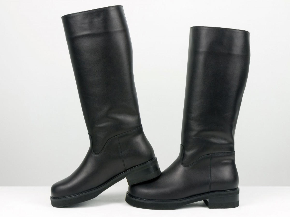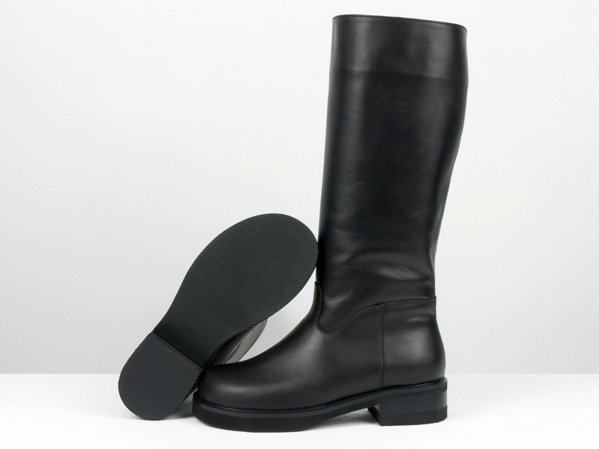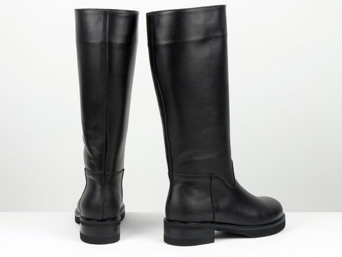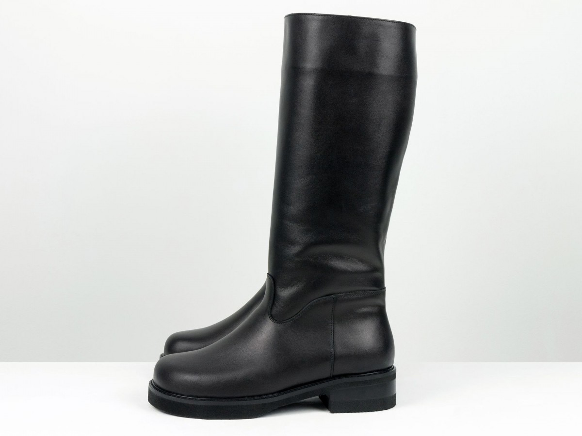 Класичні високі чоботи з натуральної гладкої шкіри - елегантна база осінньо-зимового гардероба. Лаконічний дизайн, без зайвих деталей, підкреслює вишуканість і дозволяє легко поєднувати модель як із сукнею чи спідницею, так і з вузькими джинсами або легінсами.